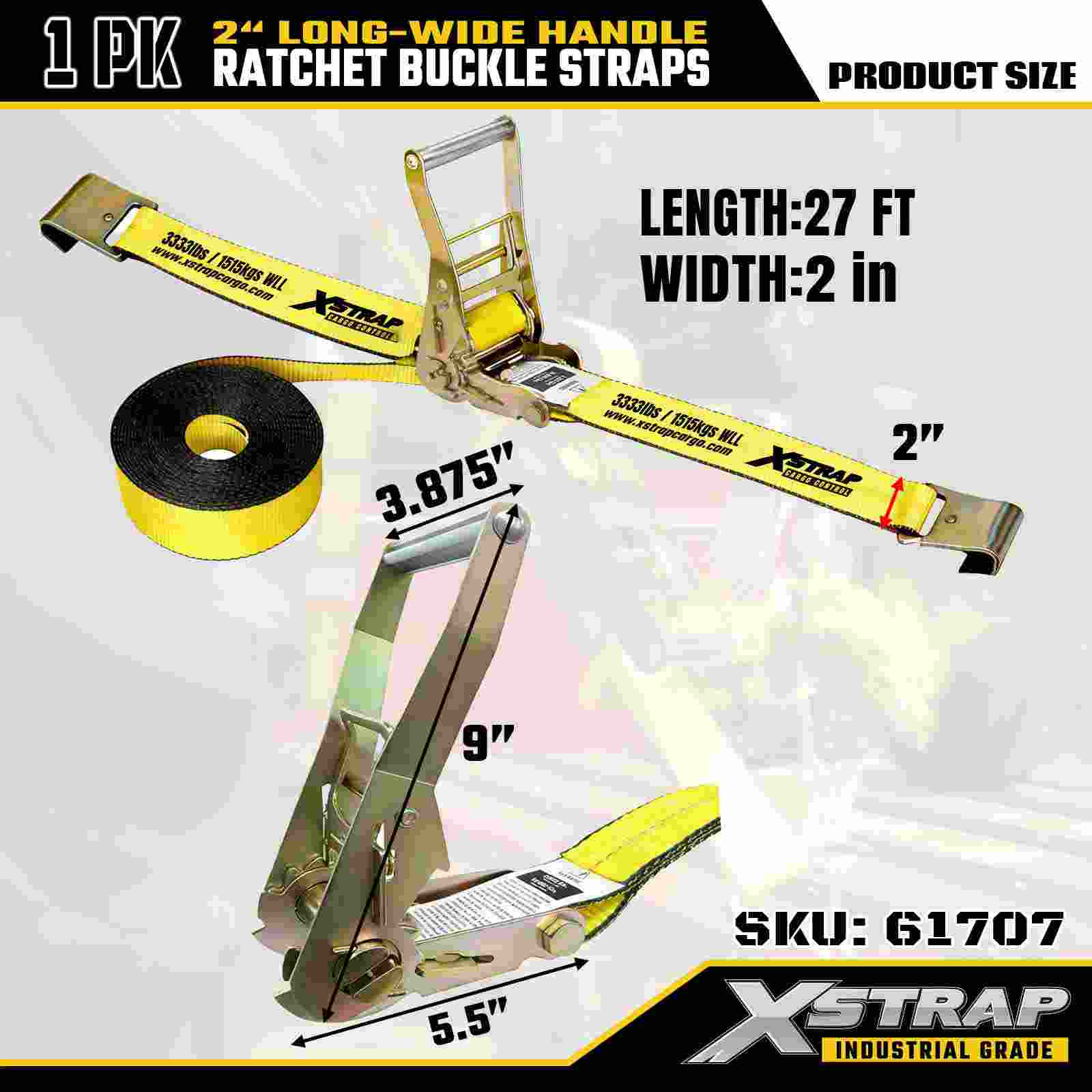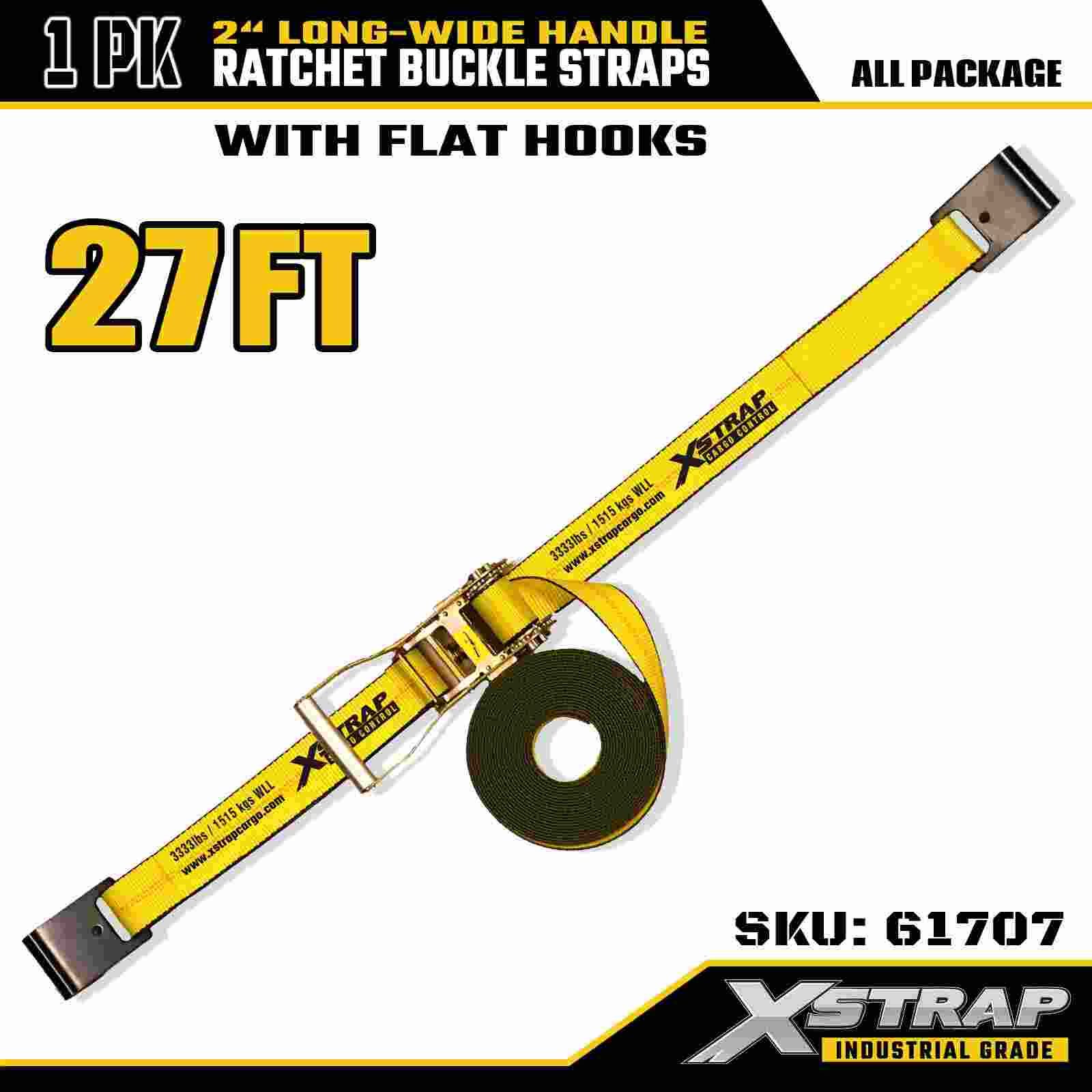 Xstrap 61707 Uzun Geniş Saplı Cırcır Kayışları 2" x 27ft (1'li Paket) - Düz Kancalar, 10.000 lbs Kopma Mukavemeti, Güvenli Taşıma için Ağır Hizmet Bağlama Kayışı
