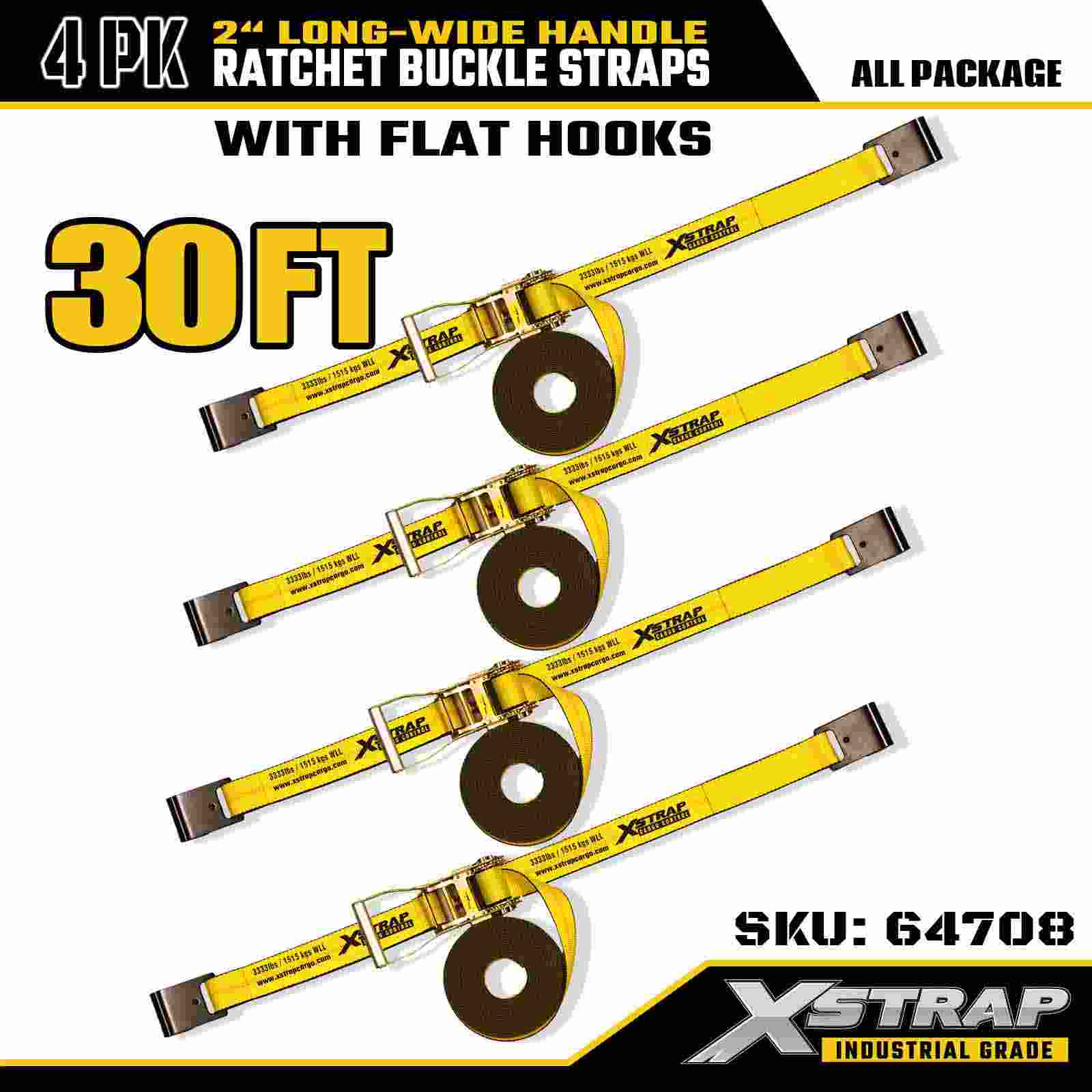 Xstrap 64708 2" x 30 ft Uzatılmış Saplı Cırcır Tokalı Kayışlar (4'lü Paket) – Düz Kancalar, 10.000 lbs Nominal Mukavemet, Endüstriyel Kargo Kontrol Çözümü
