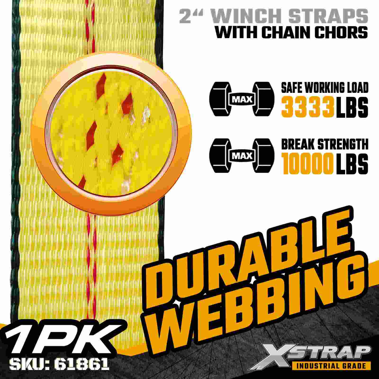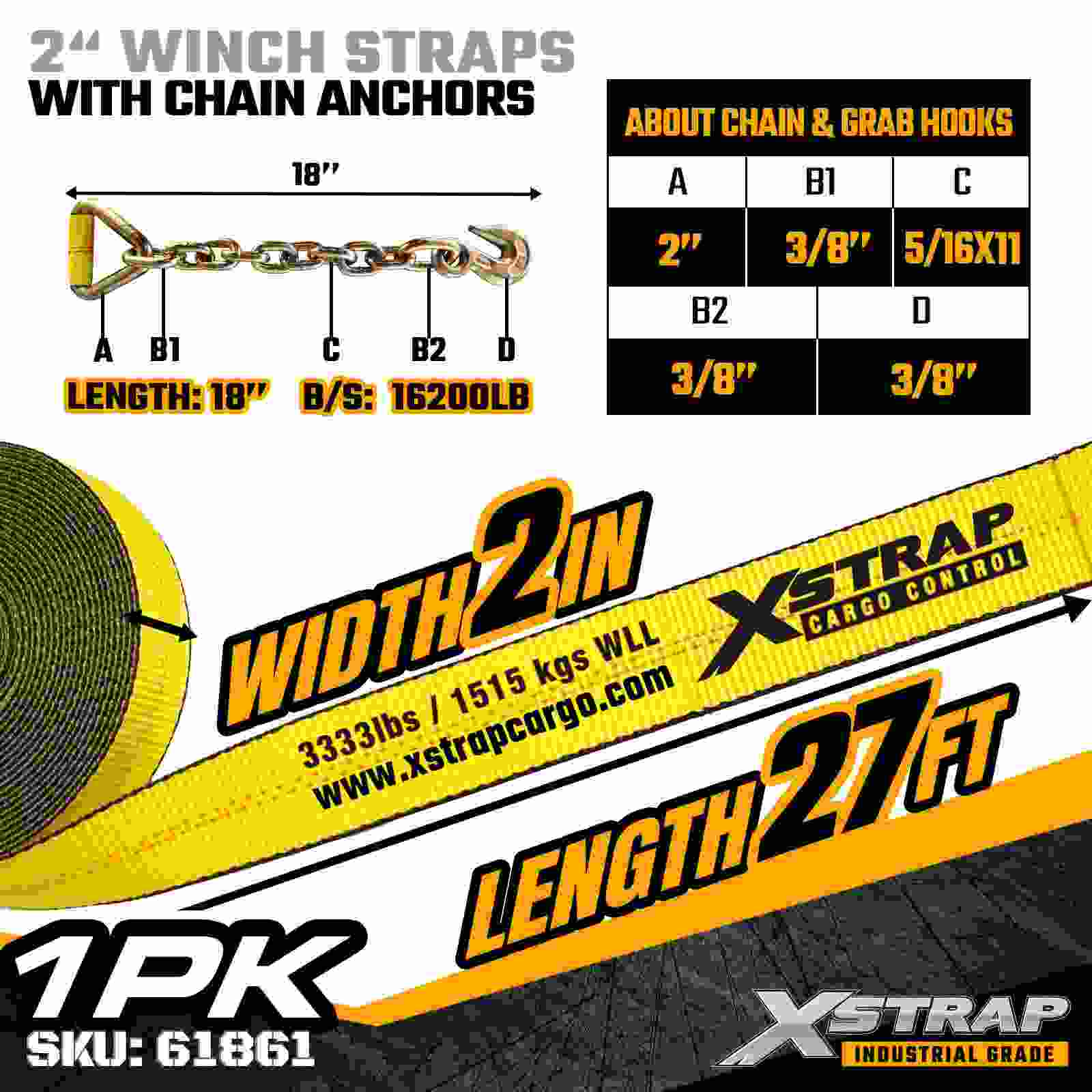 Xstrap 61861 2" × 27 ft Standart Vinç Kayışı, dayanıklı Zincir Ankrajları ve yüksek mukavemetli polyester dokuma içeren, güvenilir düz yataklı kargo güvenliği için üretilmiştir. 3.333 lbs Çalışma Yükü Sınırı ve 10.000 lbs Kopma Dayanımı ile günlük yük taşımacılığı, palet yükleri, kereste, borular ve genel lojistik uygulamaları için güvenilir performans sağlar.