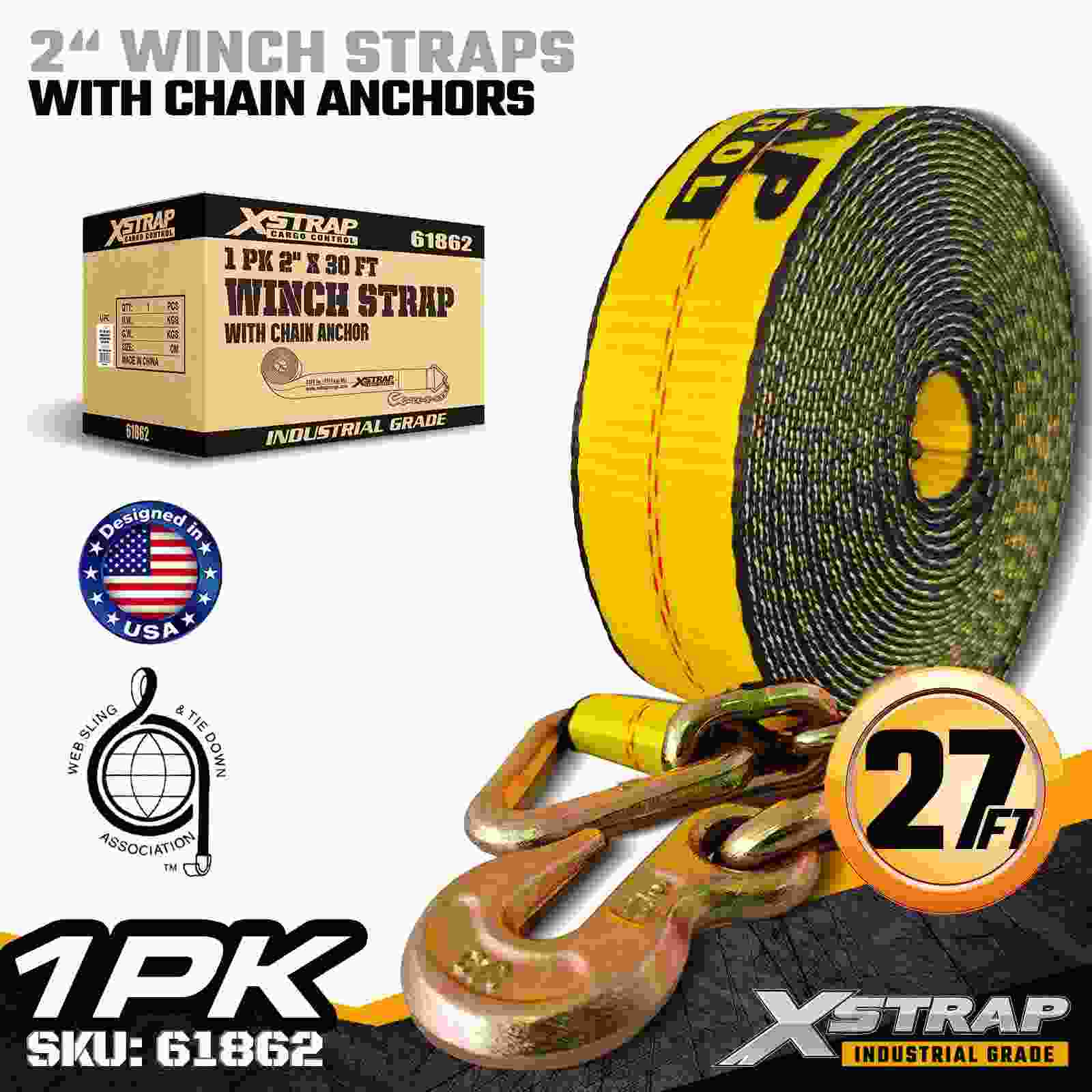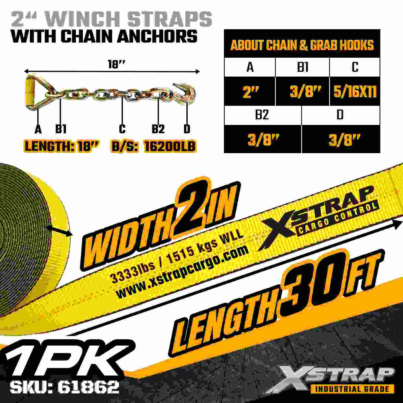 Xstrap 61862 2" × 30 ft Standart Vinç Kayışı, dayanıklı Zincir Ankrajları ve yüksek mukavemetli polyester dokuma içeren, güvenilir düz yataklı kargo güvenliği için üretilmiştir. 3.333 lbs Çalışma Yükü Sınırı ve 10.000 lbs Kopma Dayanımı ile günlük yük taşımacılığı, palet yükleri, kereste, borular ve genel lojistik uygulamaları için güvenilir performans sağlar.