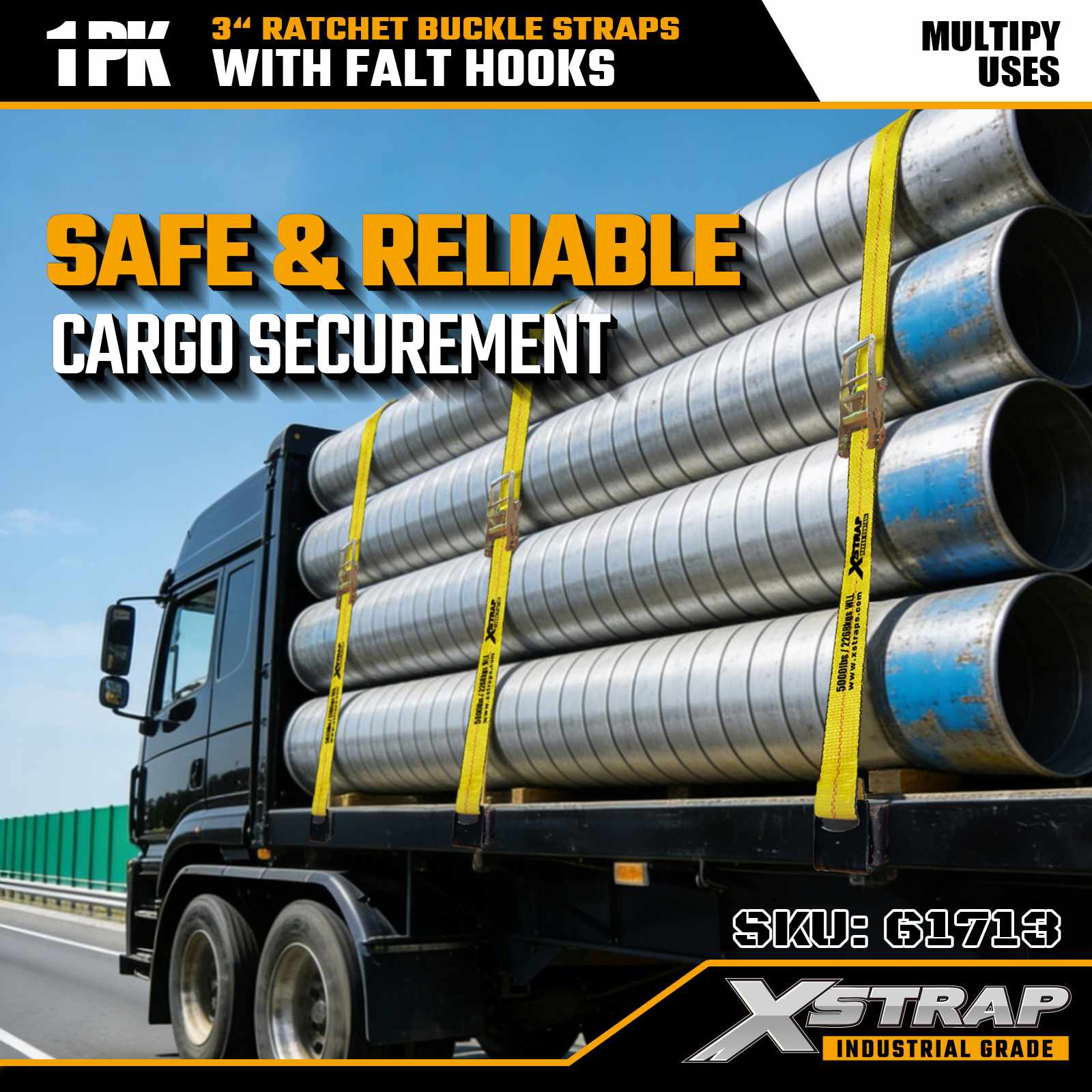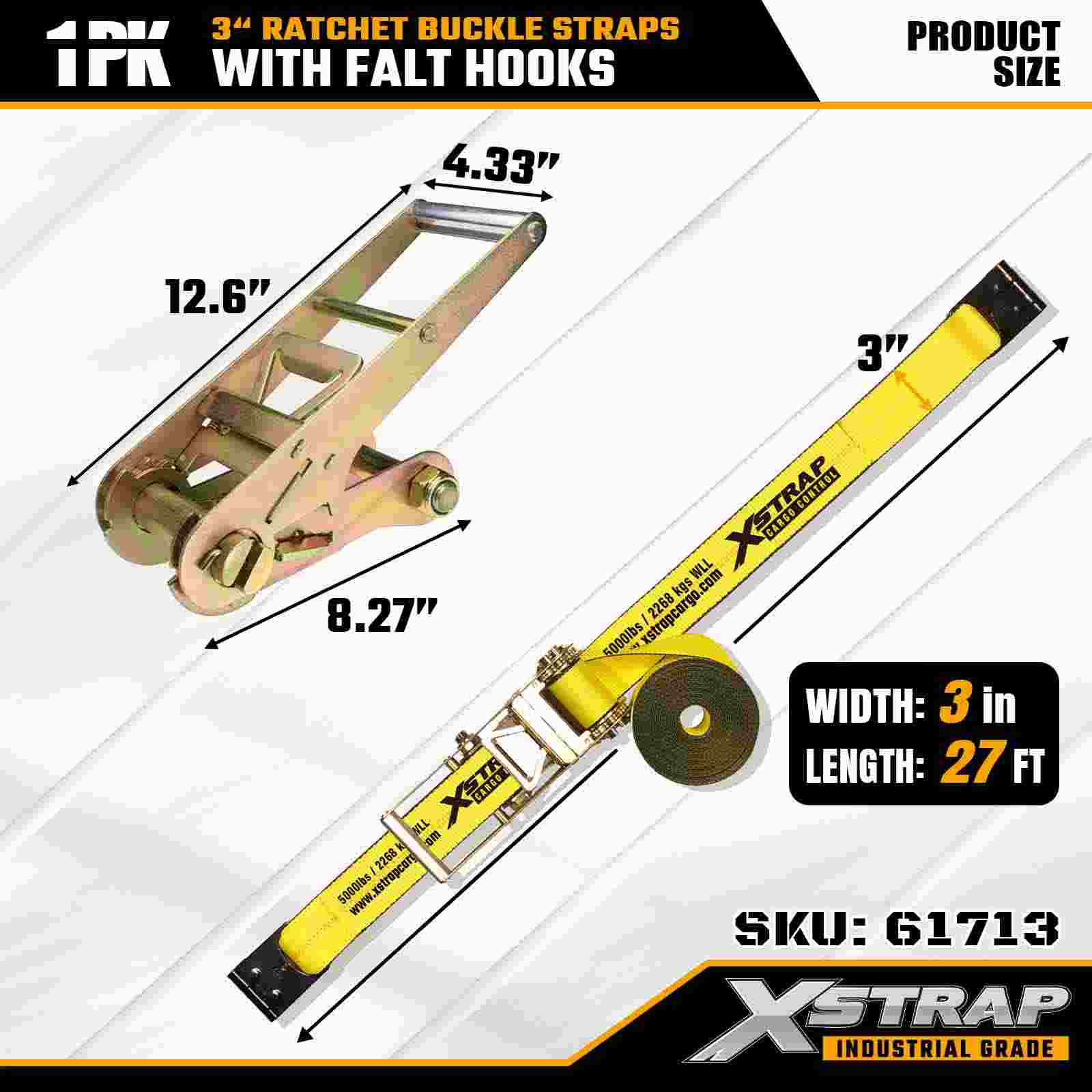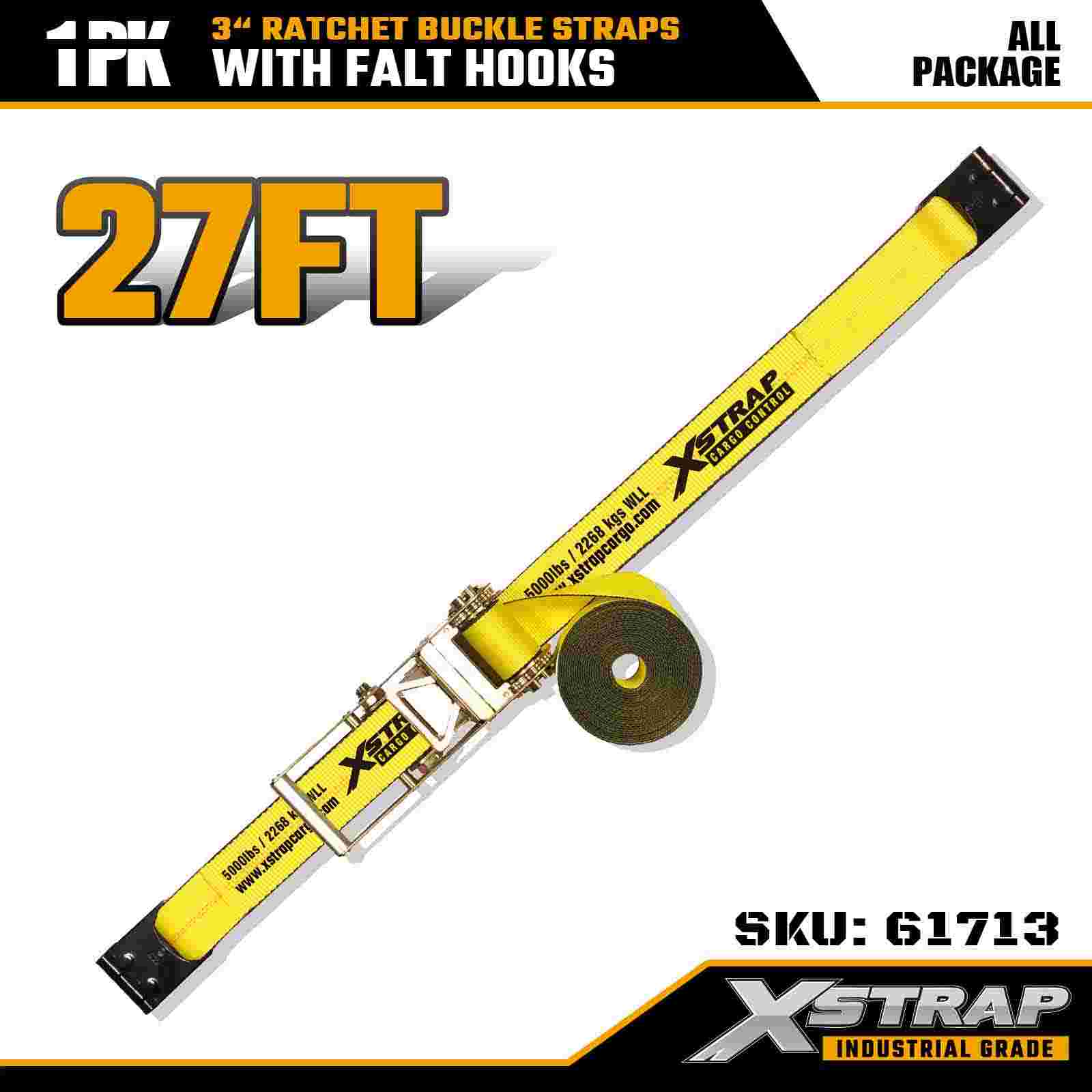 Xstrap 61713 3" x 27 ft Cırcırlı Tokalı Kayışlar (1 Paket) Düz Kancalar, 5.000 lbs Yük Kapasitesi 15.000 lbs Kırılma Mukavemeti, Kamyonlar, Römorklar ve Endüstriyel Kargo Taşımacılığı için Ağır Hizmet Tipi Bağlama.