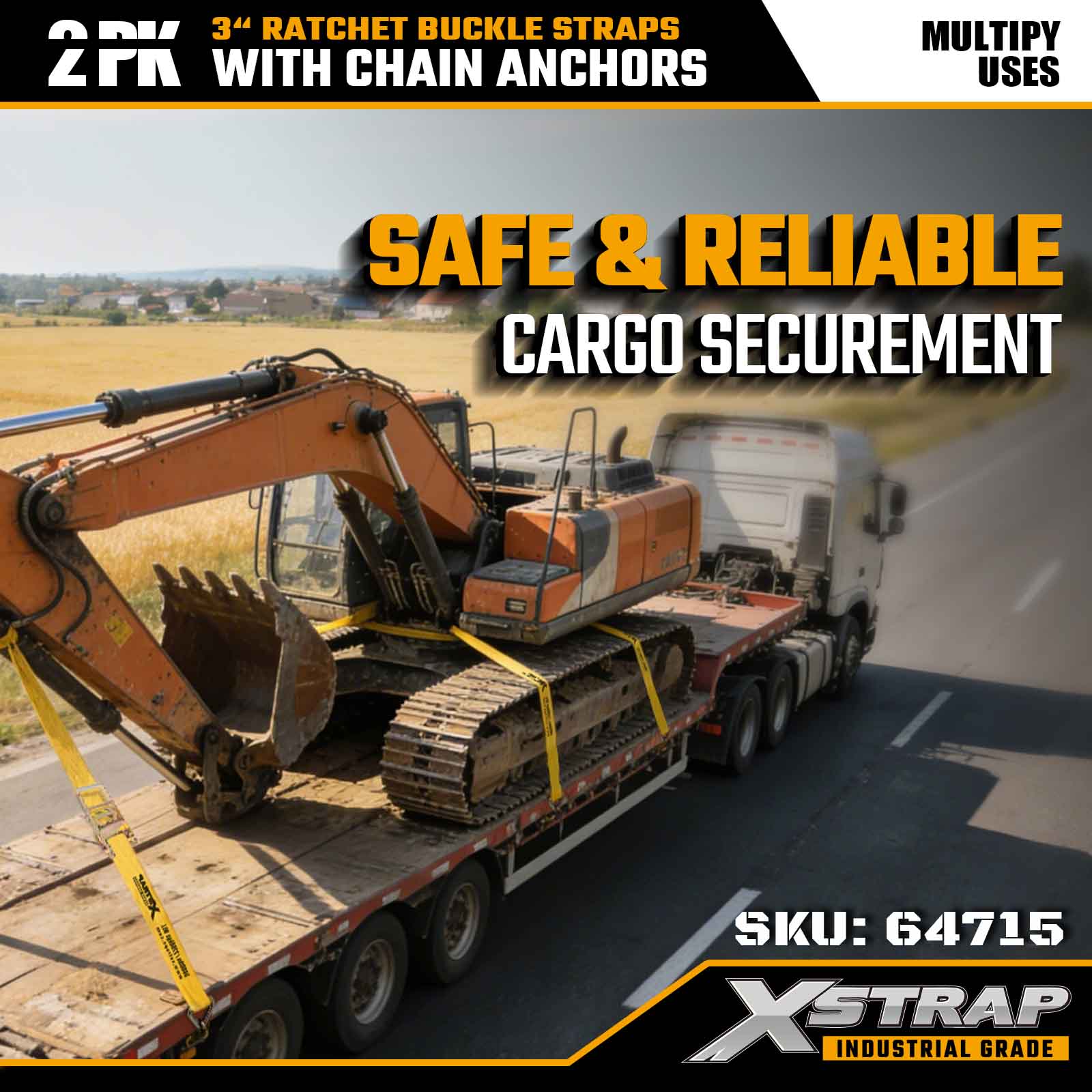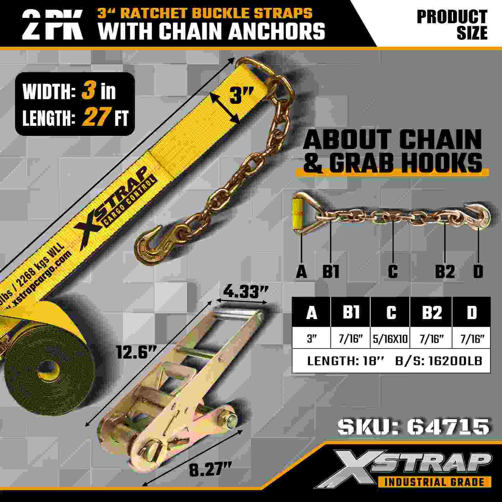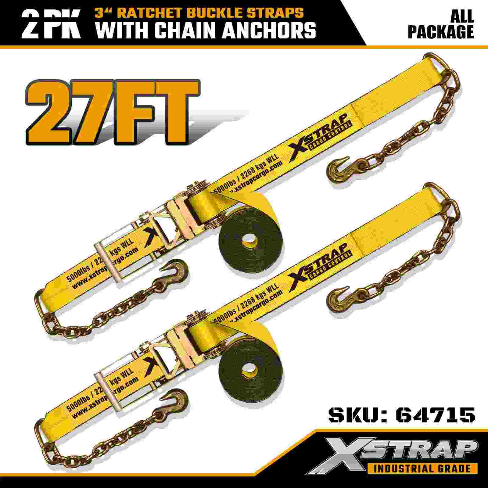 Xstrap 64715 3" × 27 ft Cırcırlı Tokalı Kayışlar (2'li Paket) – zorlu kargo ortamları için tasarlanmış, ağır hizmet tipi Zincir Ankrajlarıyla donatılmıştır. 5.000 lbs Çalışma Yükü Limiti ve 15.000 lbs Kopma Mukavemeti ile bu kayışlar düz yataklar, makine taşımacılığı ve endüstriyel taşıma için güvenli, sağlam ve profesyonel düzeyde bağlama performansı sunar.