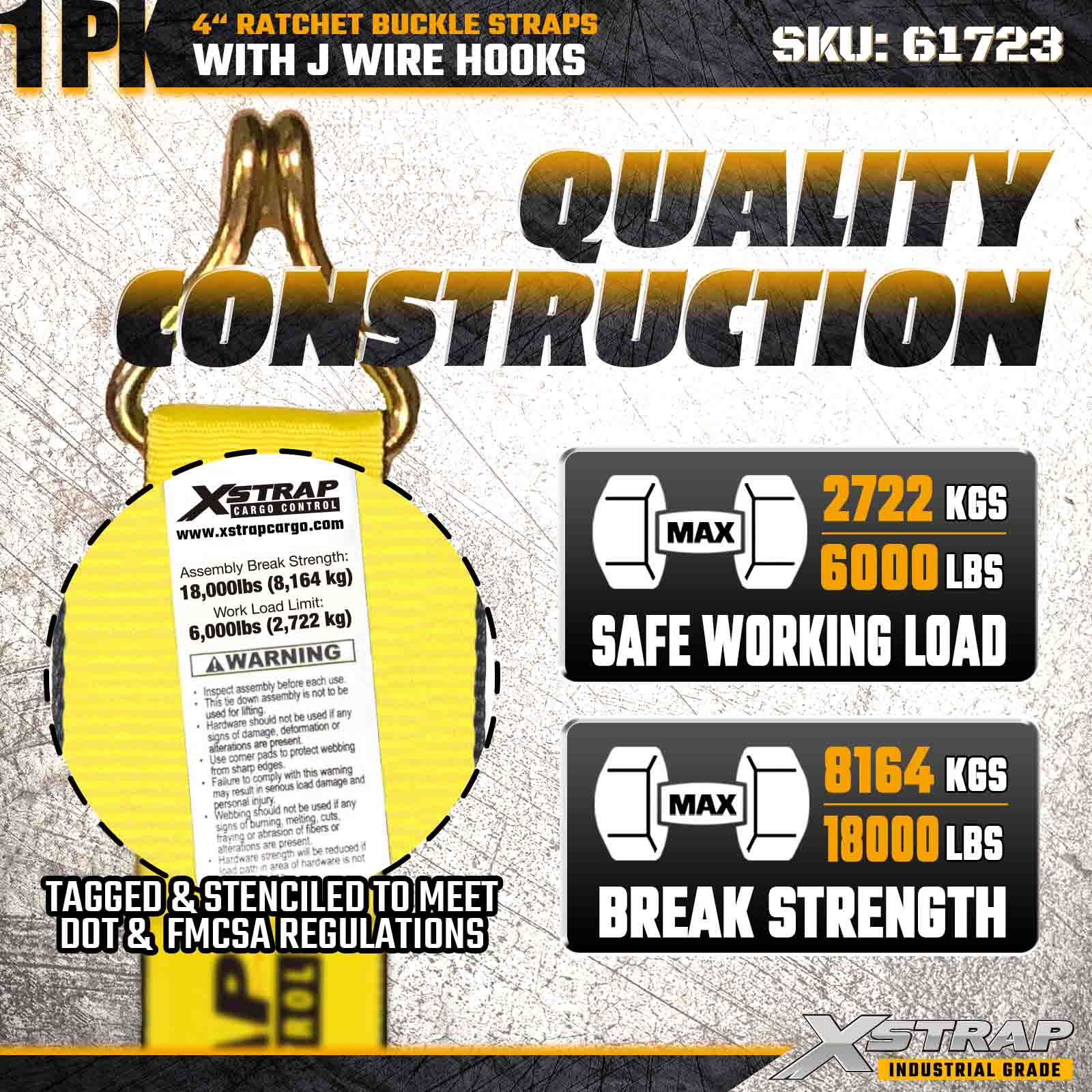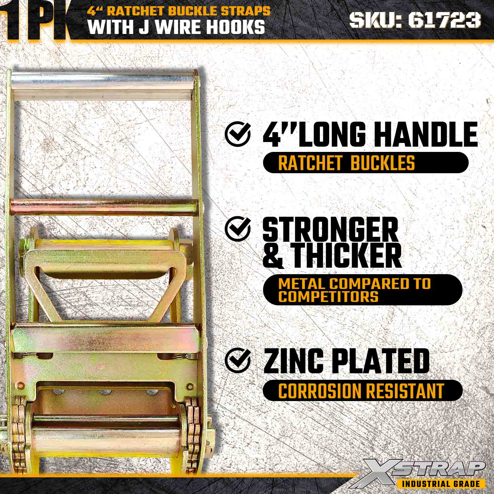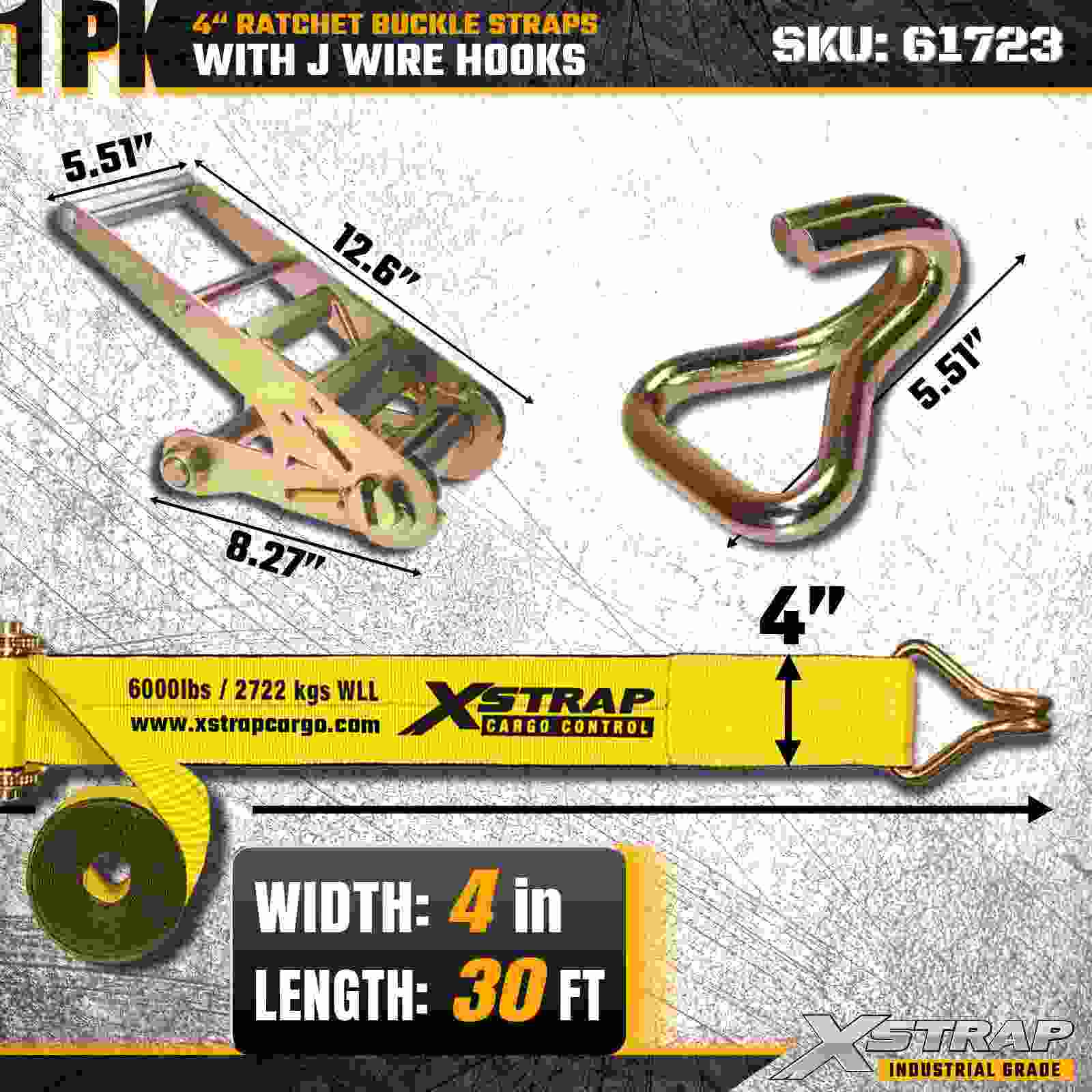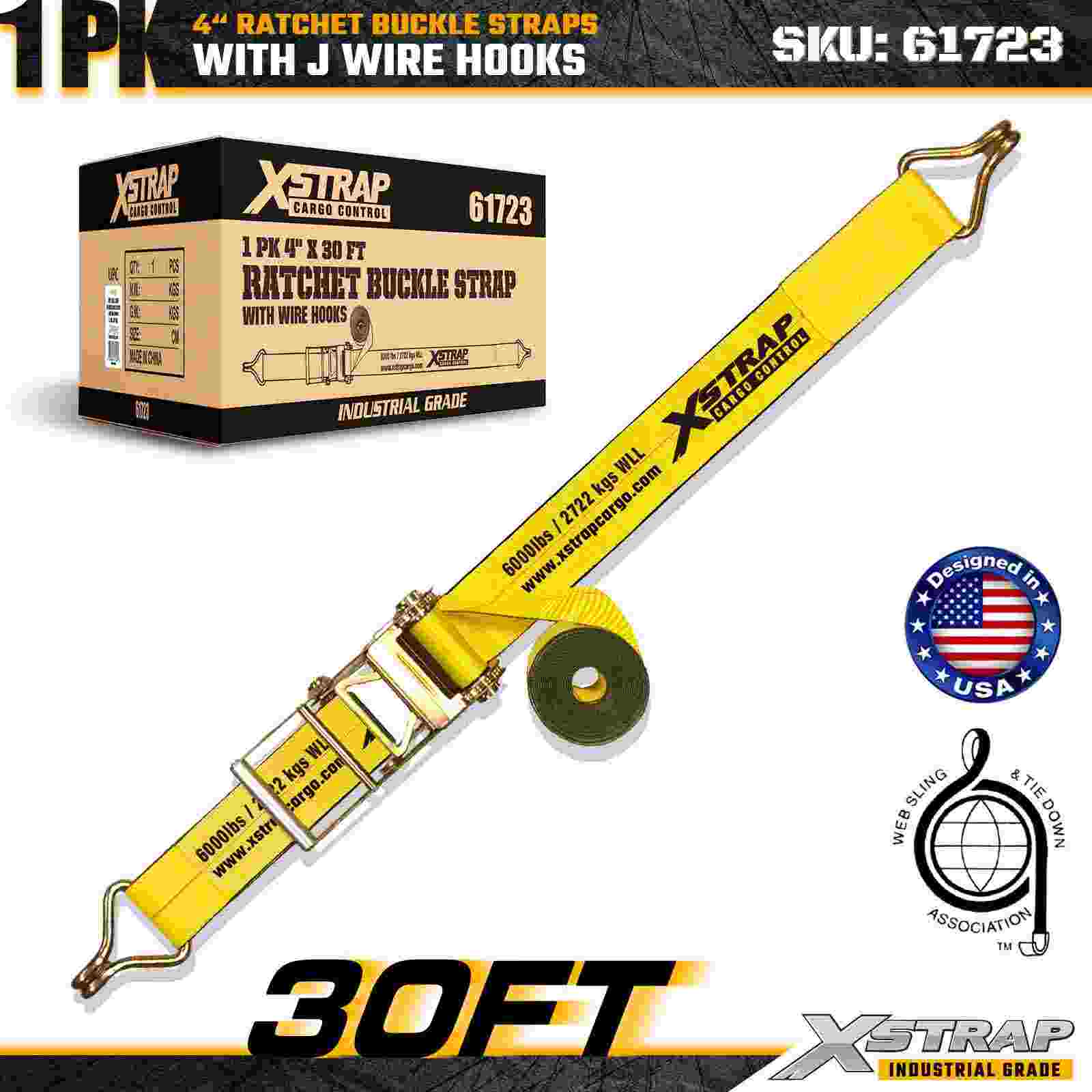 Xstrap 61723 4" × 30 ft Cırcırlı Toka Kayışı (1 Paket), güçlendirilmiş Tel Kancalara ve dayanıklı bir mandal mekanizmasına sahip, ağır hizmet tipi kargo güvenliği için üretilmiştir. 6.000 lbs Çalışma Yükü Limiti ve 18.000 lbs Kopma Dayanımı ile bu kayış, düz yataklı taşıma, makine taşımacılığı, kereste, çelik yükler ve endüstriyel kargo uygulamaları için idealdir.