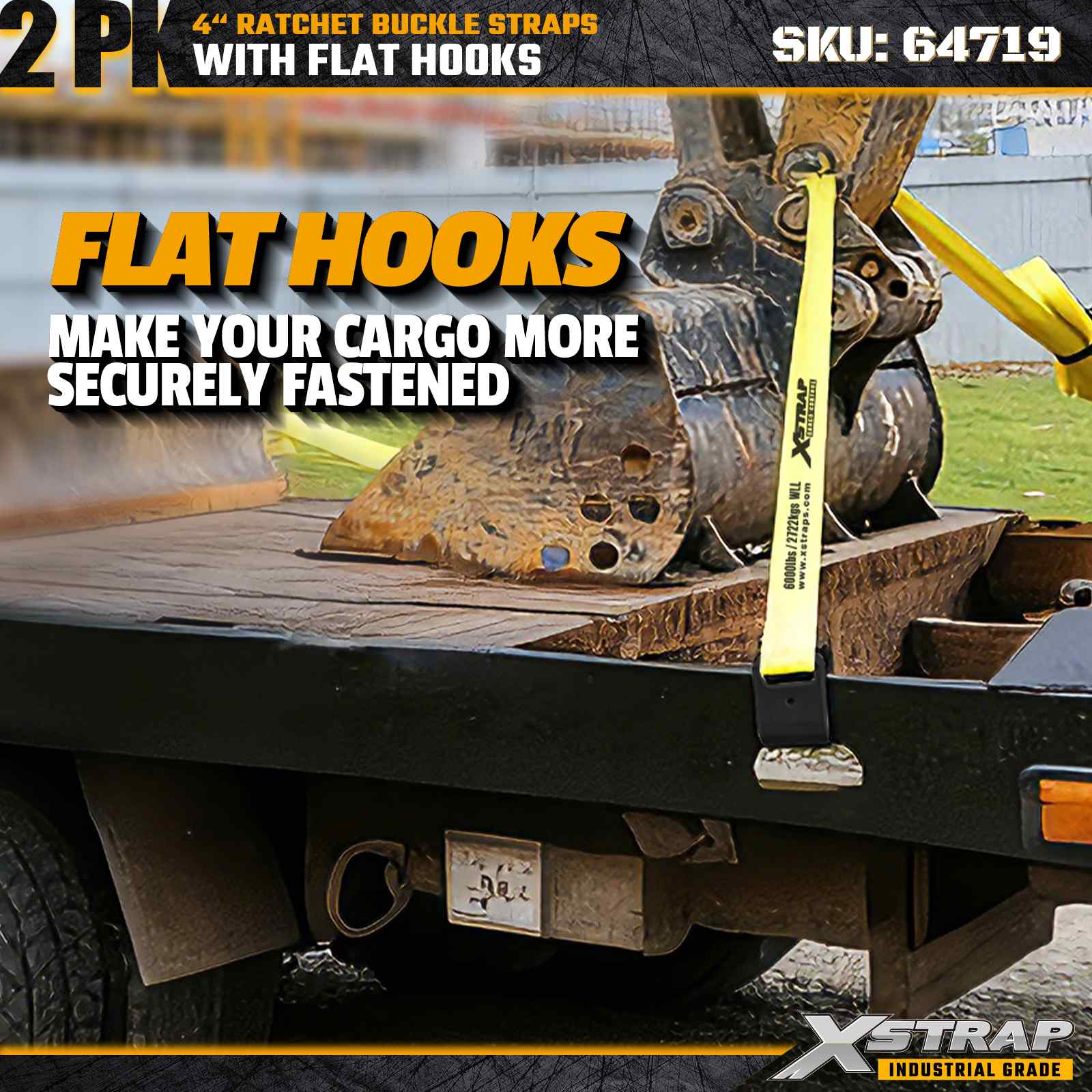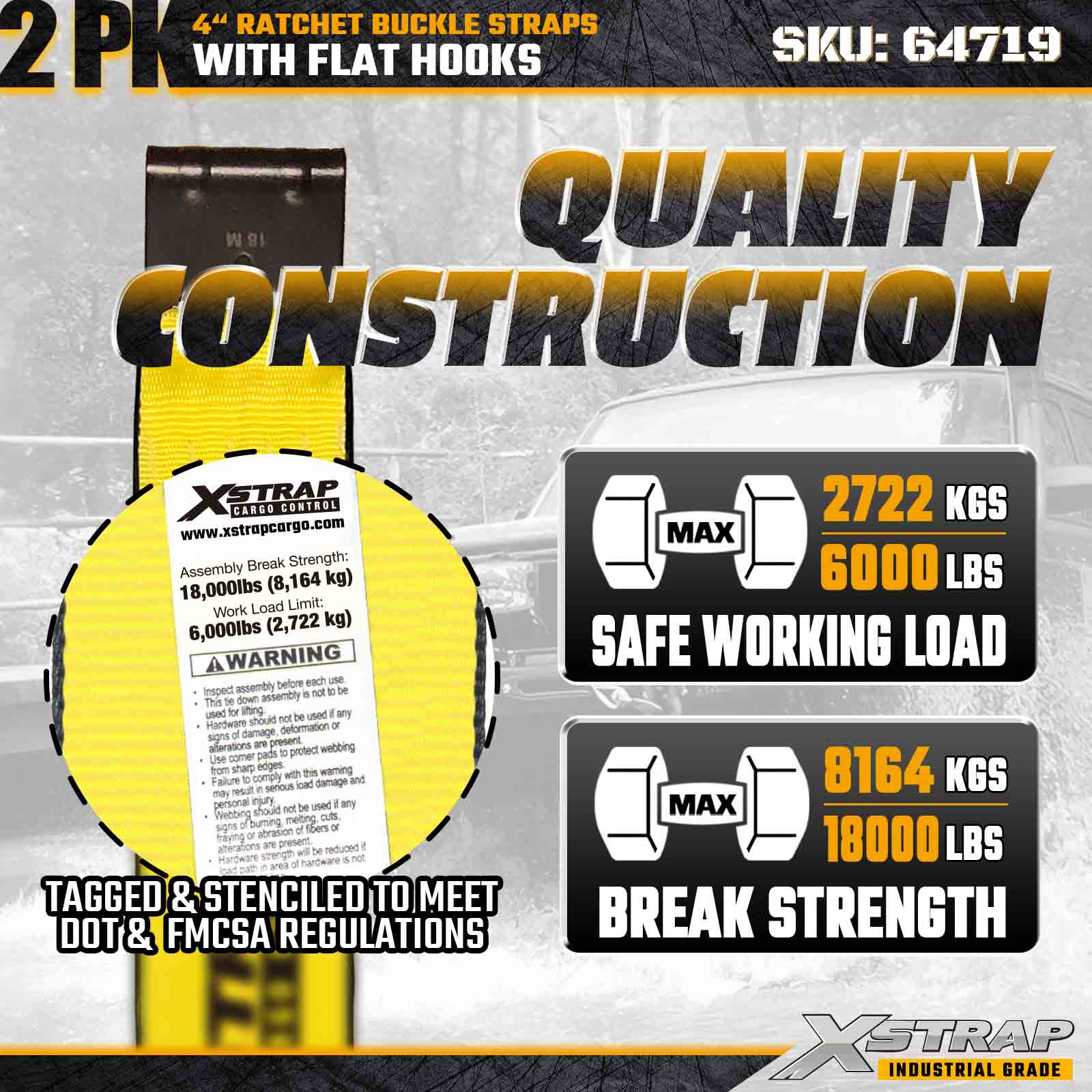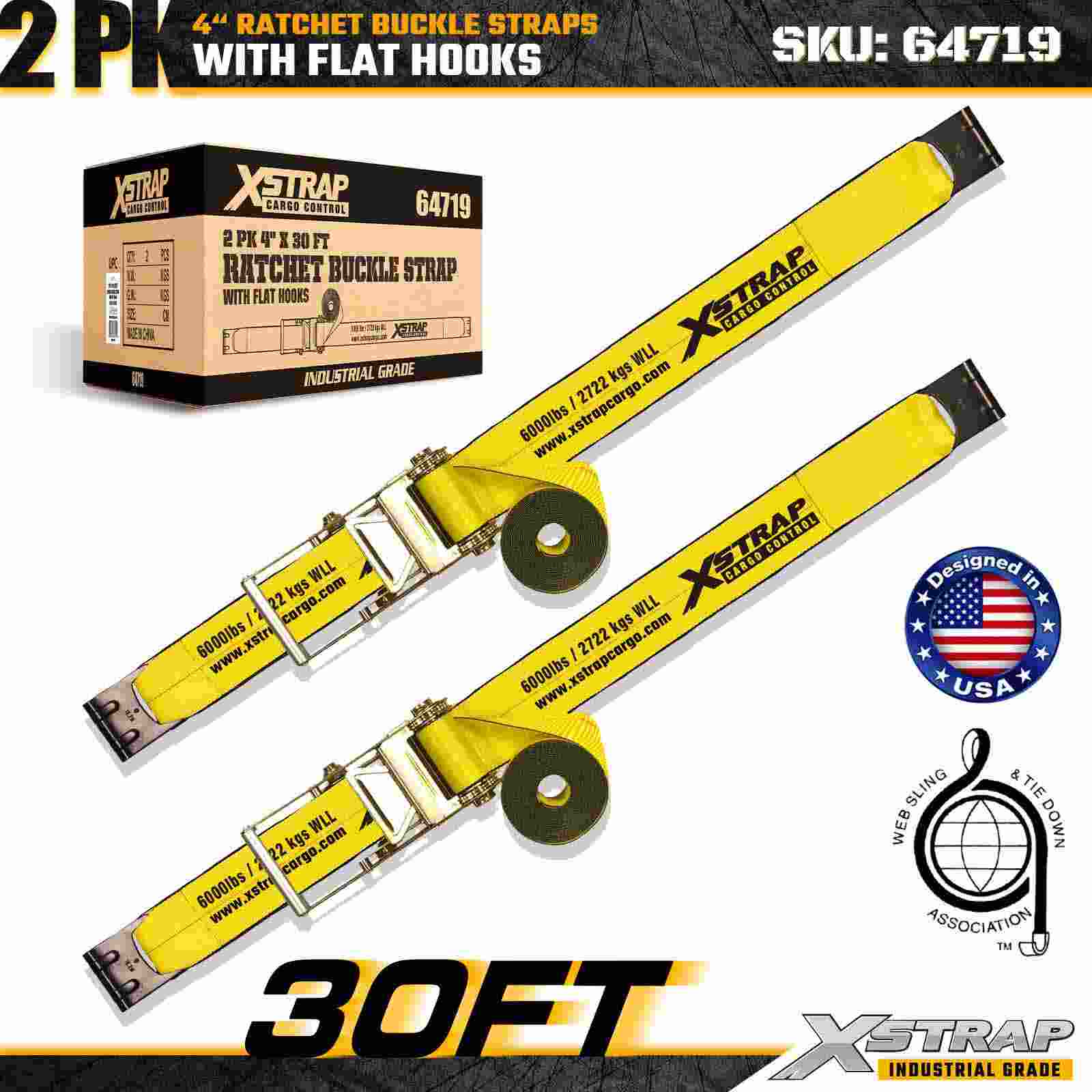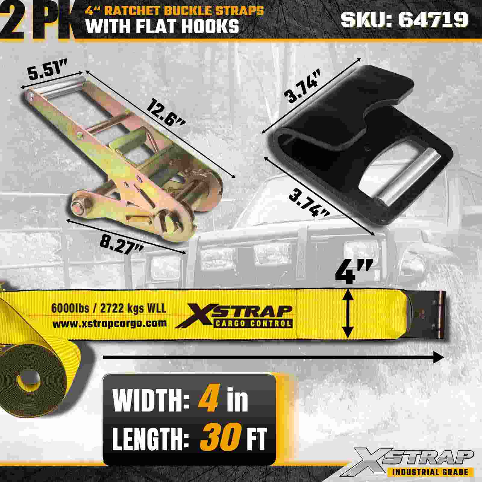 Xstrap 64719 4" × 30 ft Cırcır Tokalı Kayışlar (2'li Paket), güçlendirilmiş Düz Kancalar ve dayanıklı bir mandal mekanizmasıyla ağır hizmet tipi kargo güvenliği sağlar. 6.000 lbs WLL ve 18.000 lbs Kırılma Mukavemeti olarak derecelendirilmiş olan bu kayışlar, düz yataklı taşıma, makine taşımacılığı ve endüstriyel kargo uygulamaları için idealdir.