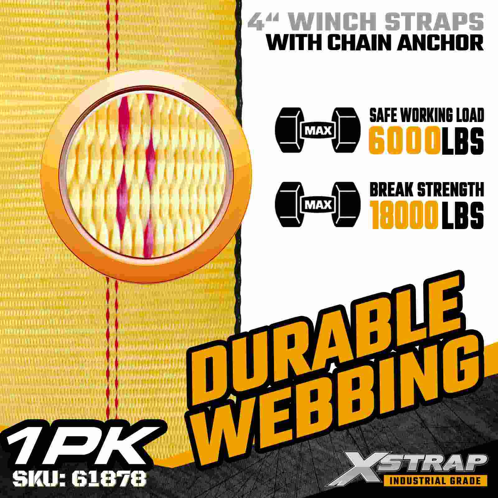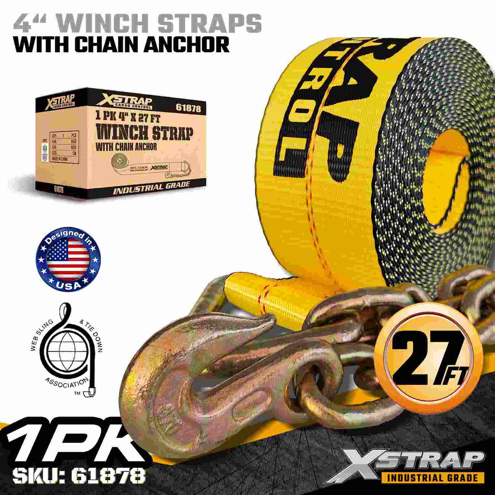 Xstrap 61878 4" × 27 ft Standart Vinç Kayışı, düz yataklı treylerler ve aşırı yük koşulları için tasarlanmış, ağır hizmet tipi bir endüstriyel kargo emniyet kayışıdır. Dövme Zincirli Ankraj ve ultra geniş 4 inç polyester dokuma içeren bu 4 inçlik vinç kayışı, 6.000 lbs Çalışma Yükü Limiti ve 18.000 lbs Kopma Mukavemeti sunar. Zincir Ankraj tasarımı, eşsiz kavrama ve dayanıklılık sağlayarak onu aşağıdakiler için idealdir: çelik, makine ve diğer yüksek gerilimli yüklerin güvenliğini sağlamak.