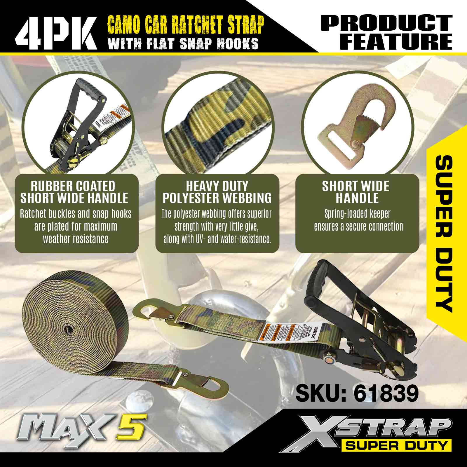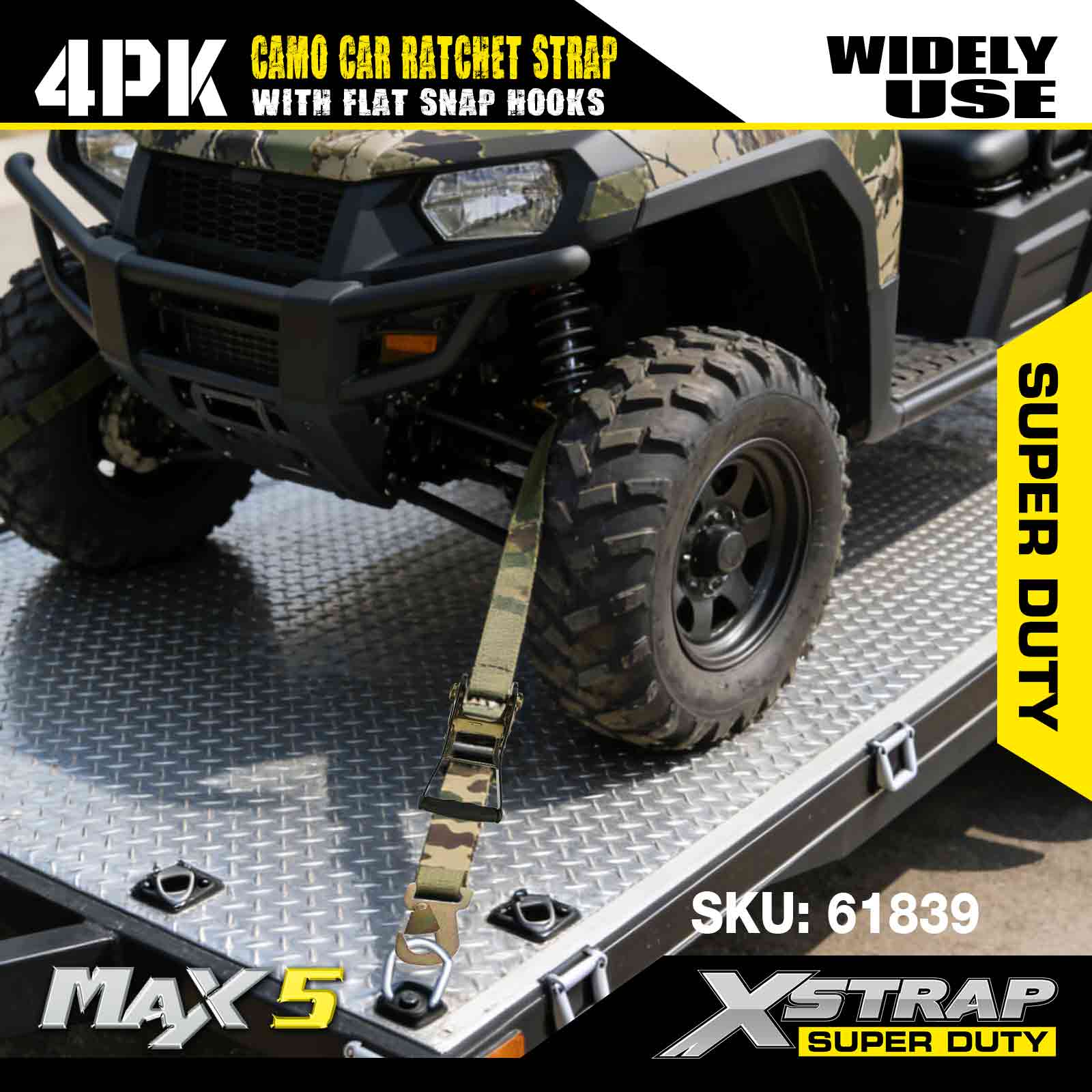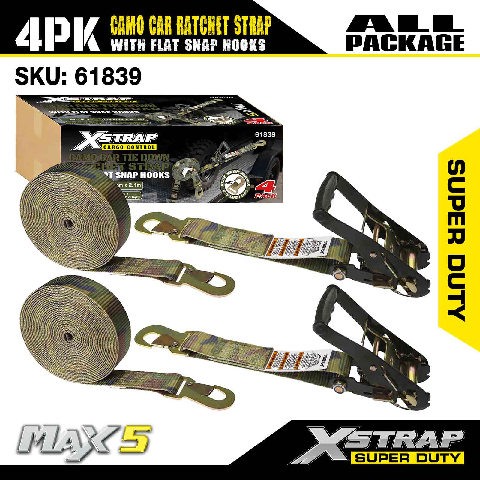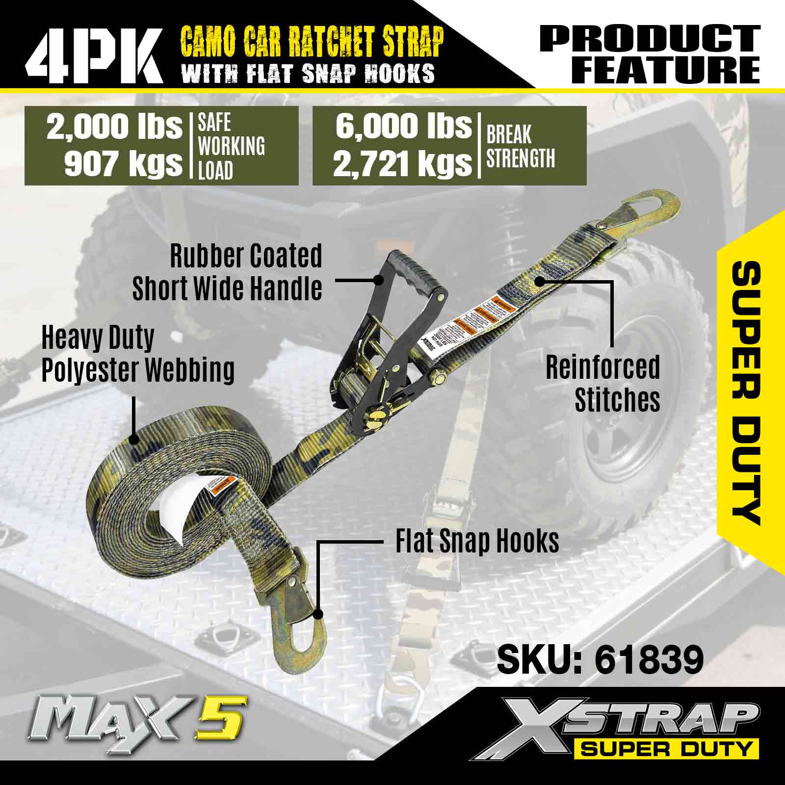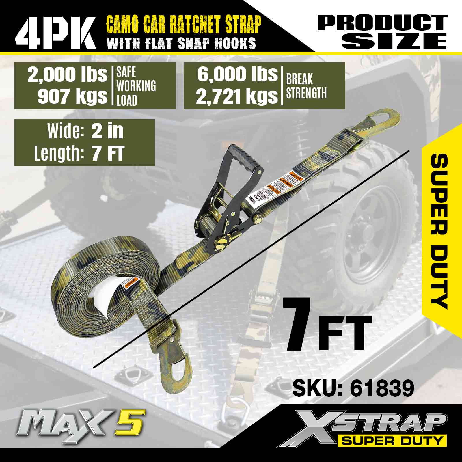 Xstrap Cargo Control Düz Kancalı Otomatik Cırcır Kayışları 2 İnç x 7 Ayak (4'lü Paket), 6.000 LBS Kırılma Mukavemeti, Düz Kilitleme Kancalı Çok Yönlü Cırcır Kayışları, Bağlama Arabaları, Motosikletler ve Diğer Araçlar