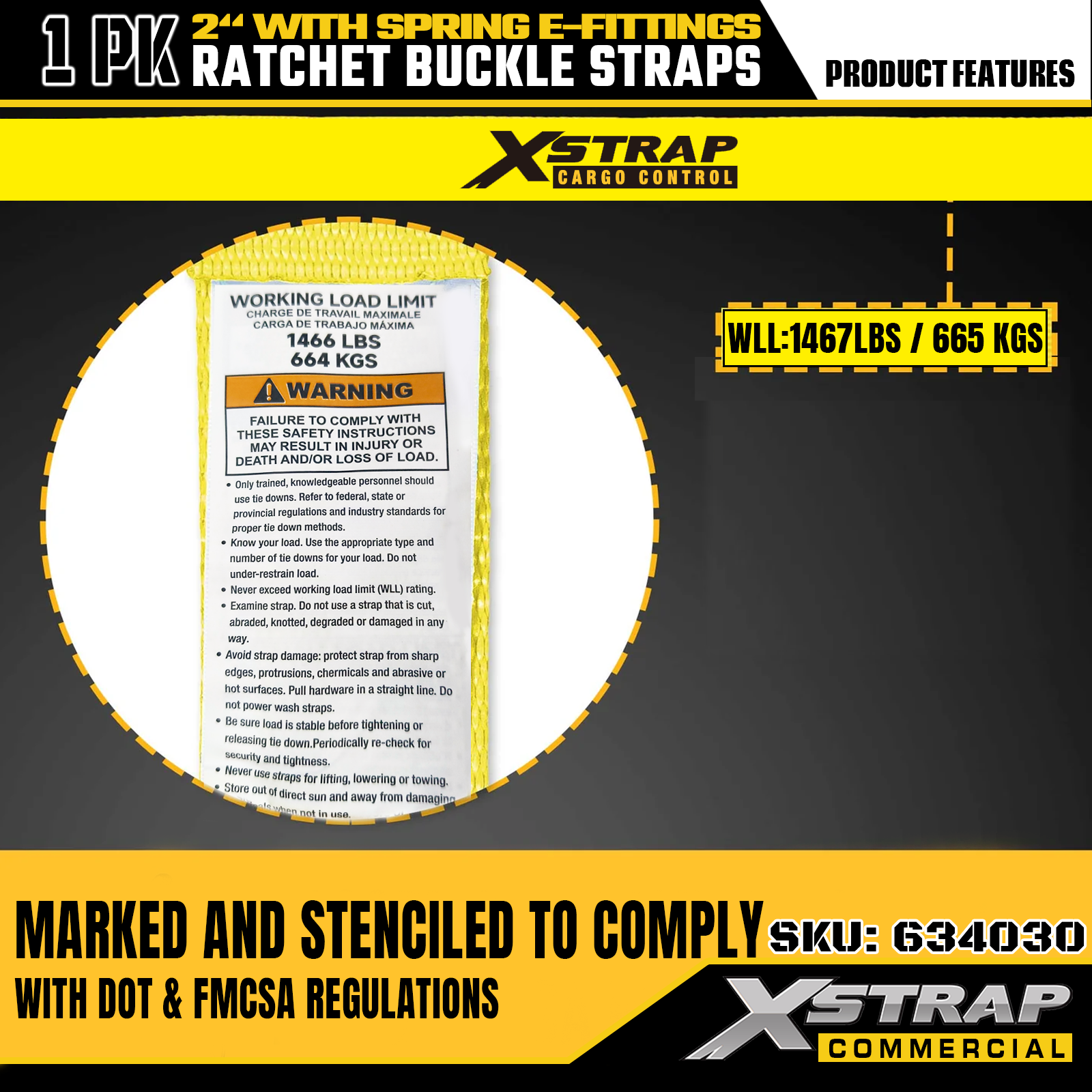 - Açık Güvenlik İşaretleri: Her kayış, 1.467 lbs'lik güvenli çalışma yükü (SWL) ve 4.401 lbs'lik maksimum kopma mukavemeti ile açıkça etiketlenmiştir ve kargo kontrolü, taşıma ve nakliye senaryolarında doğru ve güvenli kullanımı sağlamak için gerekli güvenlik bilgilerini sağlar.