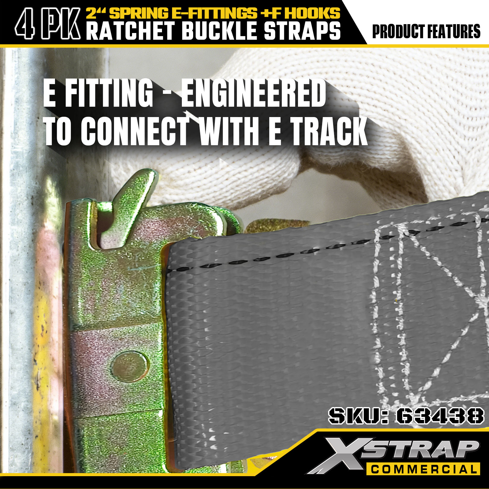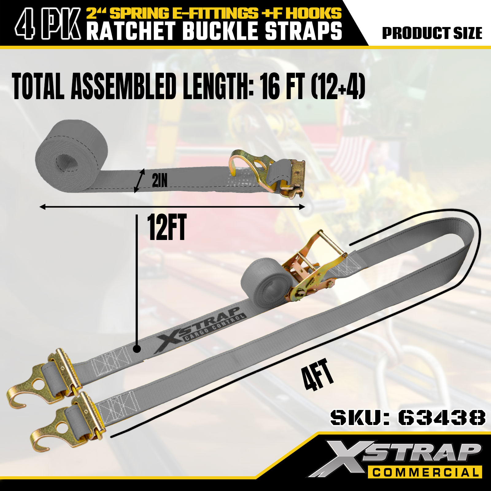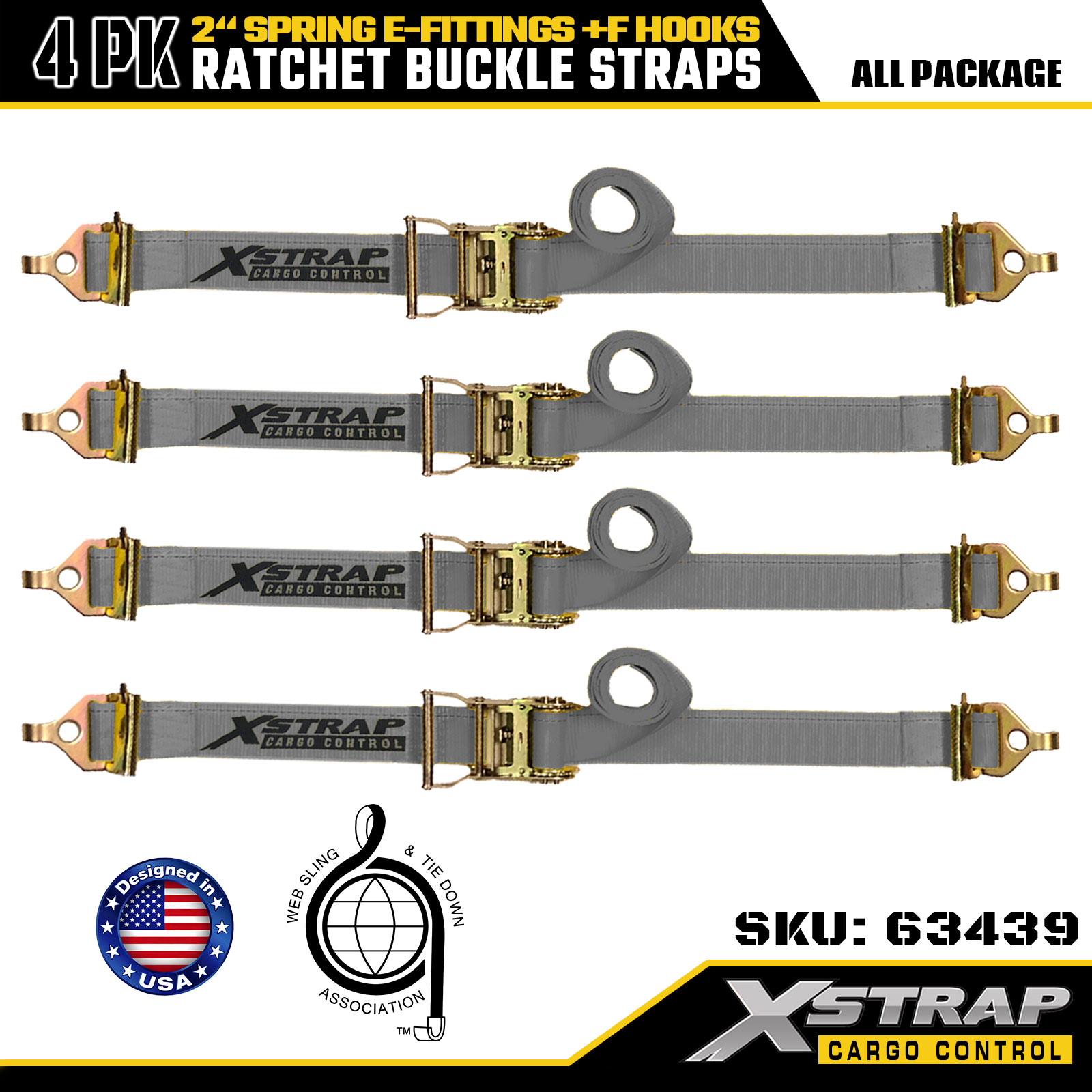 Xstrap 4 Paket 2" x 16' Cırcırlı Bağlama Kayışları - Yaylı E Bağlantı Parçaları ve F Kancaları ile Gri Polyester, Hareketli, Kamyon ve Genel Kargo Taşımacılığı için 733 lbs SWL