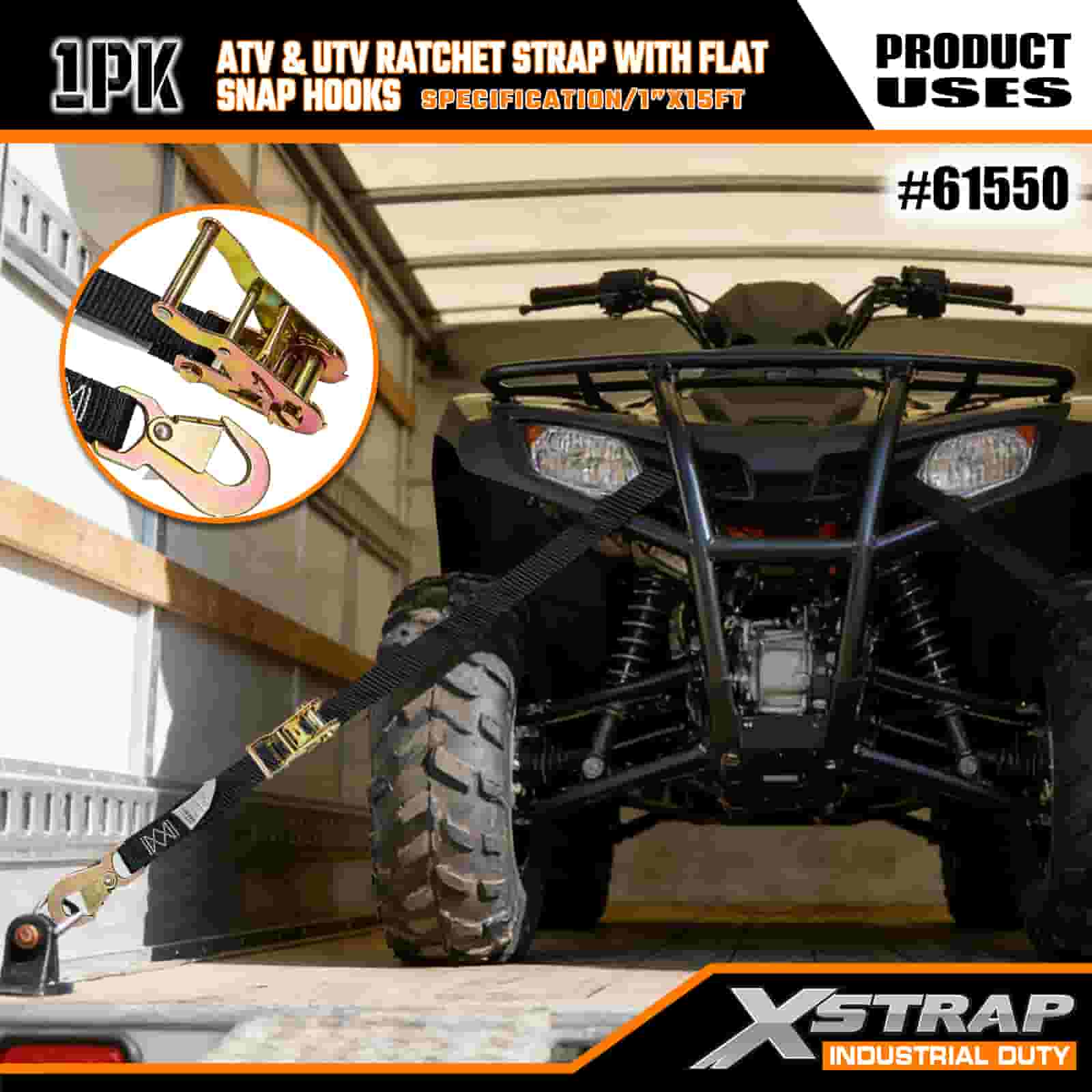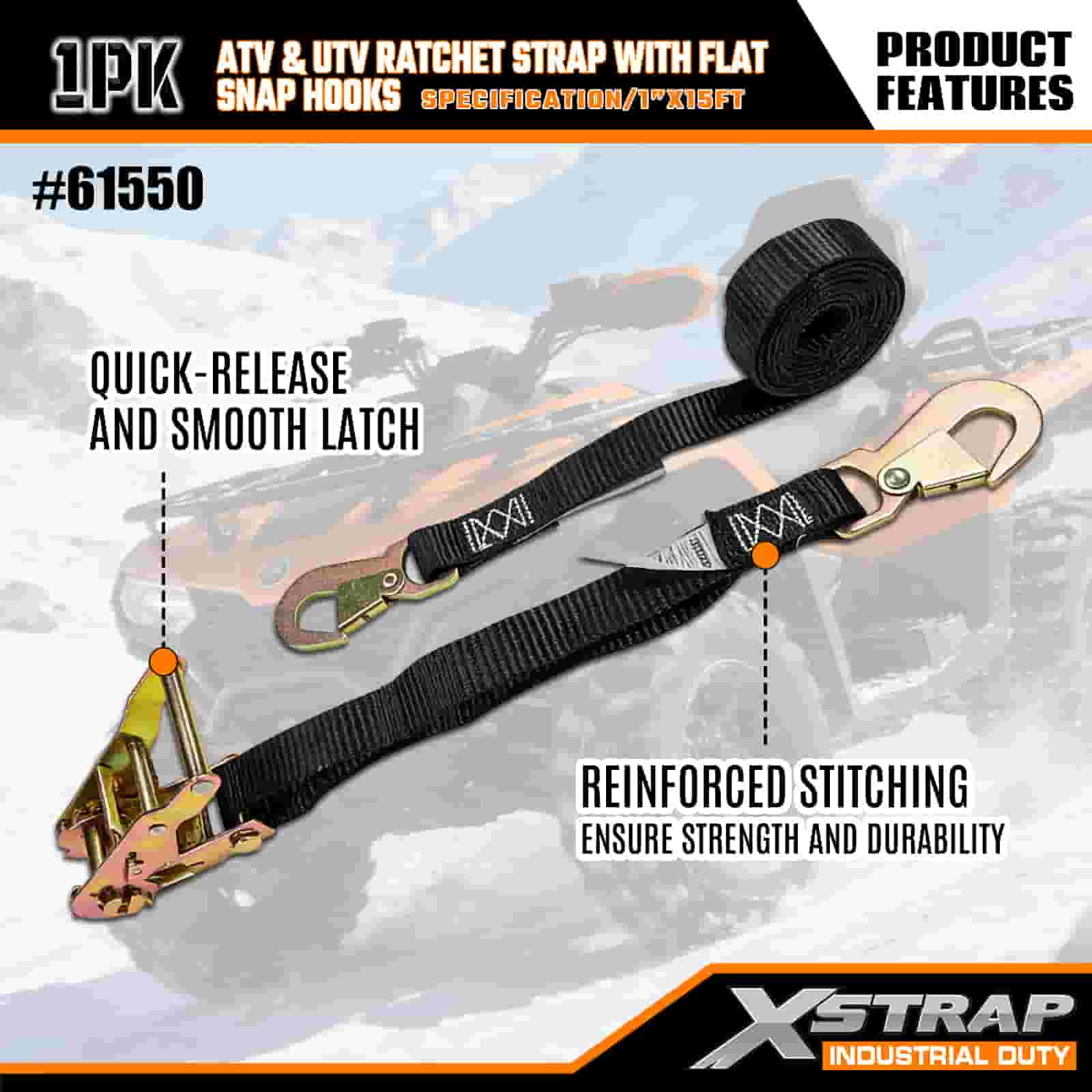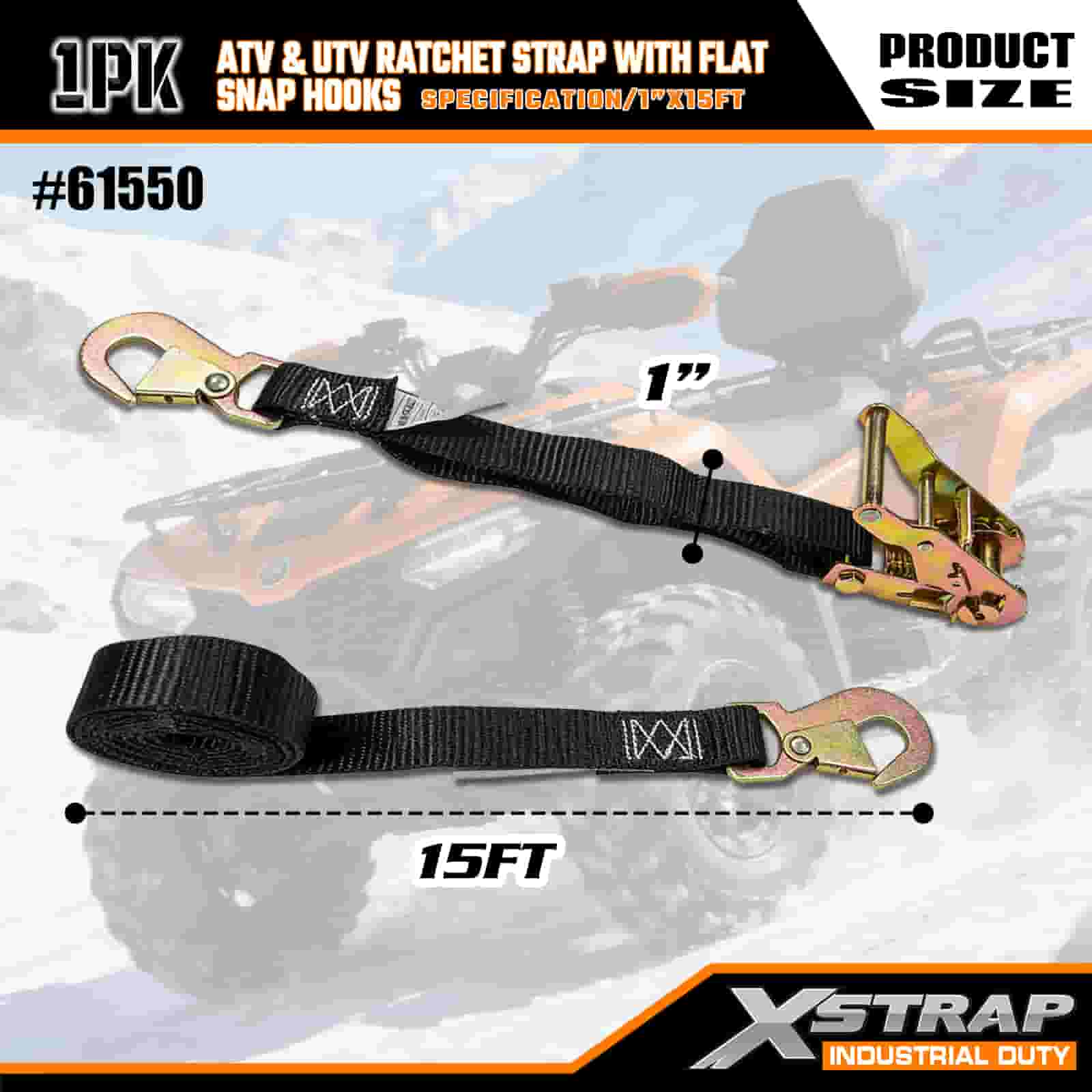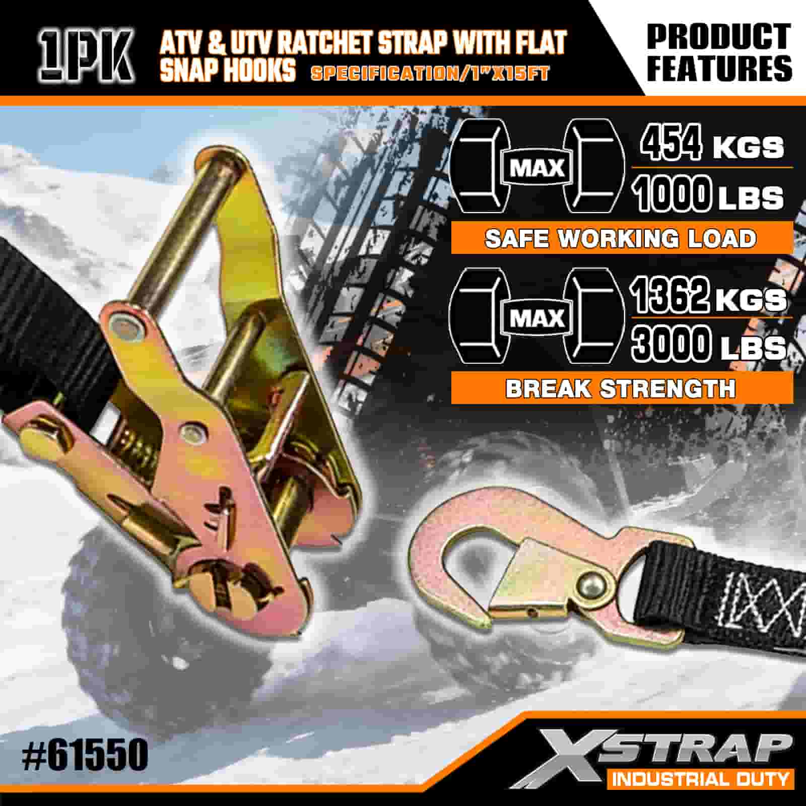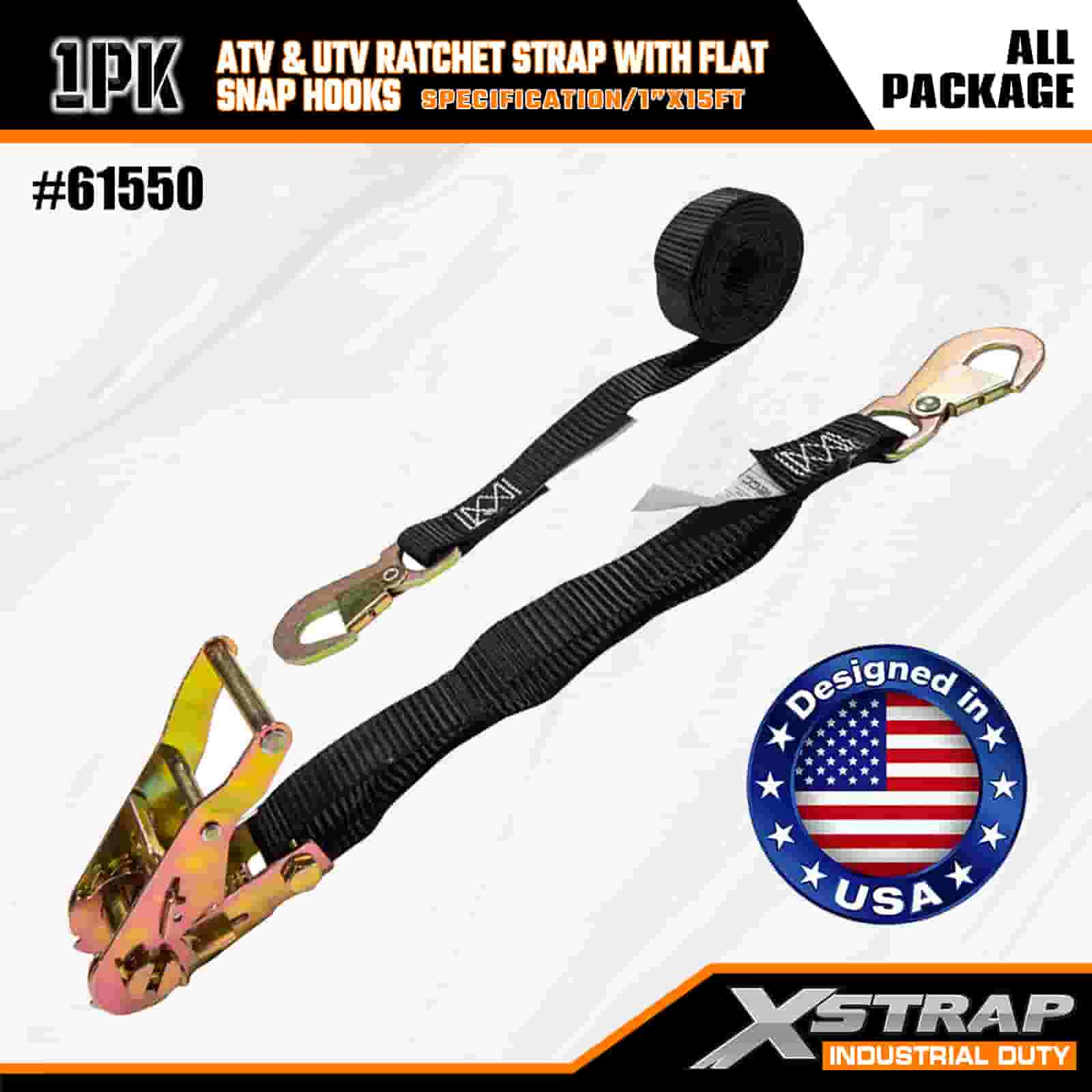 Xstrap ATV ve AUV Cırcır Kayışı, Düz Kancalı, 1" x 15' Polyester Bağlama Kayışı Cırcır Kayışı, 1000 lbs Kapasiteli Kargo Bağlama Sabitleme Kayışları, Römork için Düz Çıtçıtlı, Düz Yataklı Römork Kayak Teknesi, Küçük Araba, Ağır Ekipman.