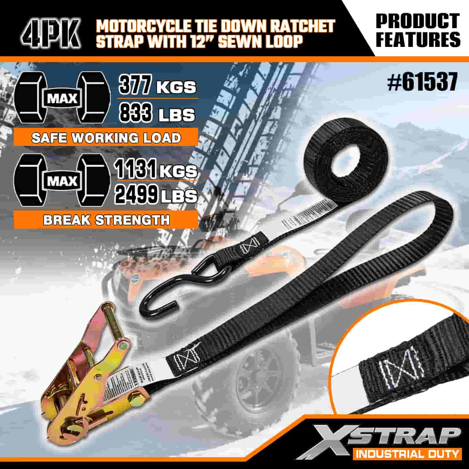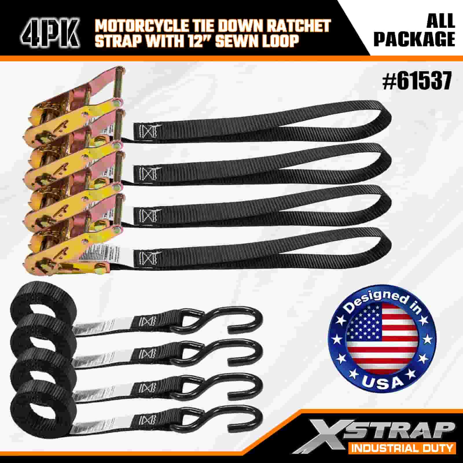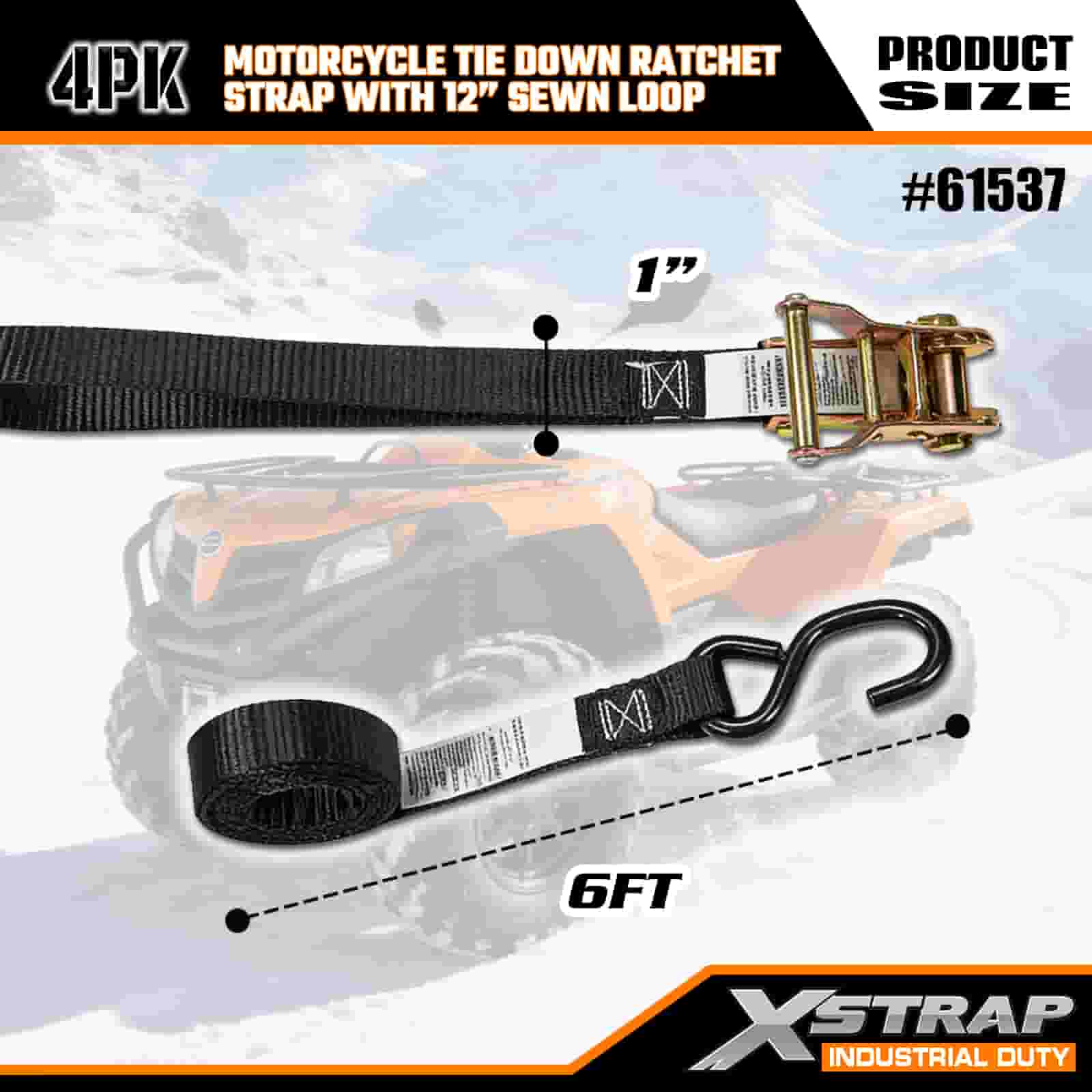 Xstrap 4PK Motosiklet Bağlama Cırcır Kayışı, 12" Dikişli Döngü, 1" x 6' Polyester Bağlama Kayışı Çekme Cırcır Kayışı, Ciddi Profesyoneller için Güvenli Kargo Römorku, Düz Yataklı Römork, Kayak Teknesi, Küçük Araba için S Kancalı 833lbs Kapasiteli Kargo Bağlama Sabitleme Kayışları.