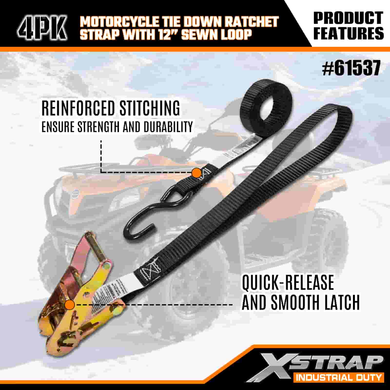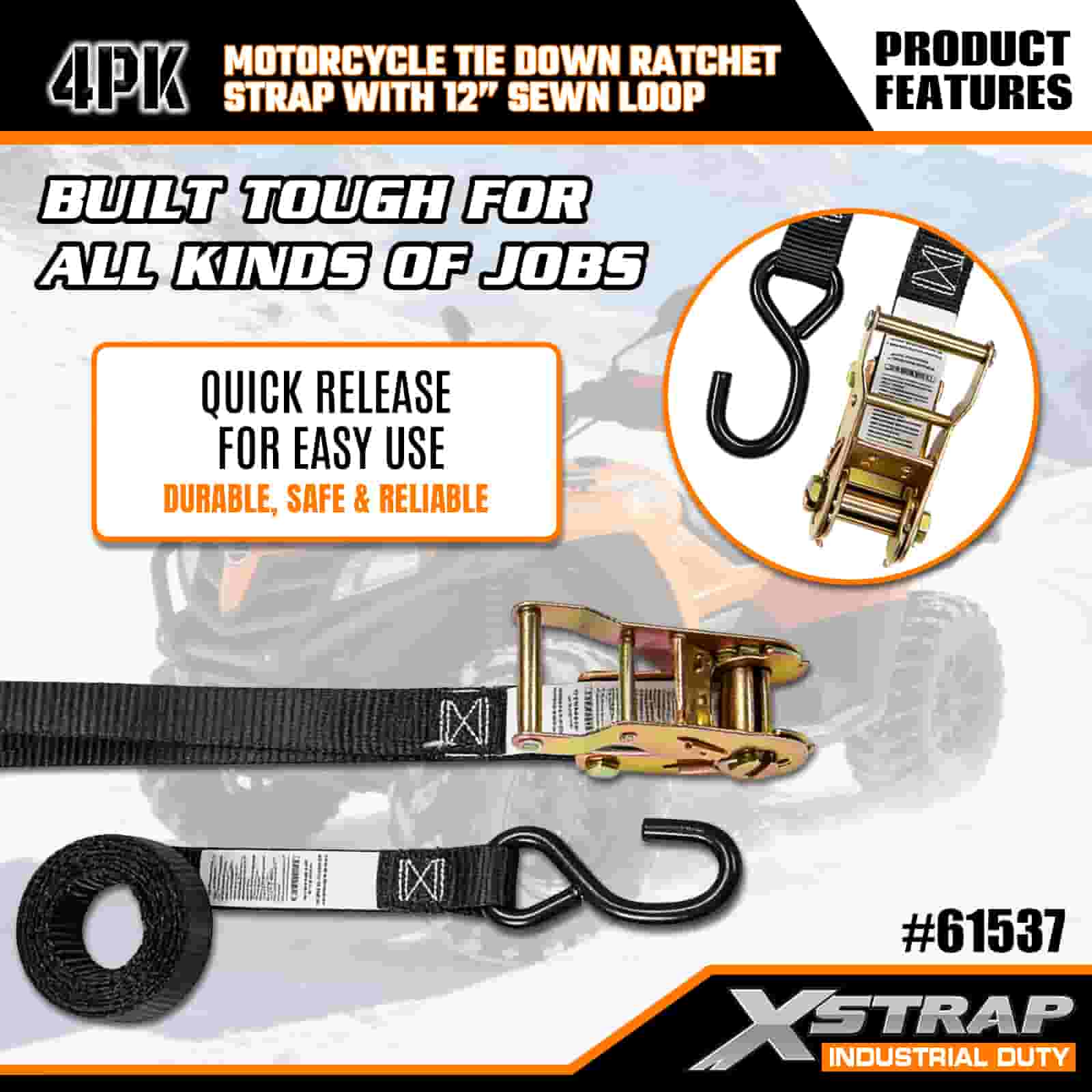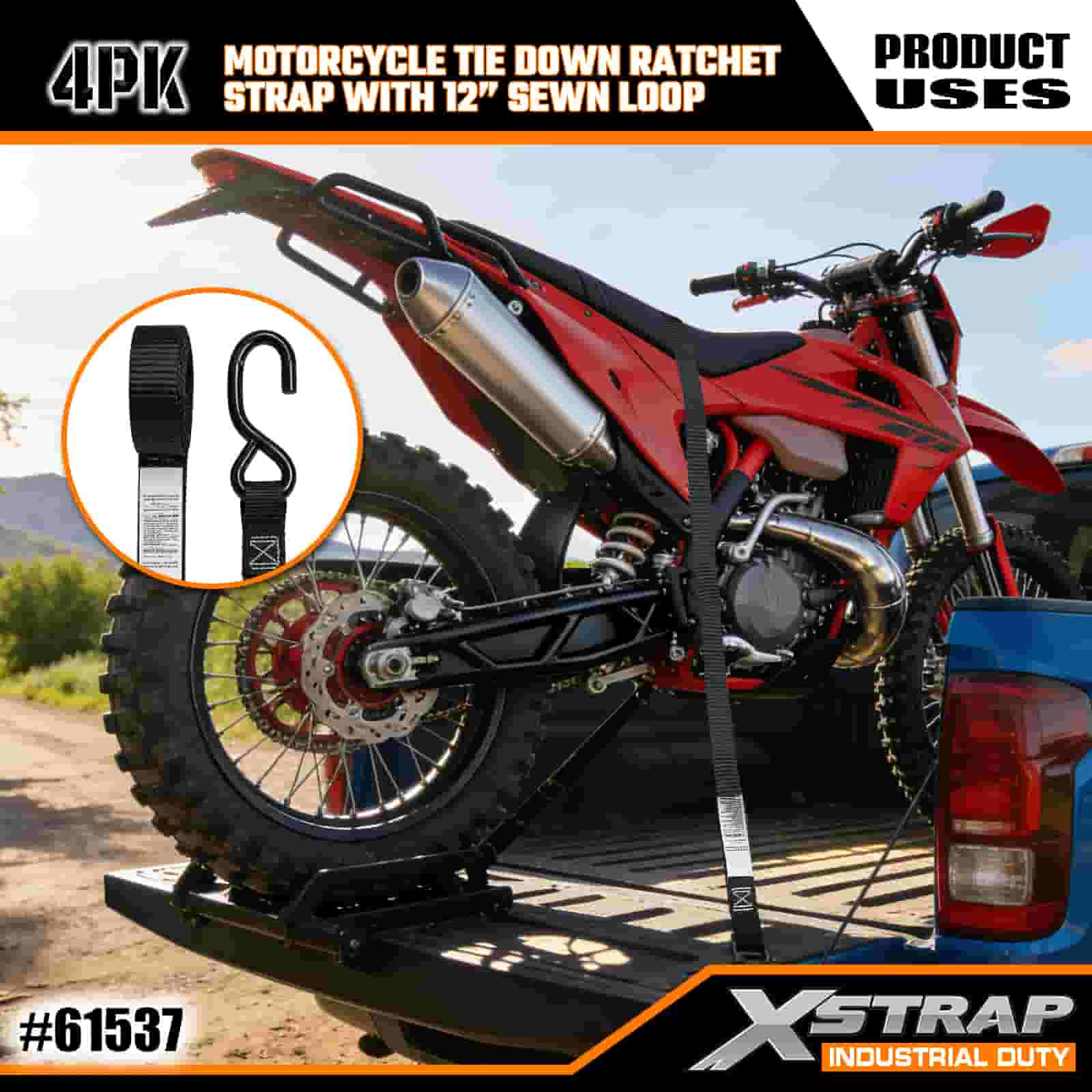 - Motosiklet Bağlama için 4'lü Paket 6FT Askılar: 4'lü askı seti (1 inç genişlik × 6 fit uzunluk) olarak satılır; motosikletleri, ATV'leri ve küçük eşyaları kamyon kasalarına veya taşıma sırasında sabitlemek için idealdir.
