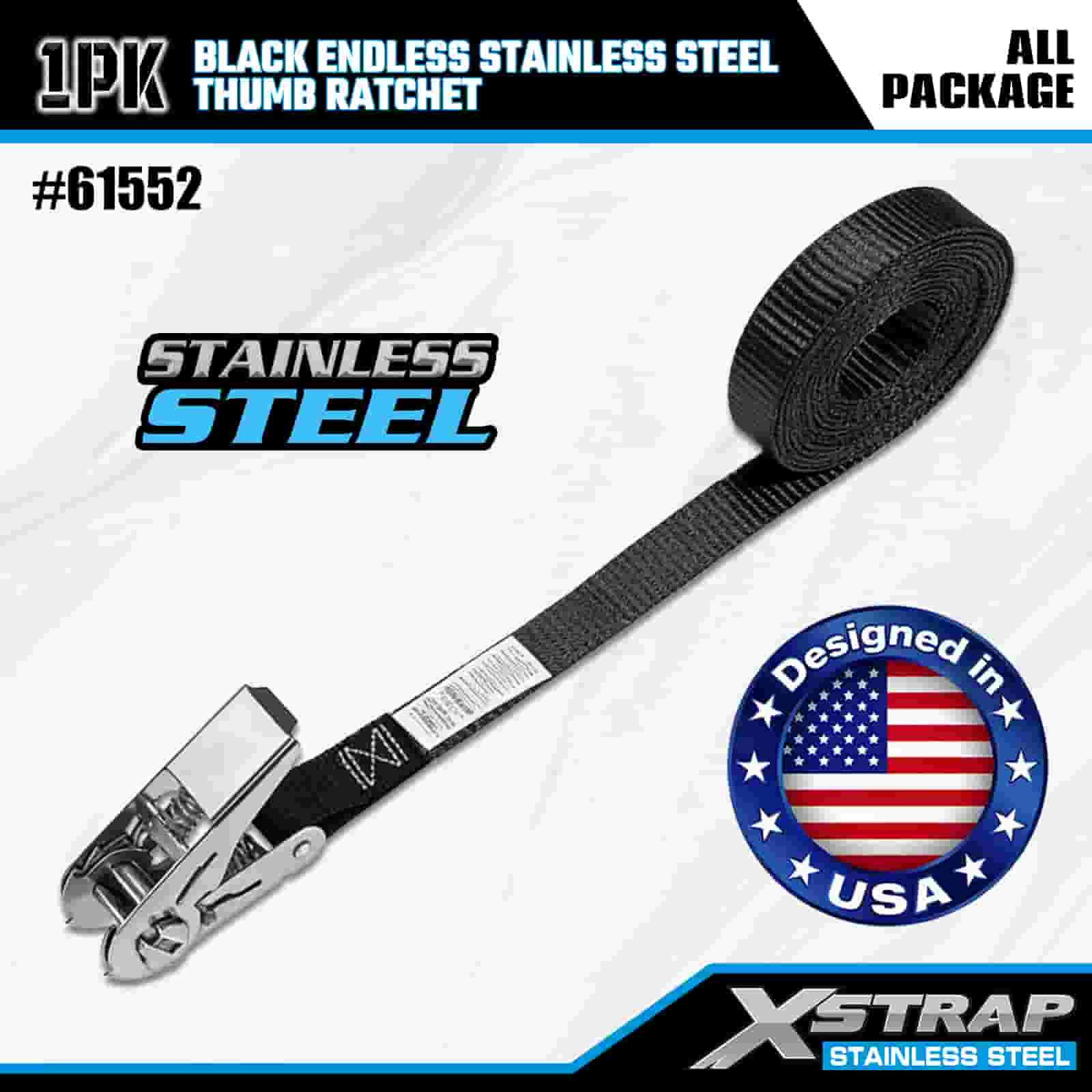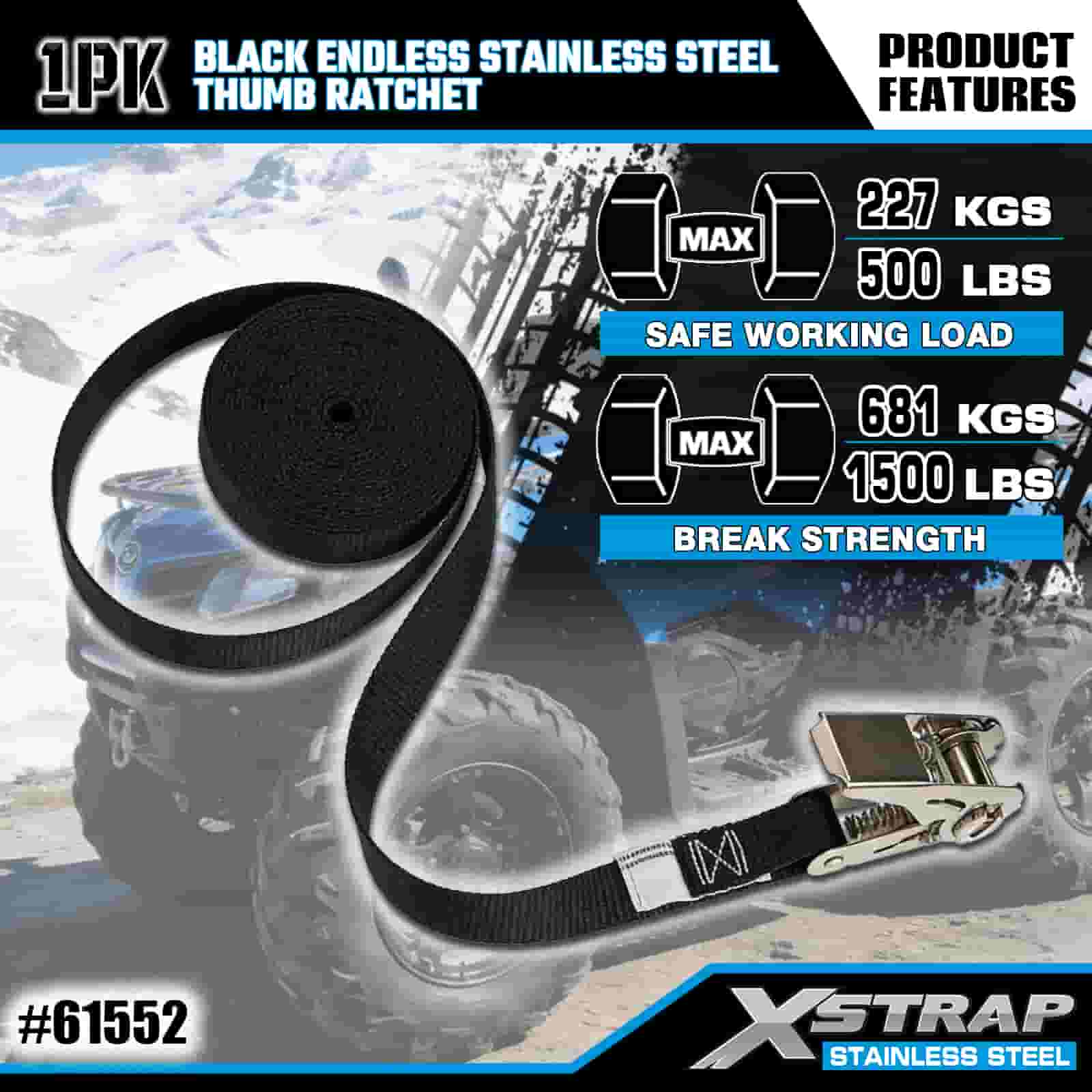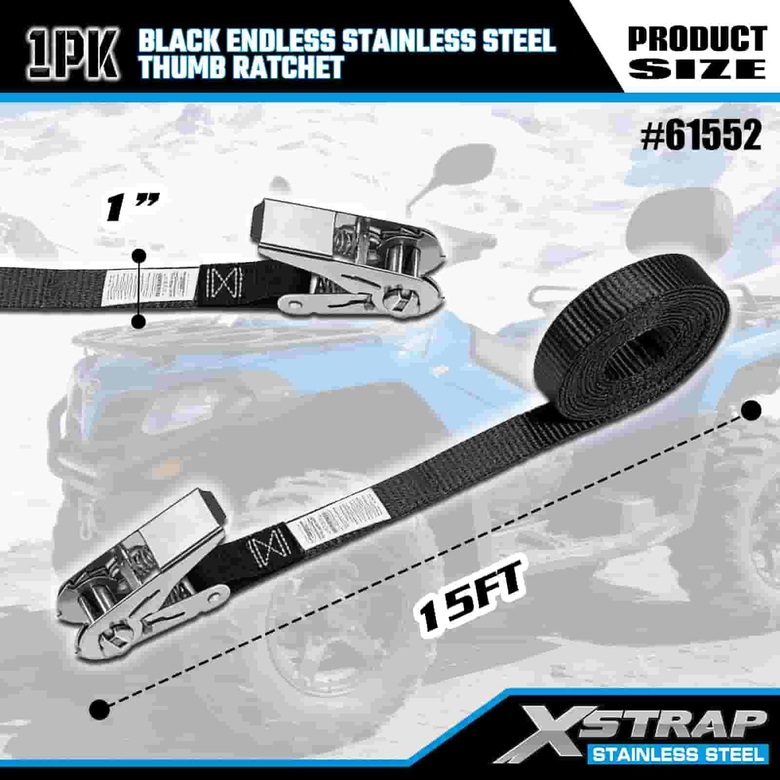 Xstrap Siyah Sonsuz Paslanmaz Çelik Başparmak Cırcır, 1" x 15' Polyester Bağlama Kayışı Cırcır Kayışı, Römork, Düz Yataklı Römork Kayak Teknesi, Küçük Araba, Ağır Ekipman için 500 lbs Kapasiteli Kargo Bağlama Sabitleme Kayışları.