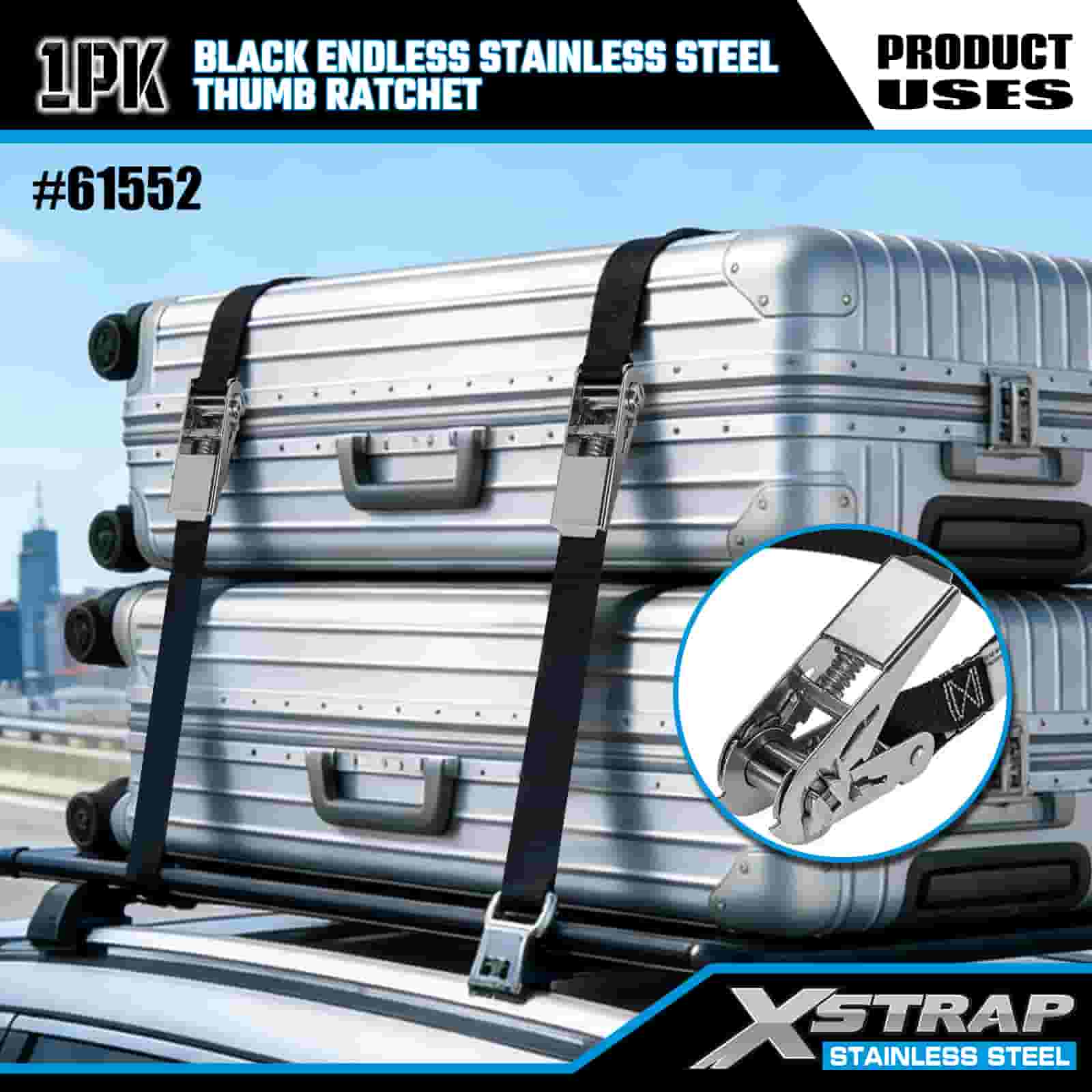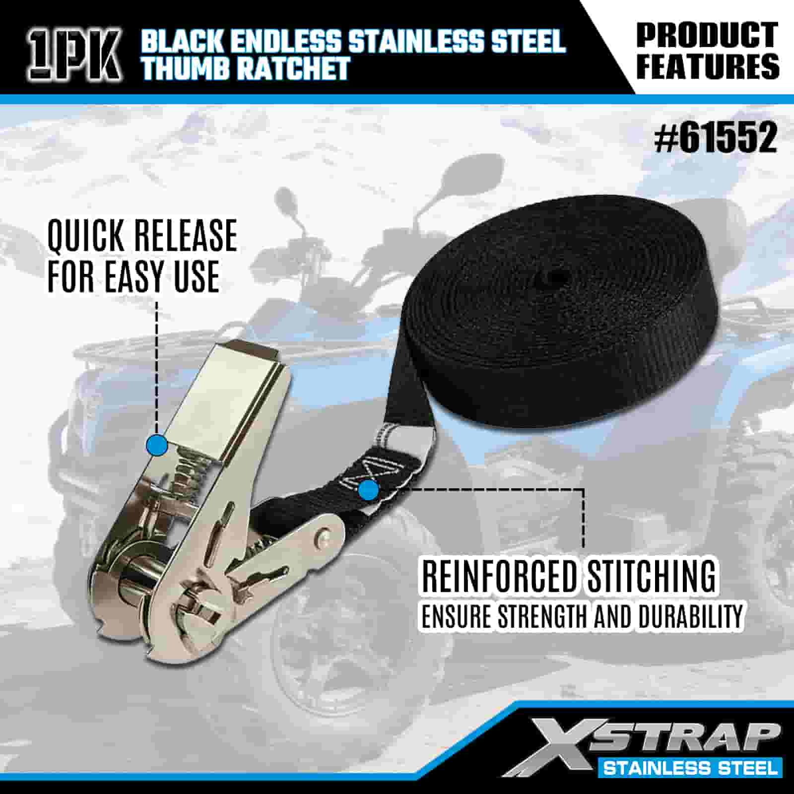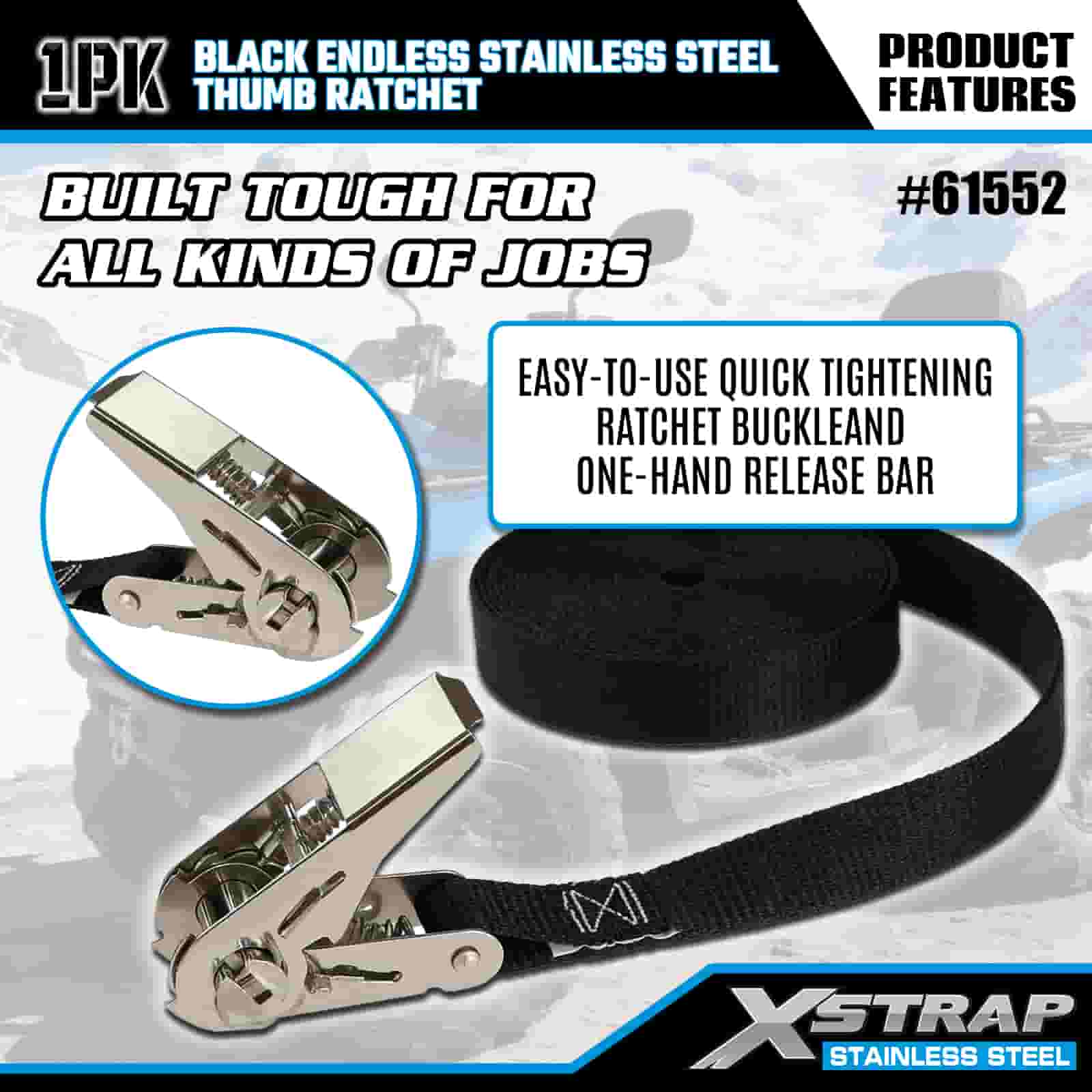 Xstrap Siyah Sonsuz Paslanmaz Çelik Başparmak Cırcır, 1" x 15' Polyester Bağlama Kayışı Cırcır Kayışı, Römork, Düz Yataklı Römork Kayak Teknesi, Küçük Araba, Ağır Ekipman için 500 lbs Kapasiteli Kargo Bağlama Sabitleme Kayışları.