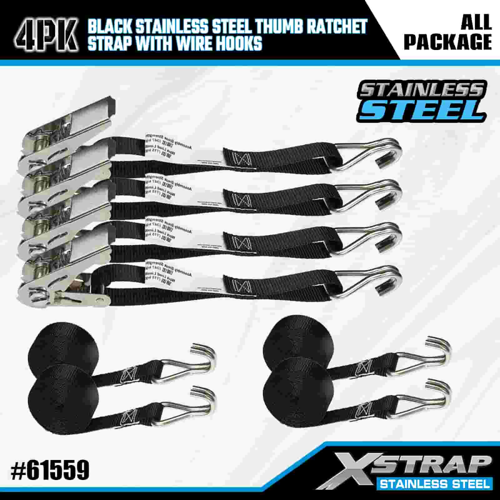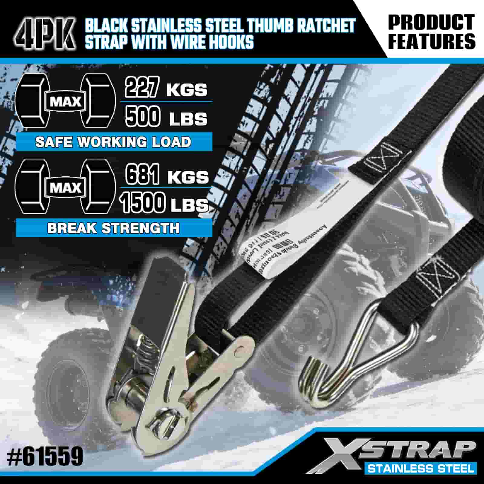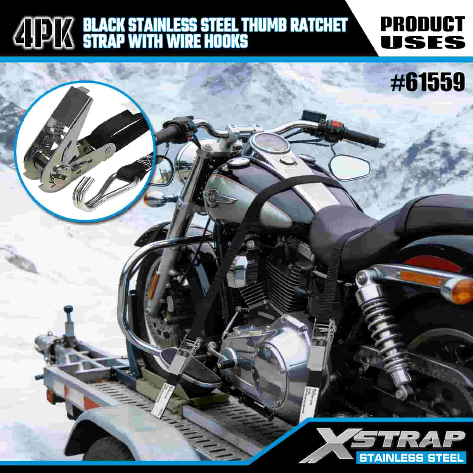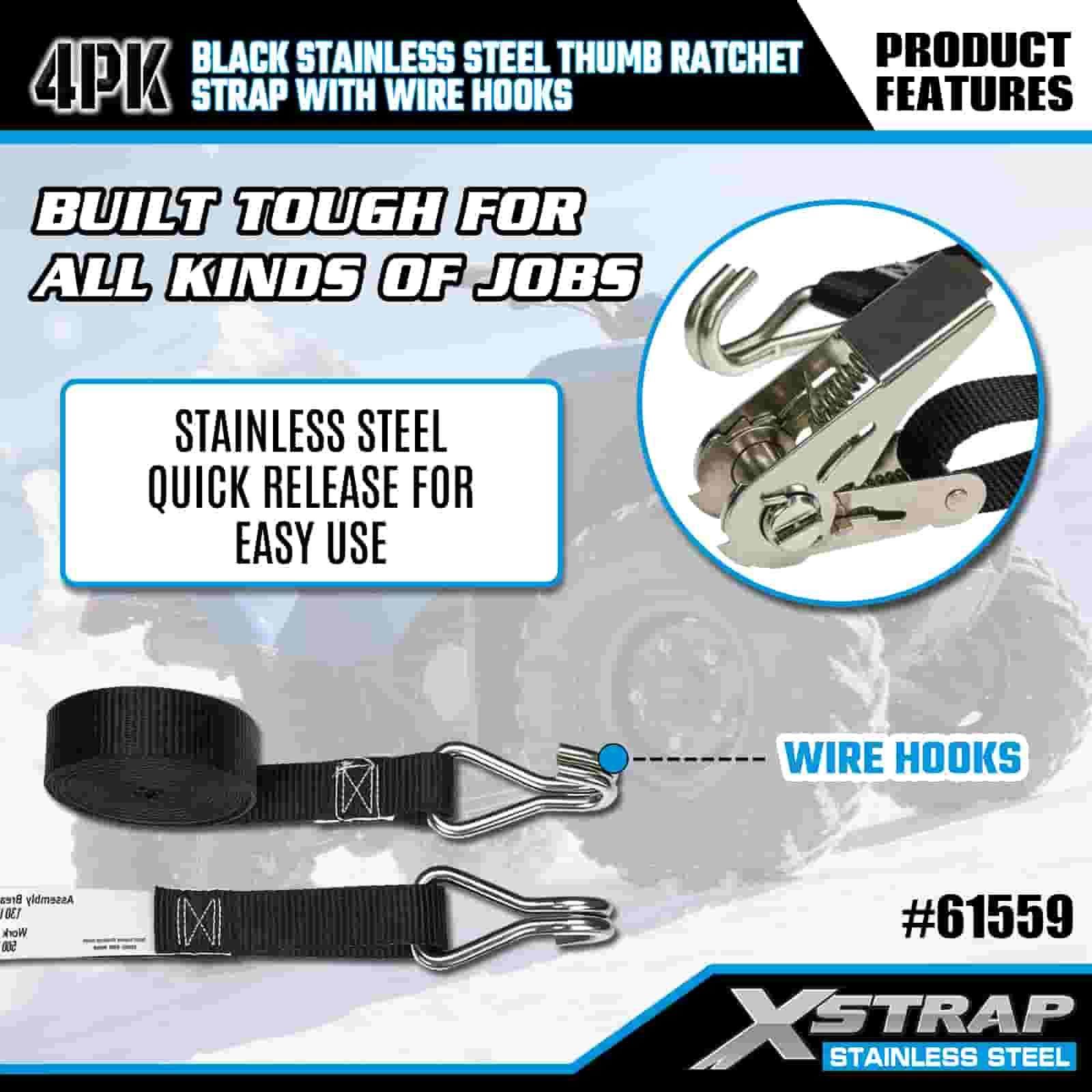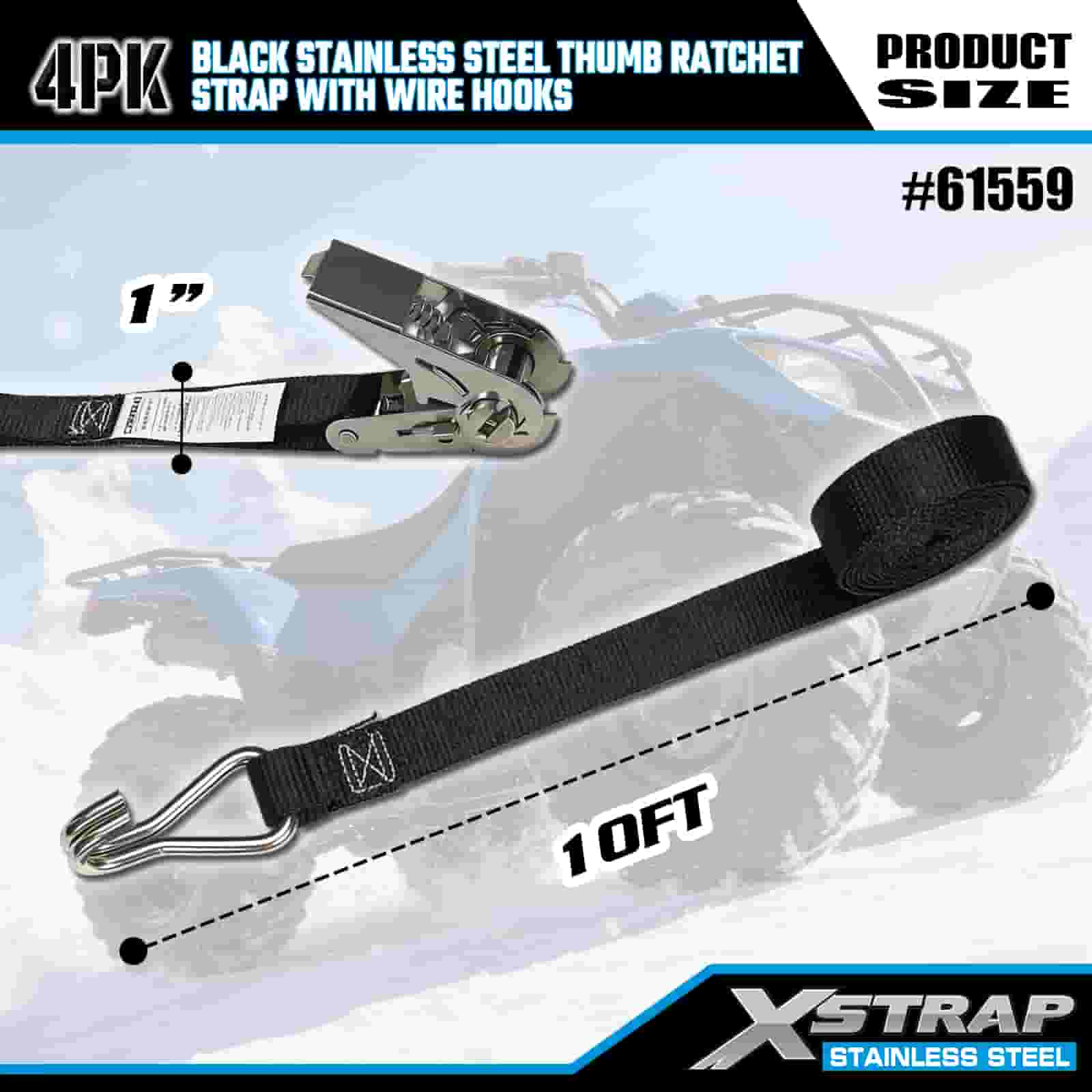 Xstrap 4PK Siyah Paslanmaz Çelik Başparmak Cırcır, Tel Kancalı, 1" x 10' Polyester Bağlama Kayışı Cırcır Kayışı, Römork için Tel Kancalı 500 lbs Kapasiteli Kargo Bağlama Sabitleme Kayışları, Düz Yataklı Römork Kayak Teknesi, Küçük Araba, Ağır Ekipman.