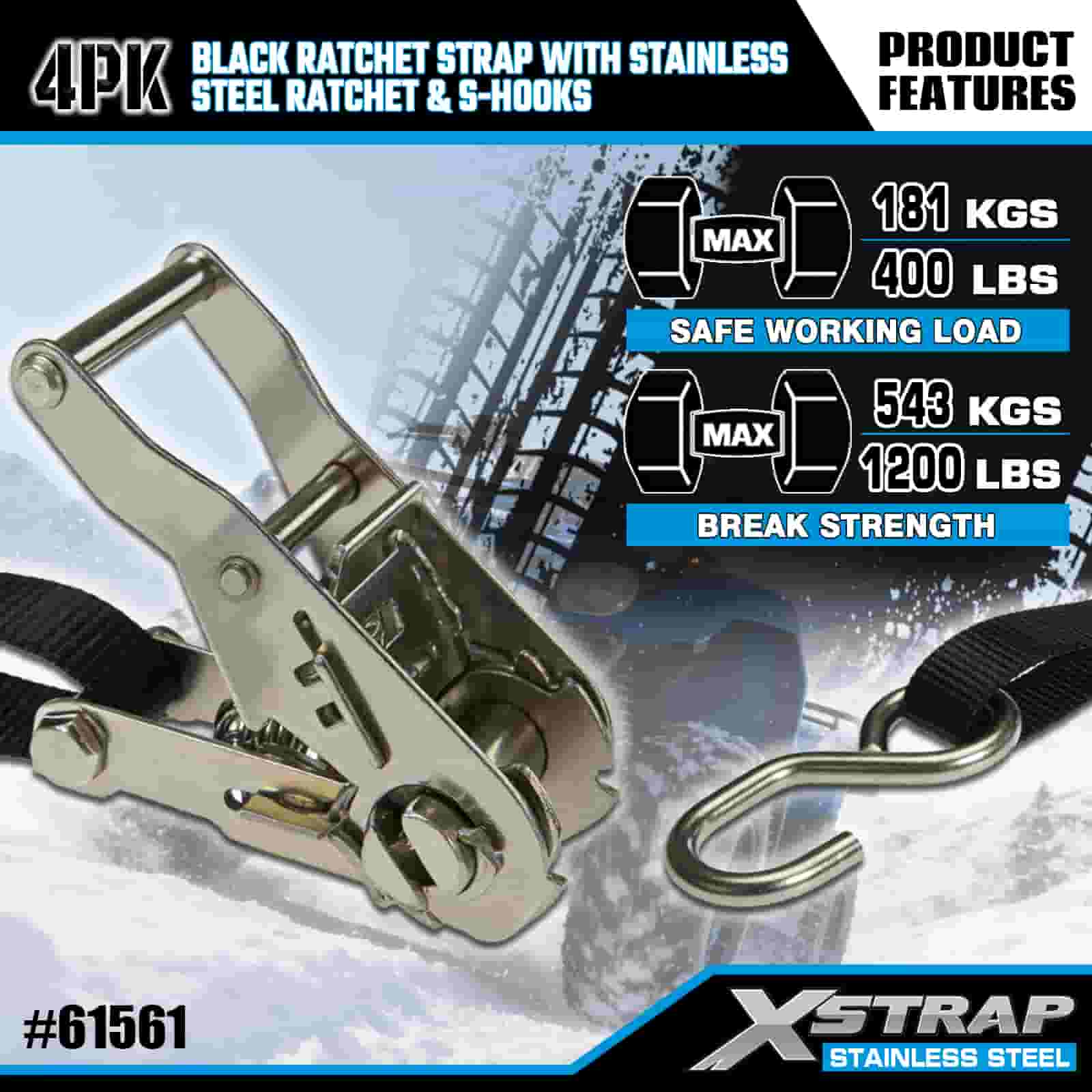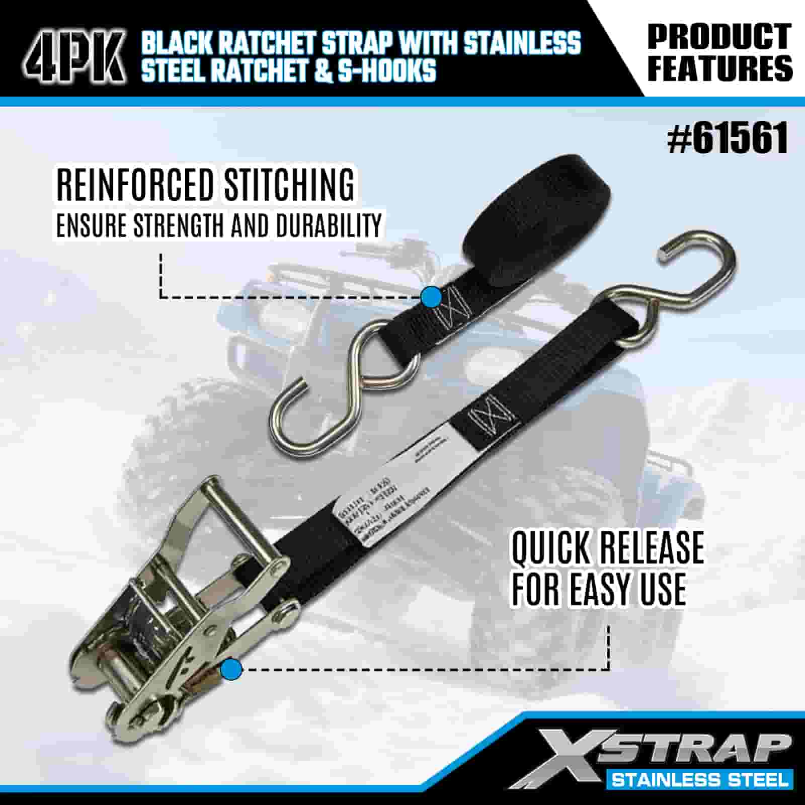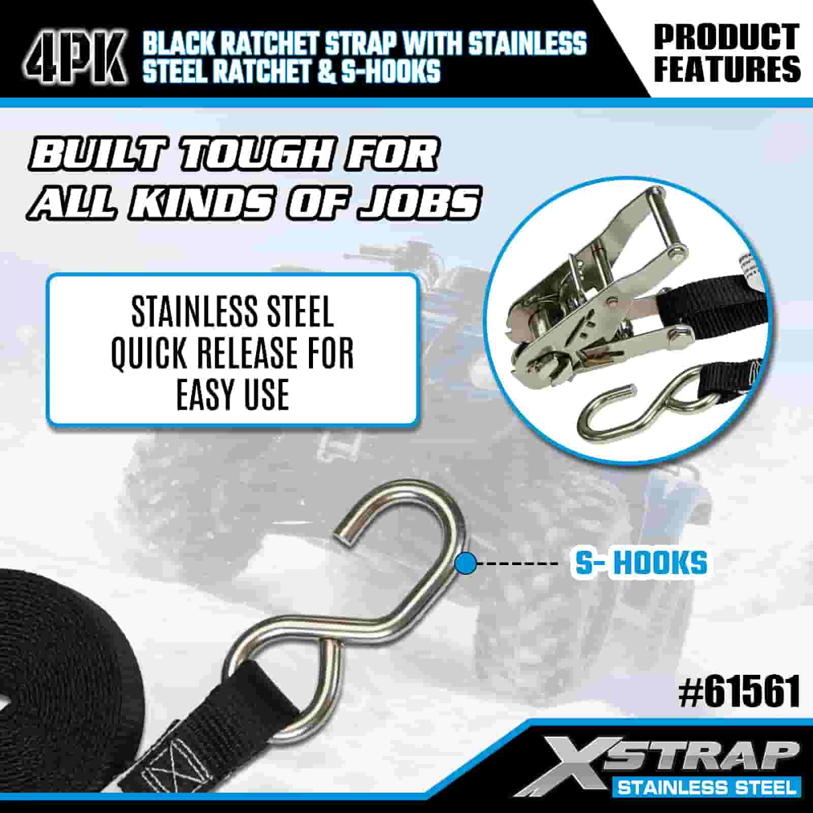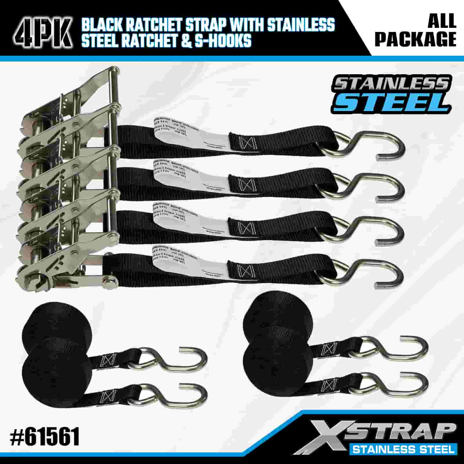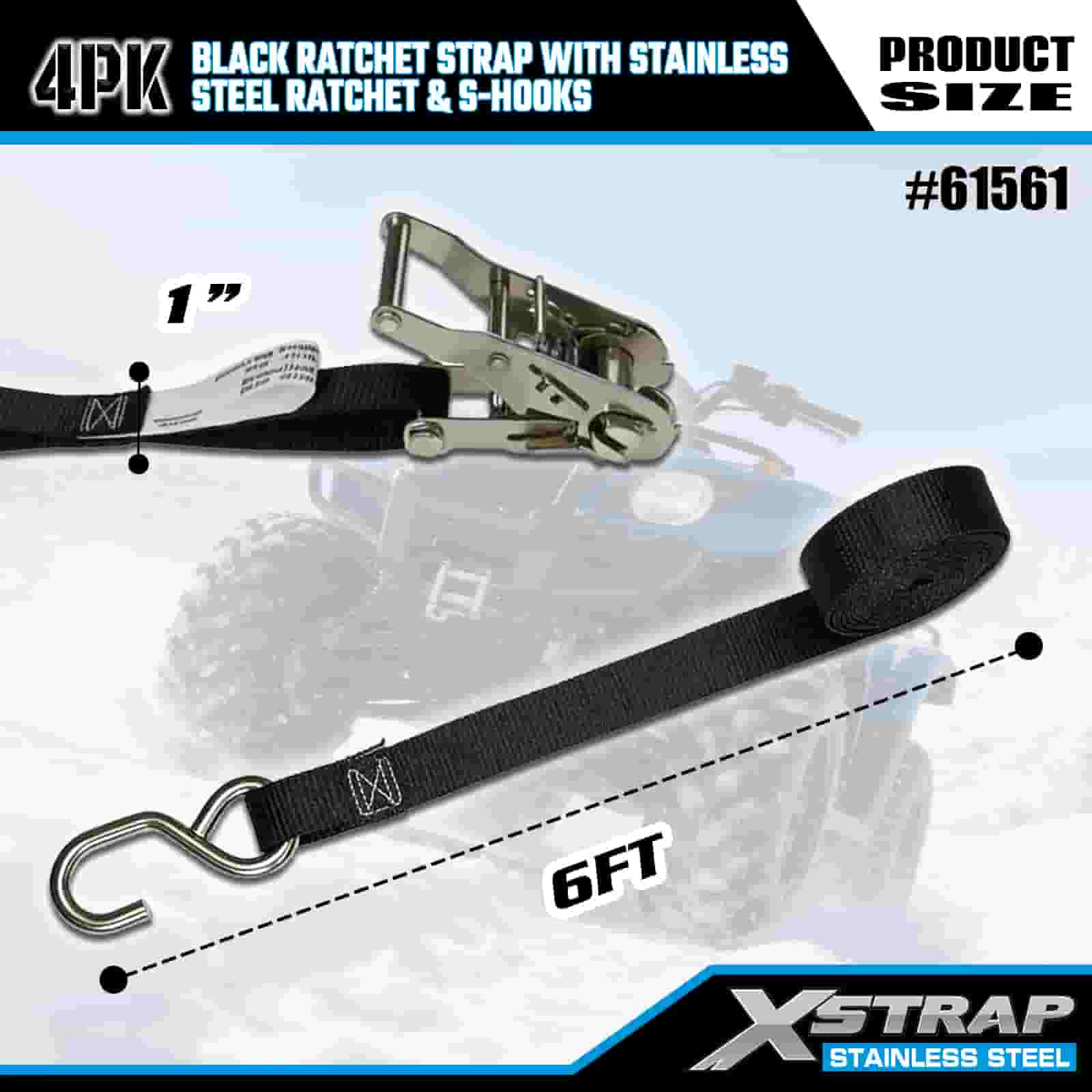 Xstrap 4PK Paslanmaz Çelik Cırcırlı ve S Kancalı Siyah Cırcır Kayışı, 1" x 6' Polyester Bağlama Kayışı Cırcır Kayışı, Römork, Düz Yataklı Römork Kayak Teknesi, Küçük Araba, Ağır Ekipman için S Kancalı 400 lbs Kapasiteli Kargo Bağlama Sabitleme Kayışları.