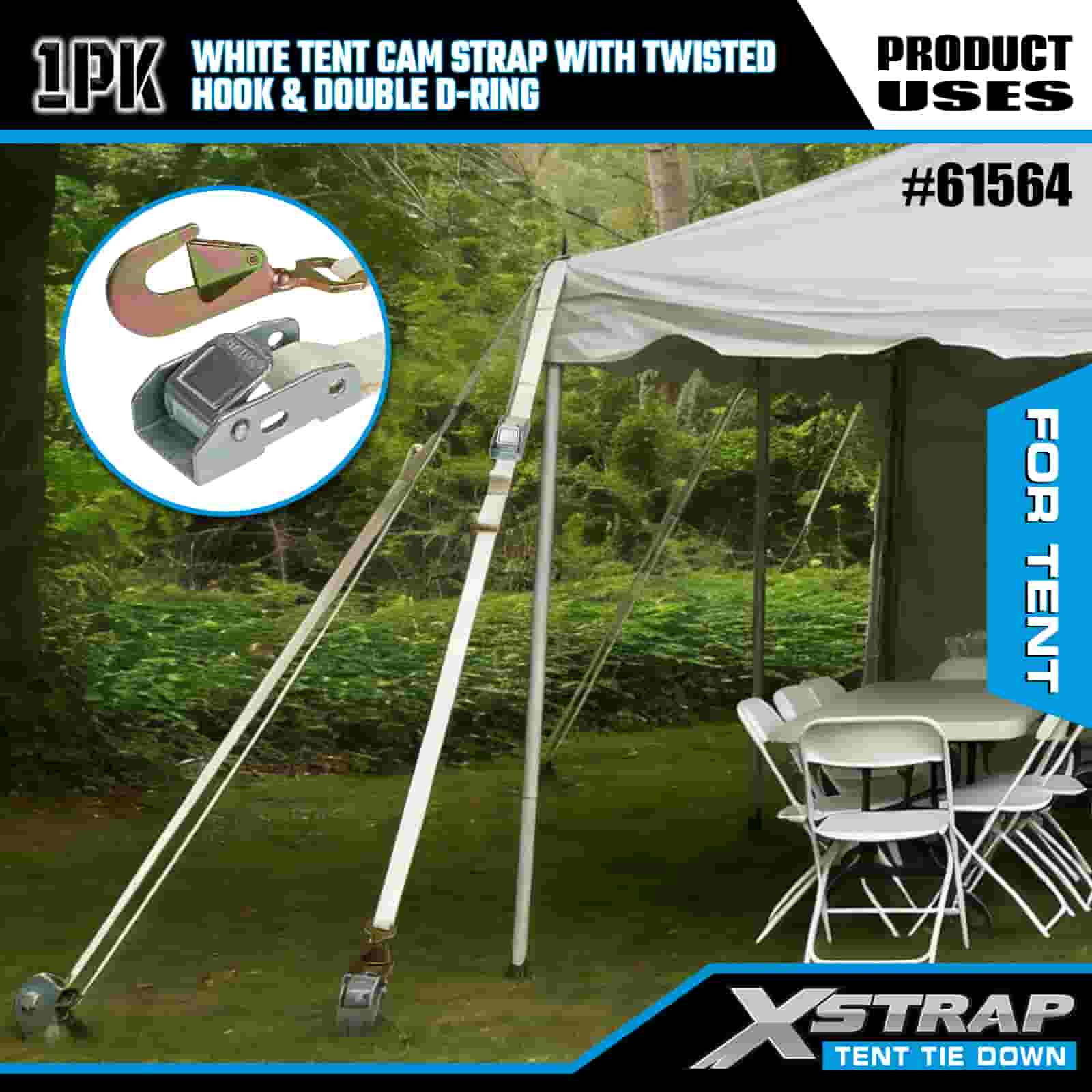 Xstrap Beyaz Çadır Kam Kayışı, Bükülmüş Kanca ve Çift D Halkalı, 1" x 15' Polyester Bağlama Kayışı Cırcır Kayışı, 440 lbs Kapasiteli Kargo Bağlama Sabitleme Kayışları Bükülmüş Kanca ve Çift D Halka Kargo Kontrolü, Çadır sabitleme için.