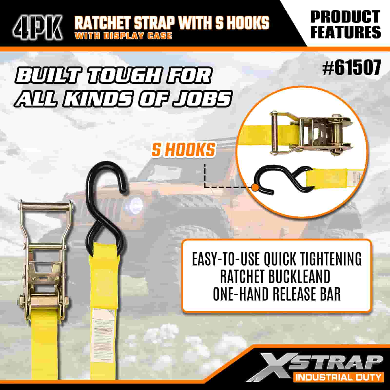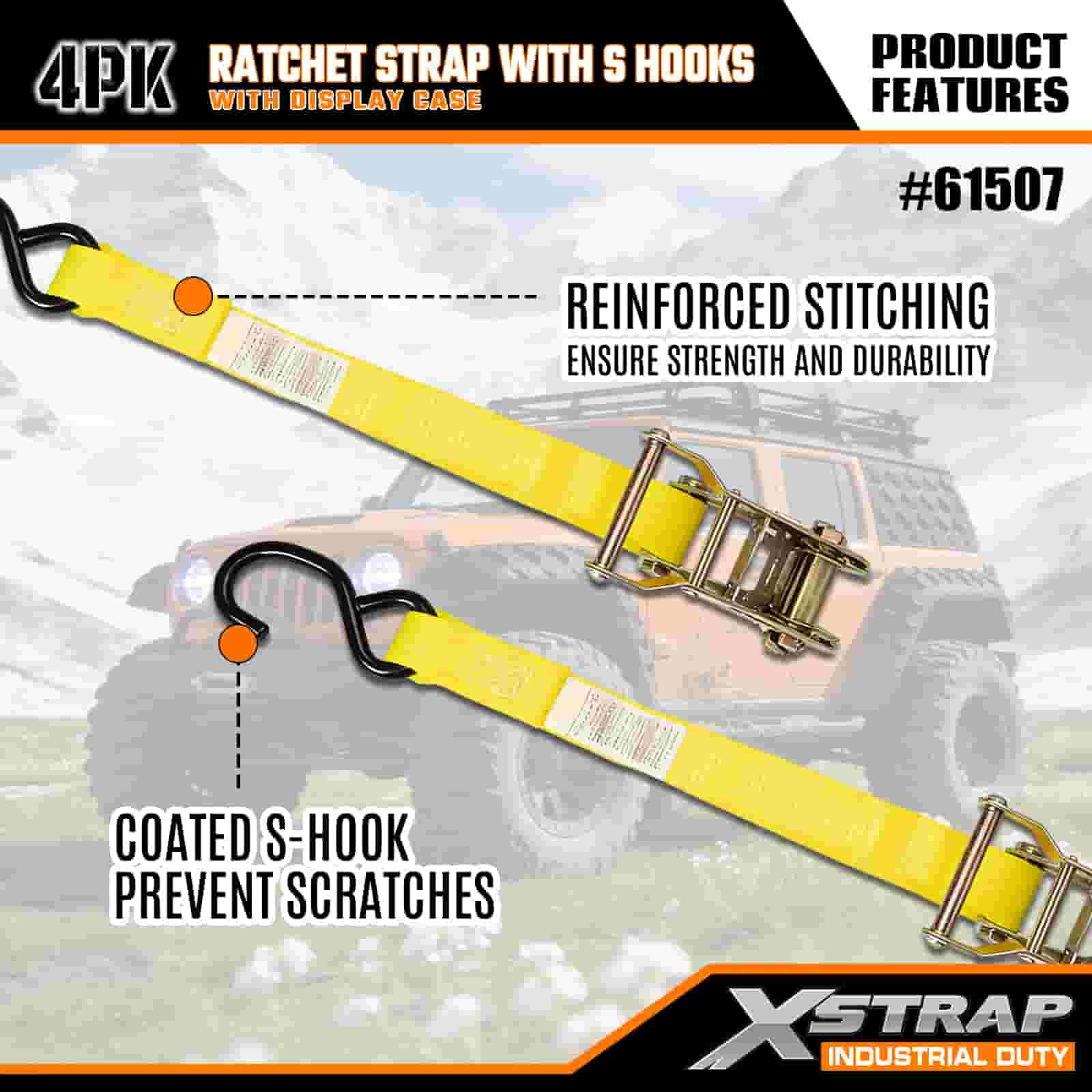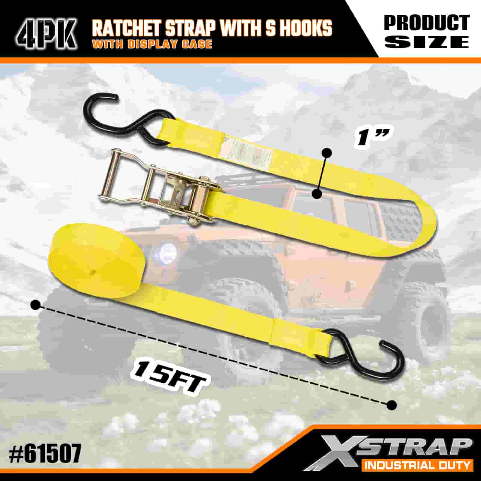Xstrap 4 Paket S Kancalı Cırcır Kayışı, 1" x 15' Polyester Bağlama Kayışı Çekme Cırcır Kayışı, Ciddi Profesyoneller için Güvenli Kargo Römorku, Düz Yataklı Römork, Kayak Teknesi, Küçük Araba için S Kancalı 400 lbs Kapasiteli Kargo Bağlama Sabitleme Kayışları.