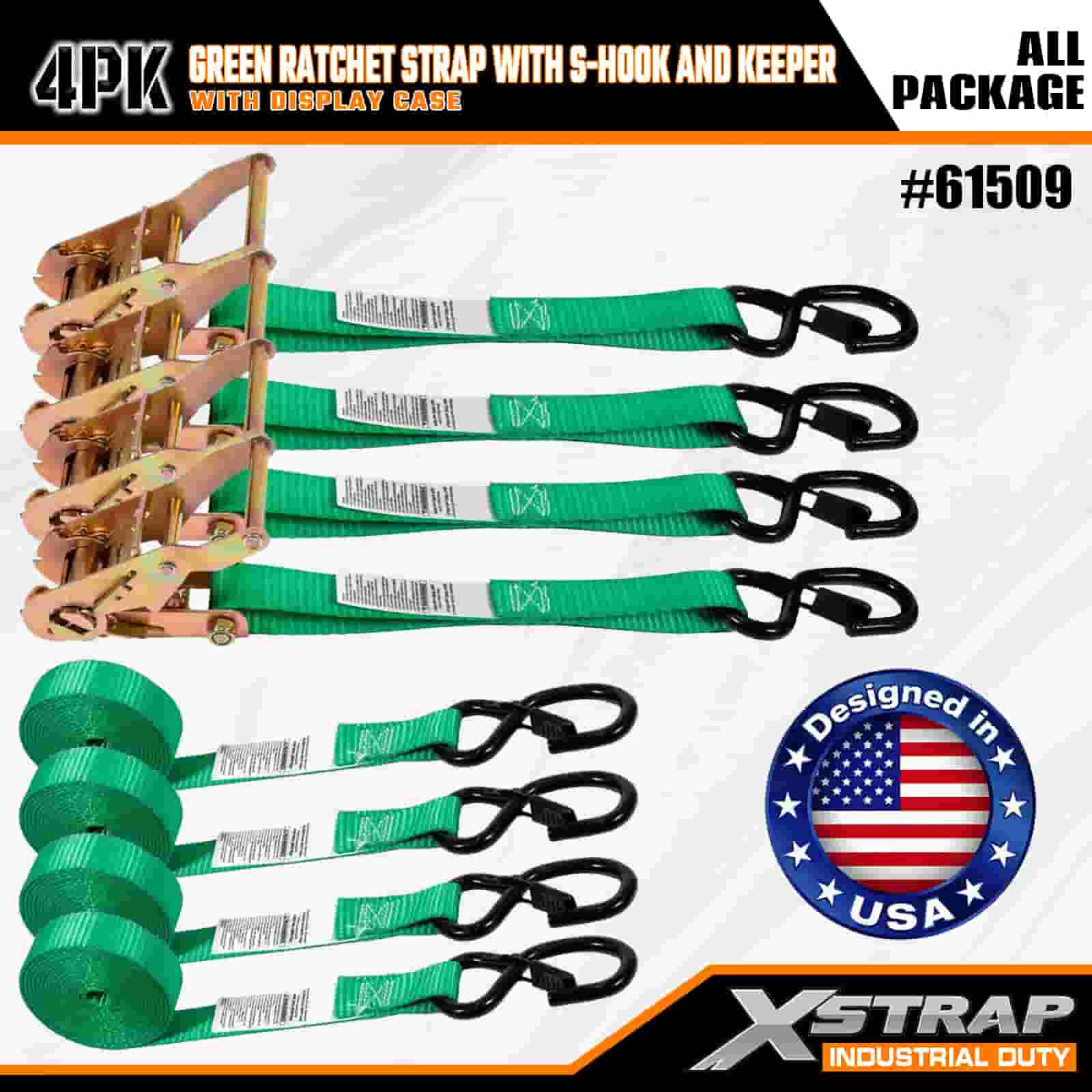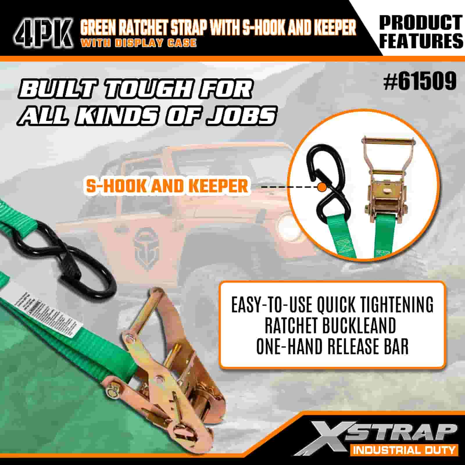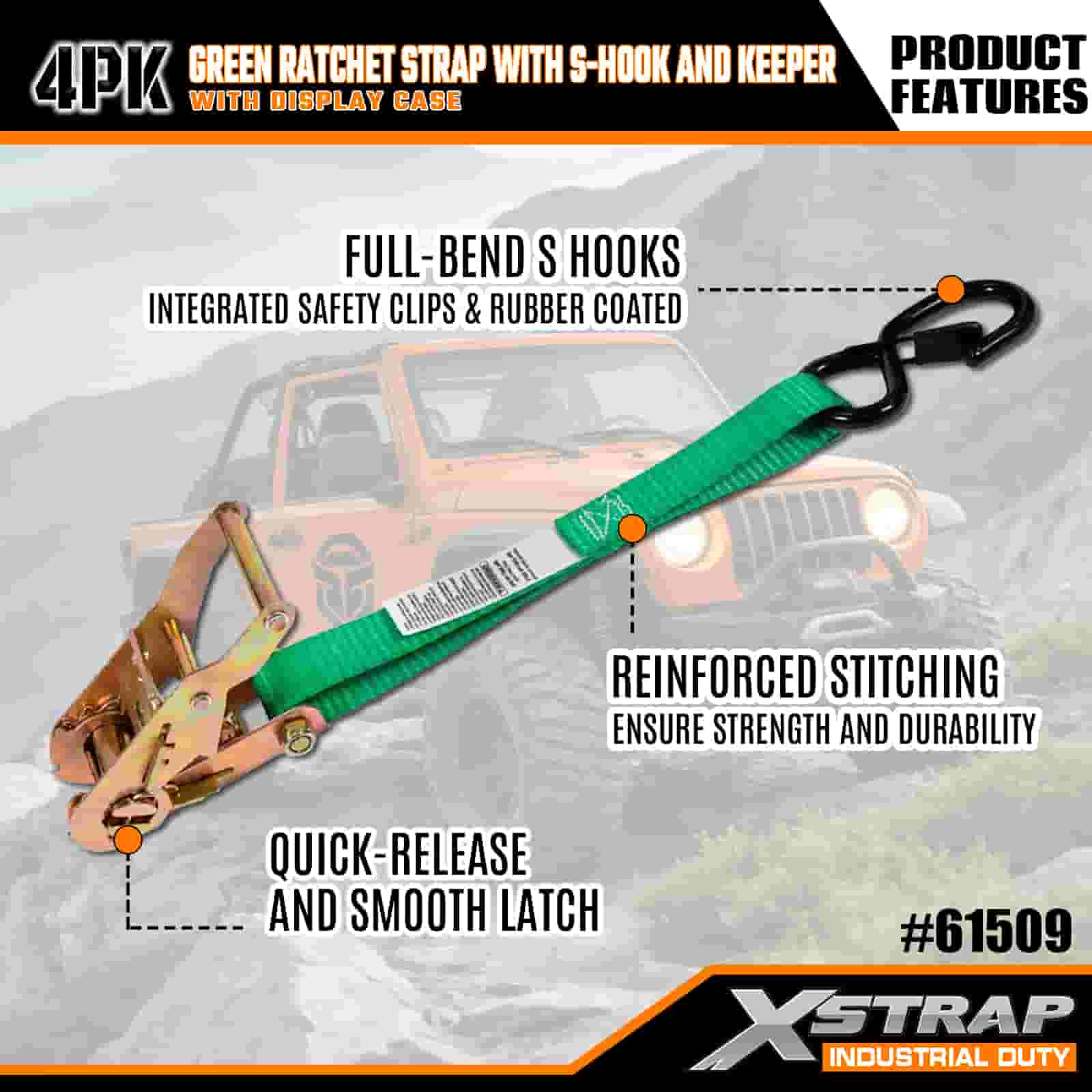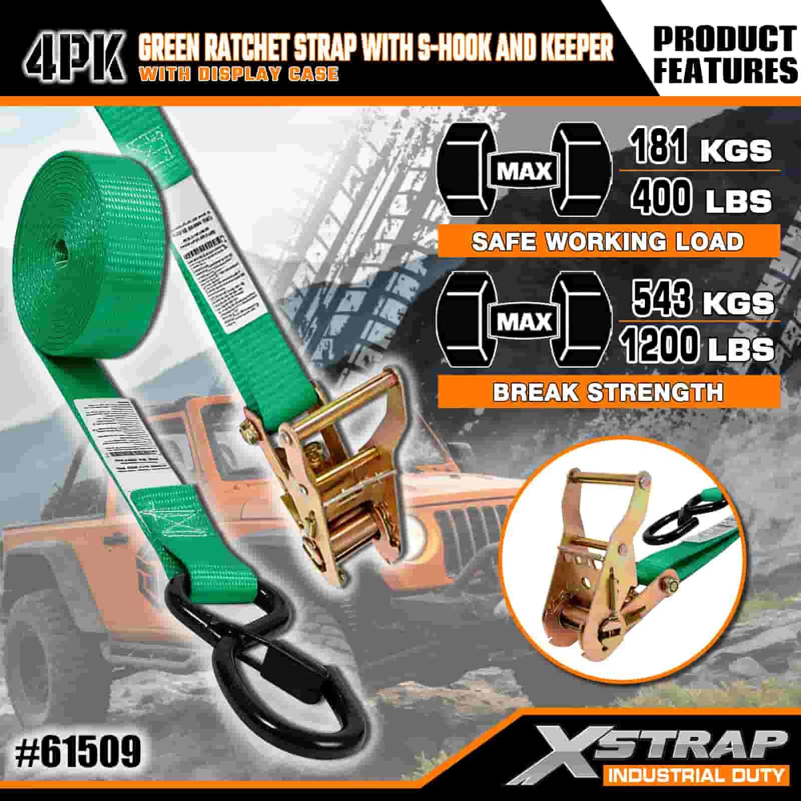 Xstrap 4 Paket Güvenlik S Kancalı Cırcır Kayışı, 1" x 15' Polyester Bağlama Kayışı Çekme Cırcır Kayışı, Ciddi Profesyoneller için Güvenli Kargo Römorku, Düz Yataklı Römork, Kayak Teknesi, Küçük Araba için Güvenlik S Kancalı 400 lbs Kapasiteli Kargo Bağlama Sabitleme Kayışları.