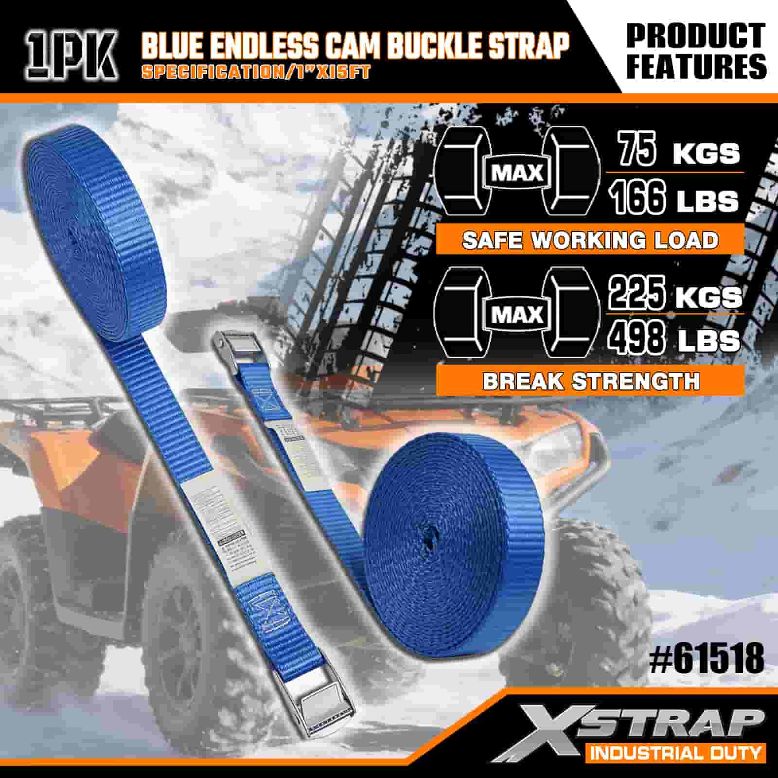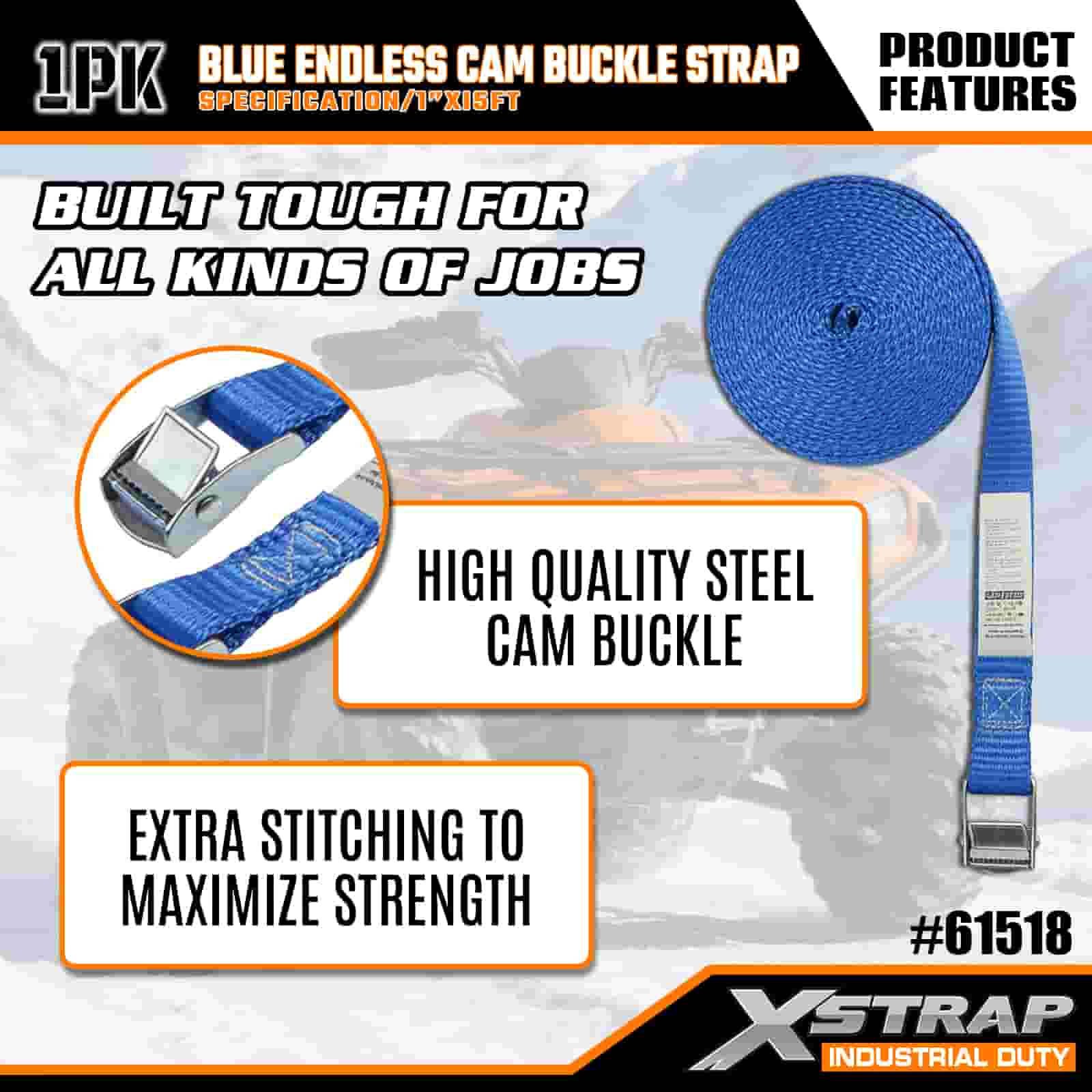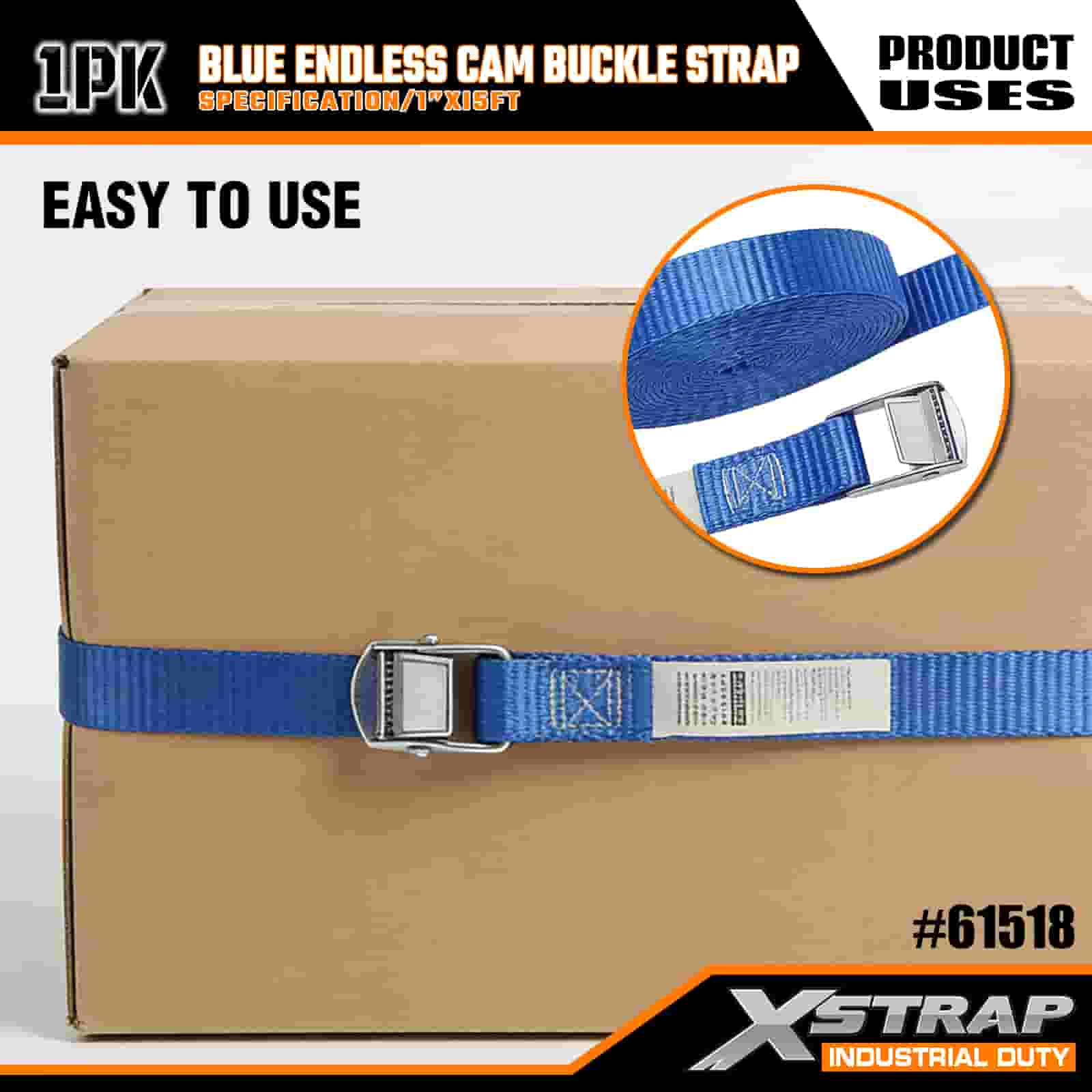 Xstrap Mavi Sonsuz Kam Tokalı Kayış, 1" x 15' Polyester Bağlama Kayışı Çekme Cırcırlı Kayış, Ciddi Profesyoneller için 166 lb Kapasiteli Kargo Bağlama Sabitleme Kayışları Kargo Römorku, Düz Yataklı Römork, Kayak Teknesi, Küçük Araba.