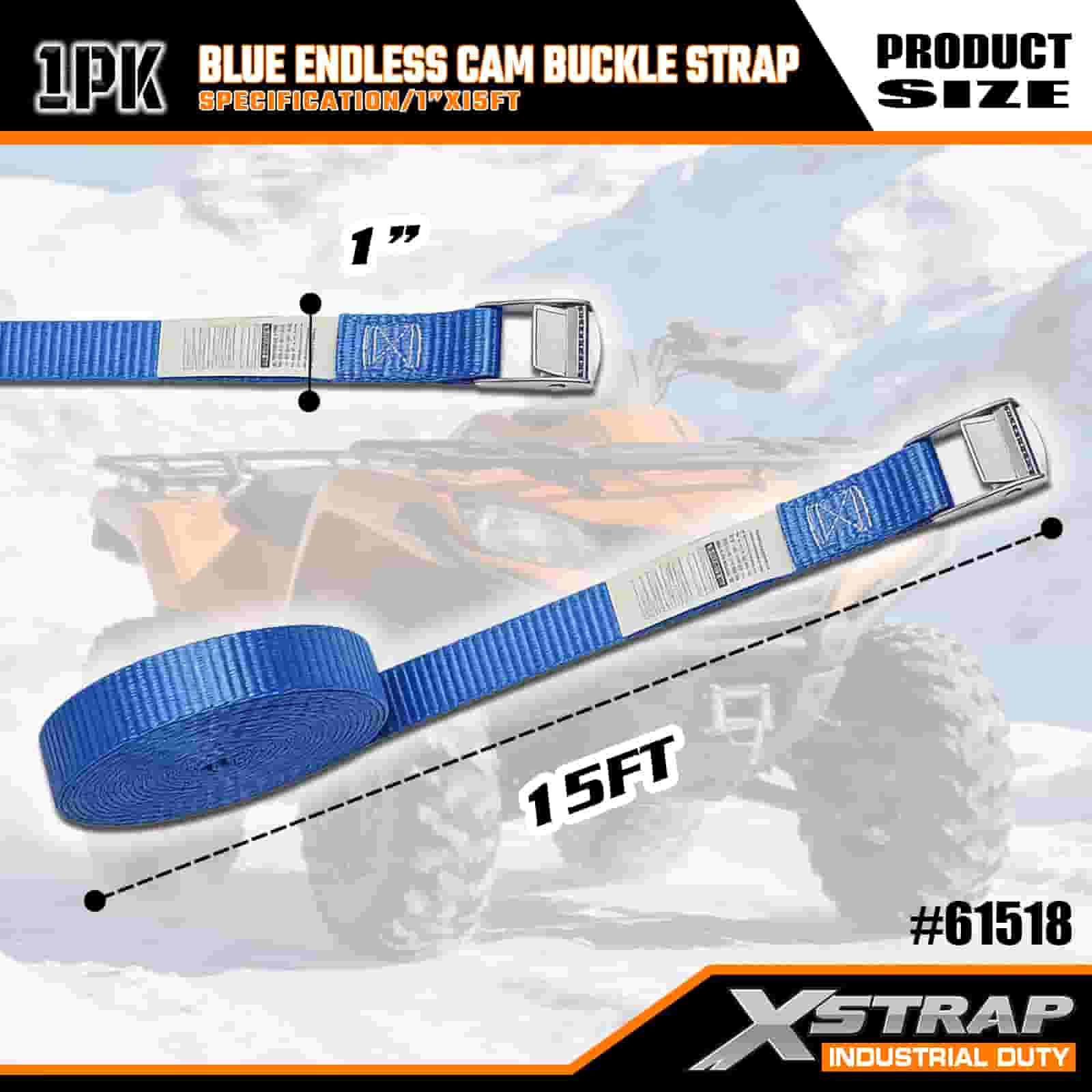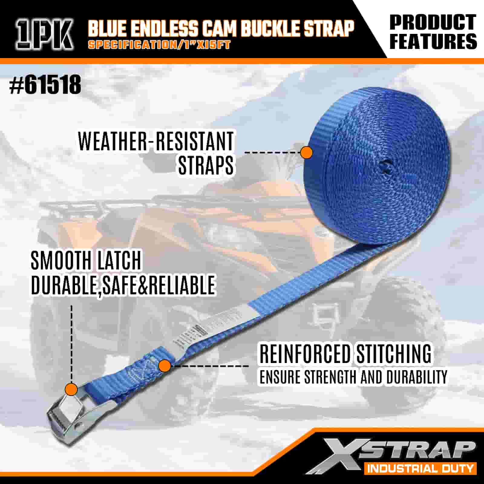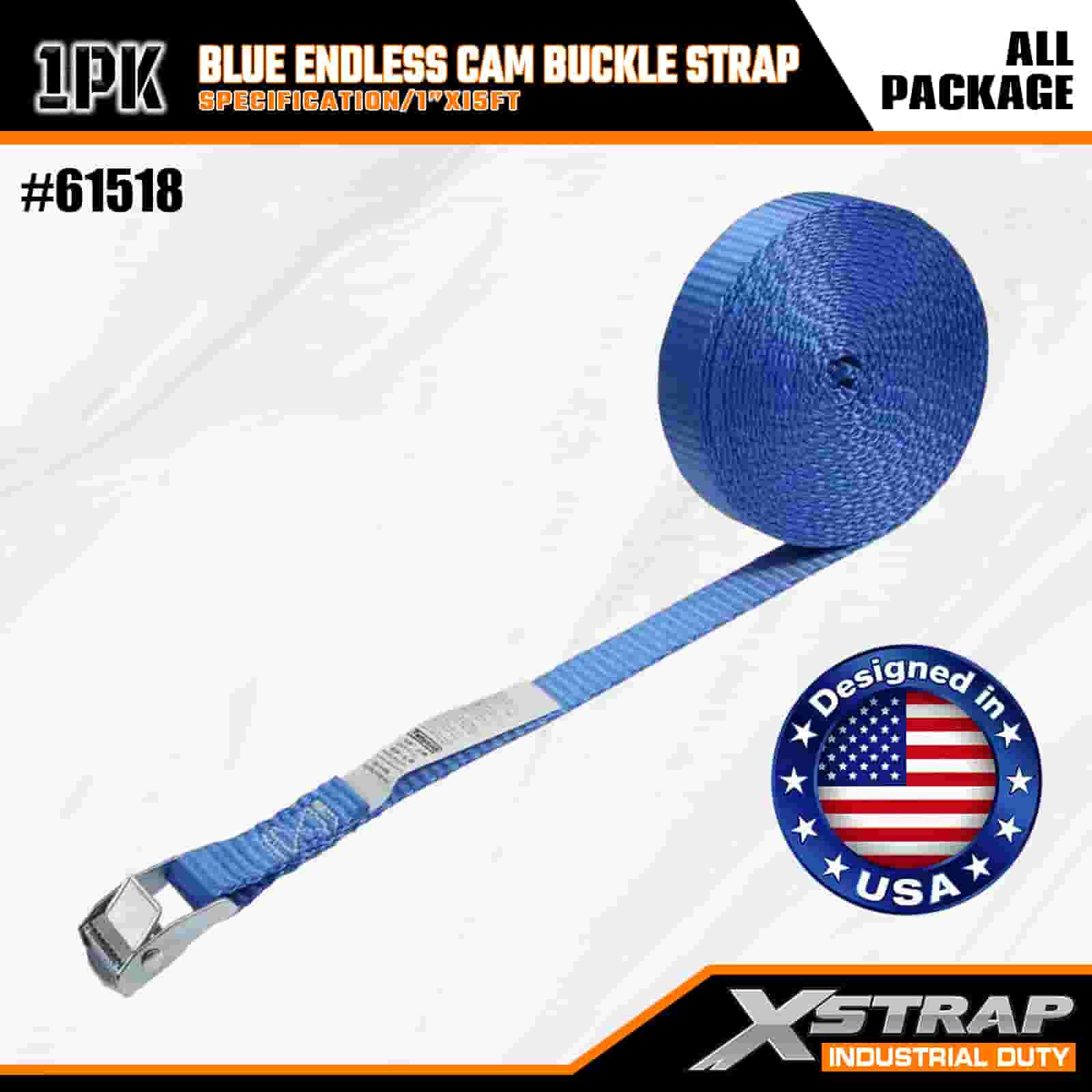 Xstrap Mavi Sonsuz Kam Tokalı Kayış, 1" x 15' Polyester Bağlama Kayışı Çekme Cırcırlı Kayış, Ciddi Profesyoneller için 166 lb Kapasiteli Kargo Bağlama Sabitleme Kayışları Kargo Römorku, Düz Yataklı Römork, Kayak Teknesi, Küçük Araba.