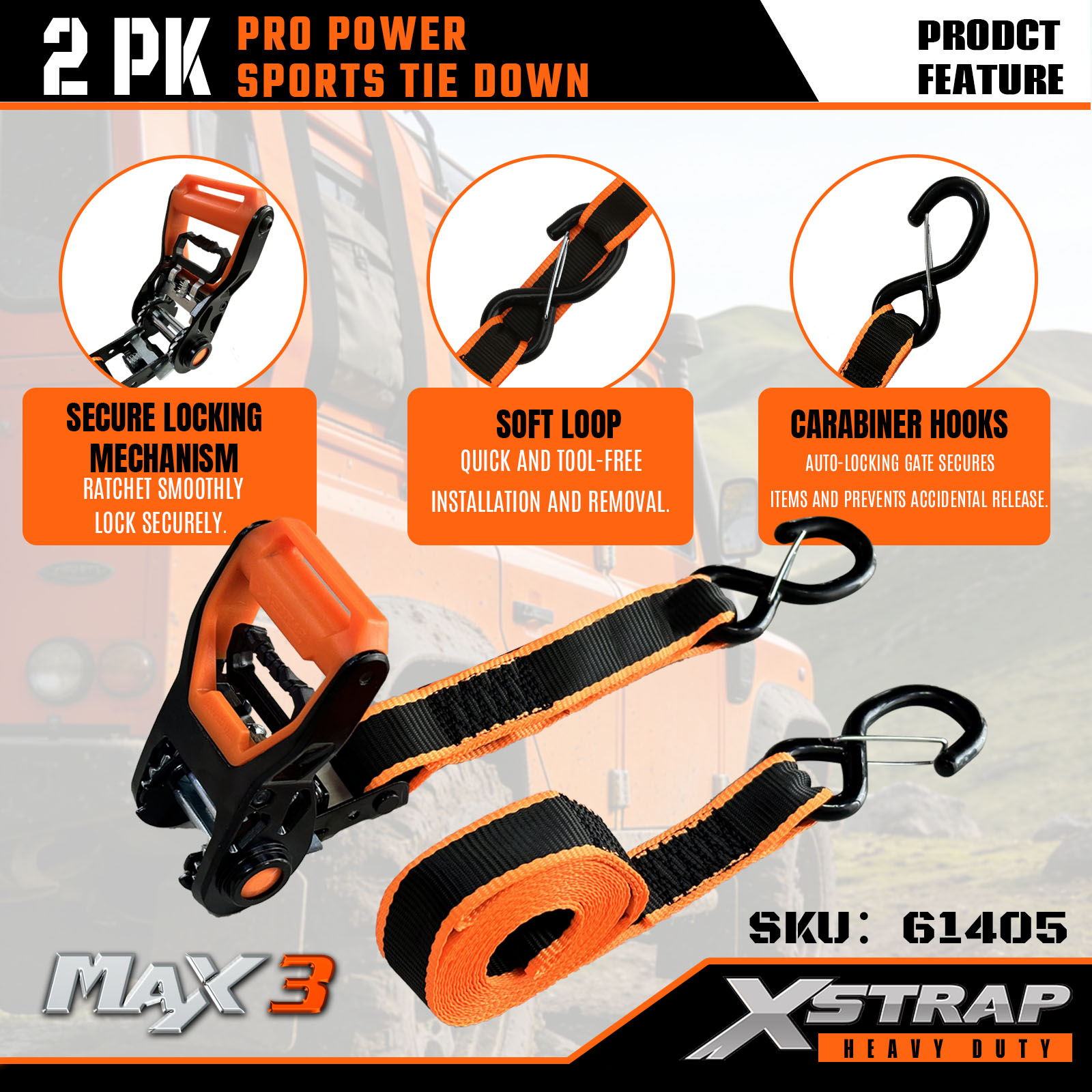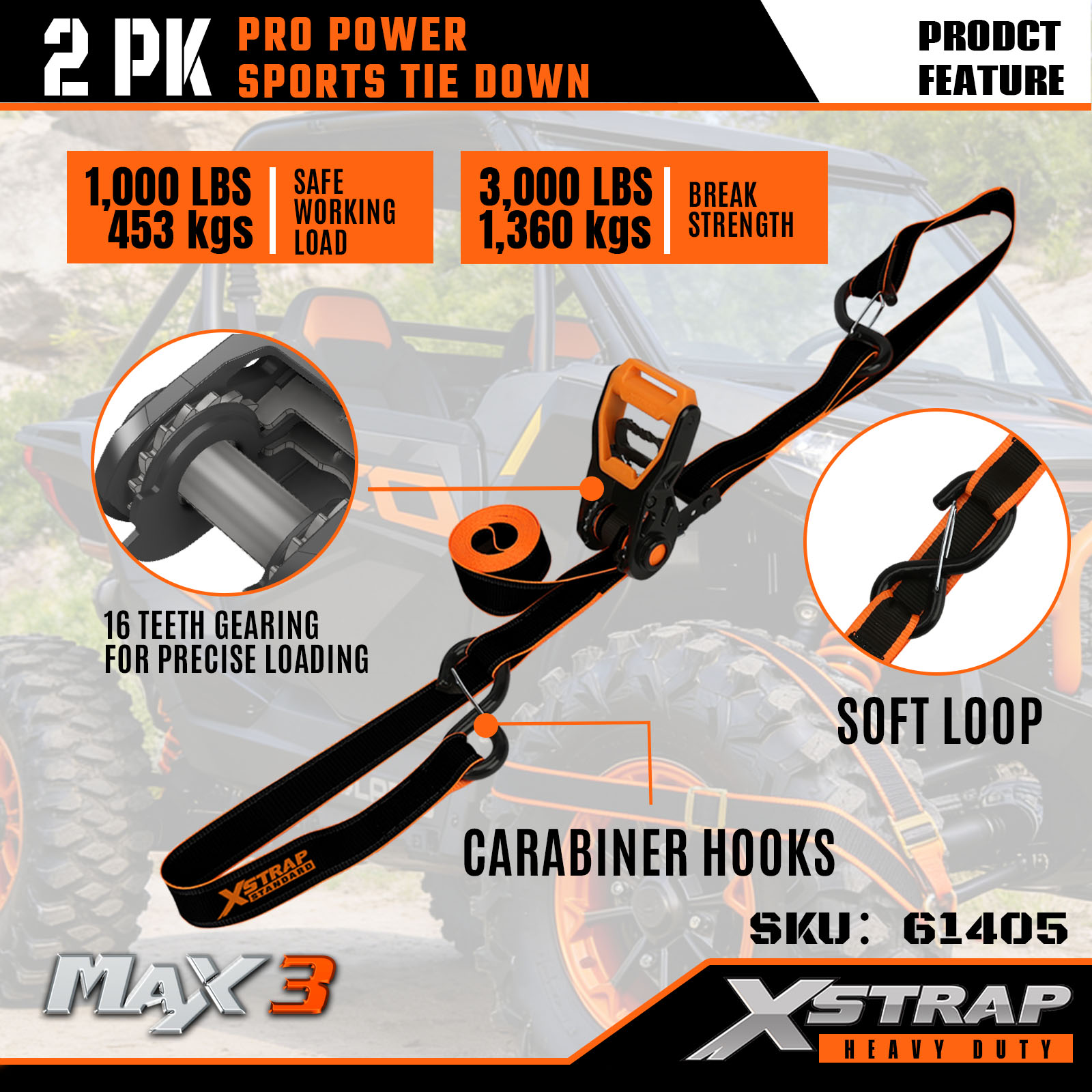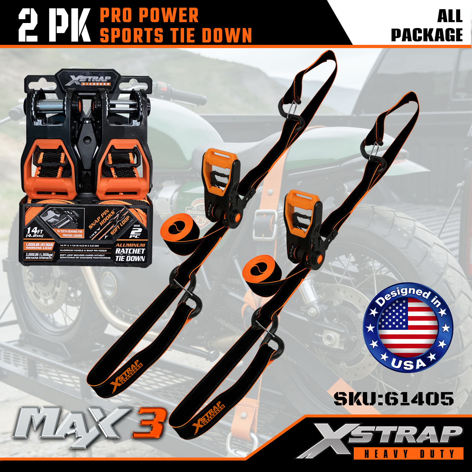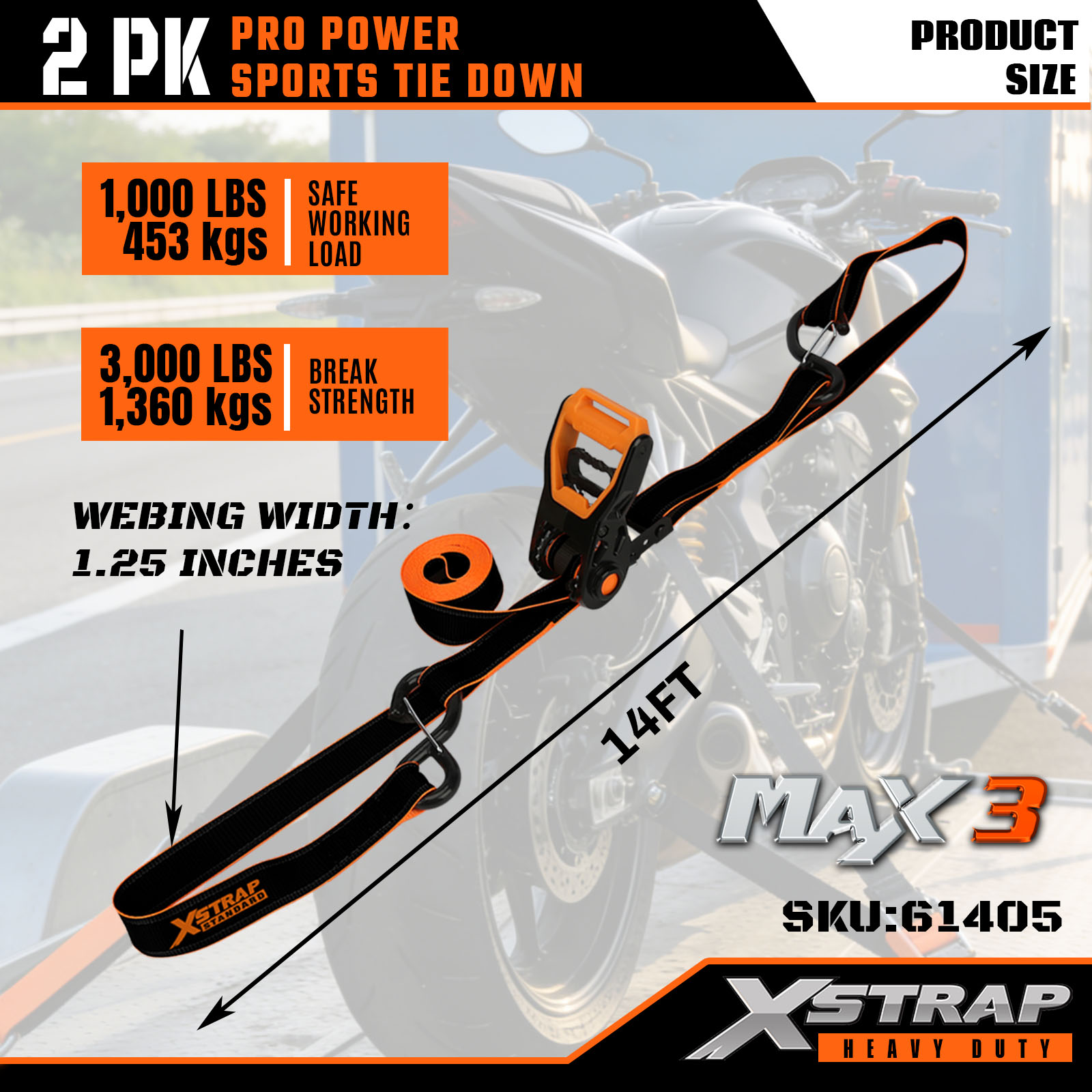 Xstrap 2 Paket PRO Power Spor Bağlama Kayışları, 1-1/4" x 14' Polyester Bağlama Kayışı Çekme Cırcır Kayışı, Kamyon, SUV, Araba Üst Rafları Motosiklet için Karabiner Kancalı 1000 lbs Kapasiteli Kargo Bağlama Sabitleme Kayışları.