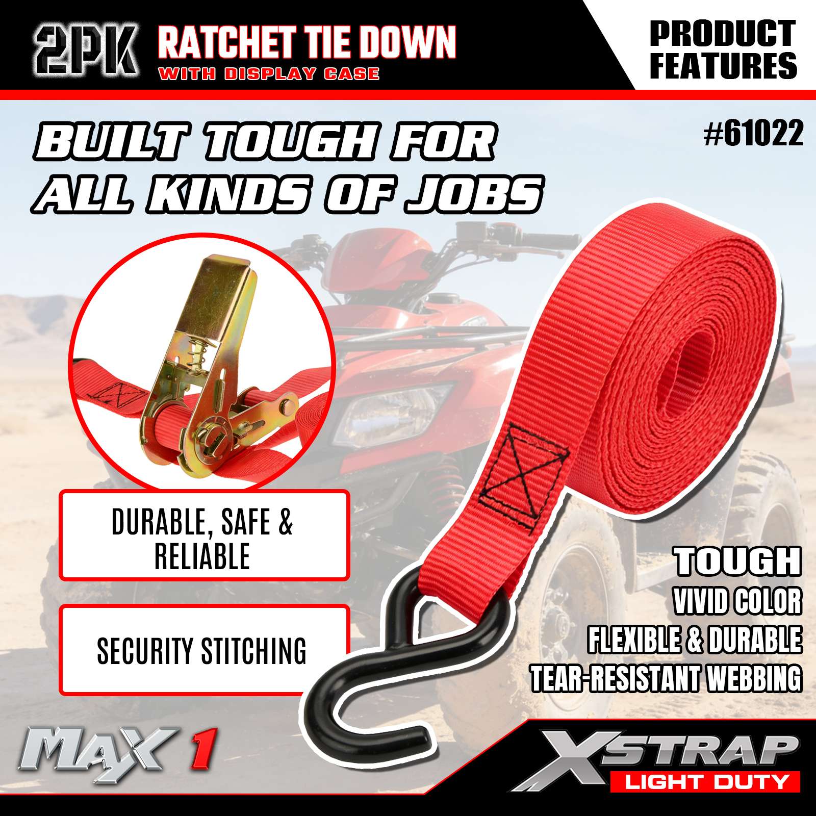 Xstrap 2PK Cırcırlı Bağlama Kayışları 1 inç x 10 ft boyutundadır, güvenli iş yükü 300 lbs ve kopma mukavemeti 900 lbs'dir.