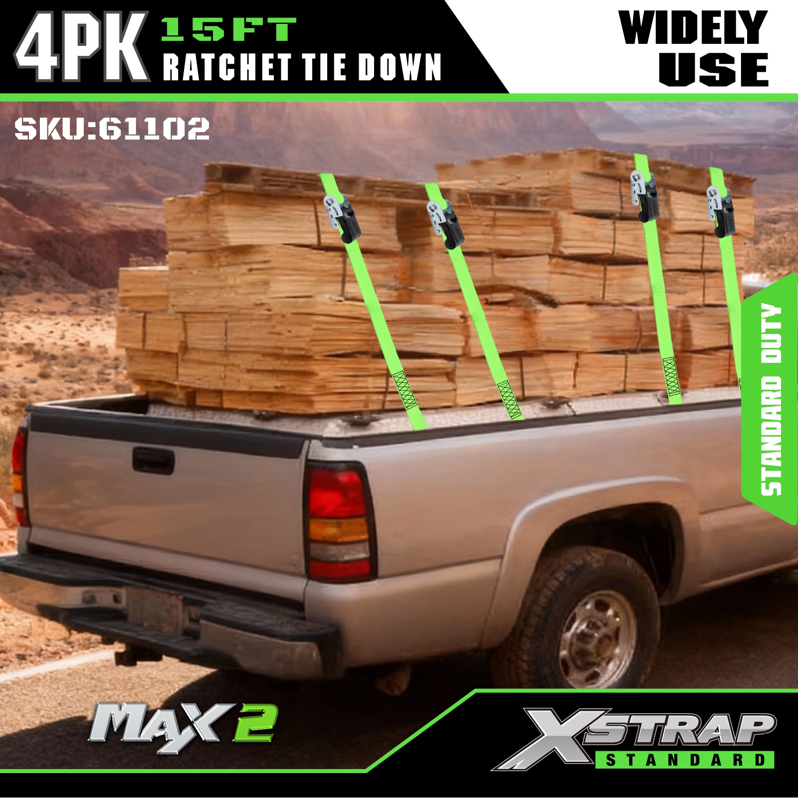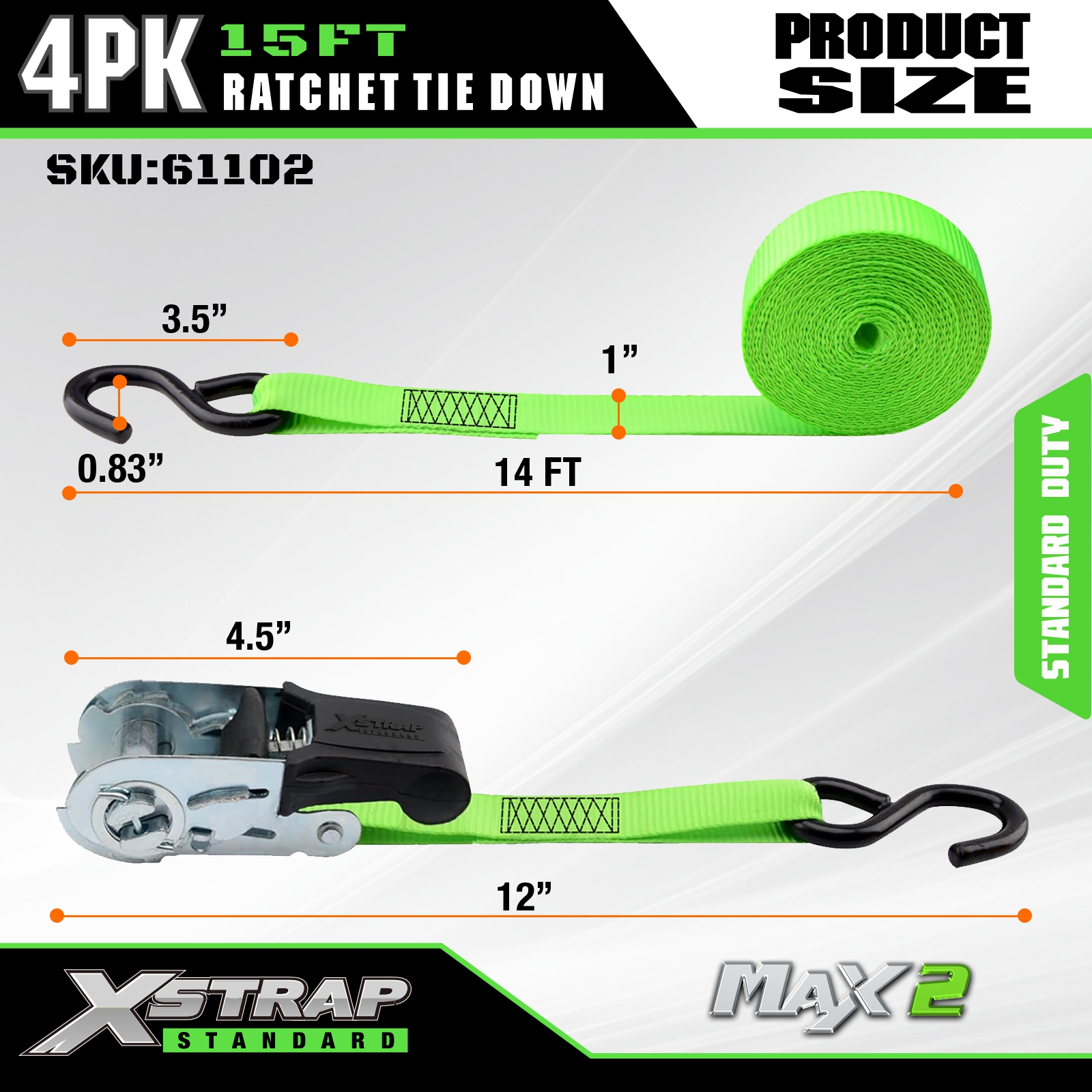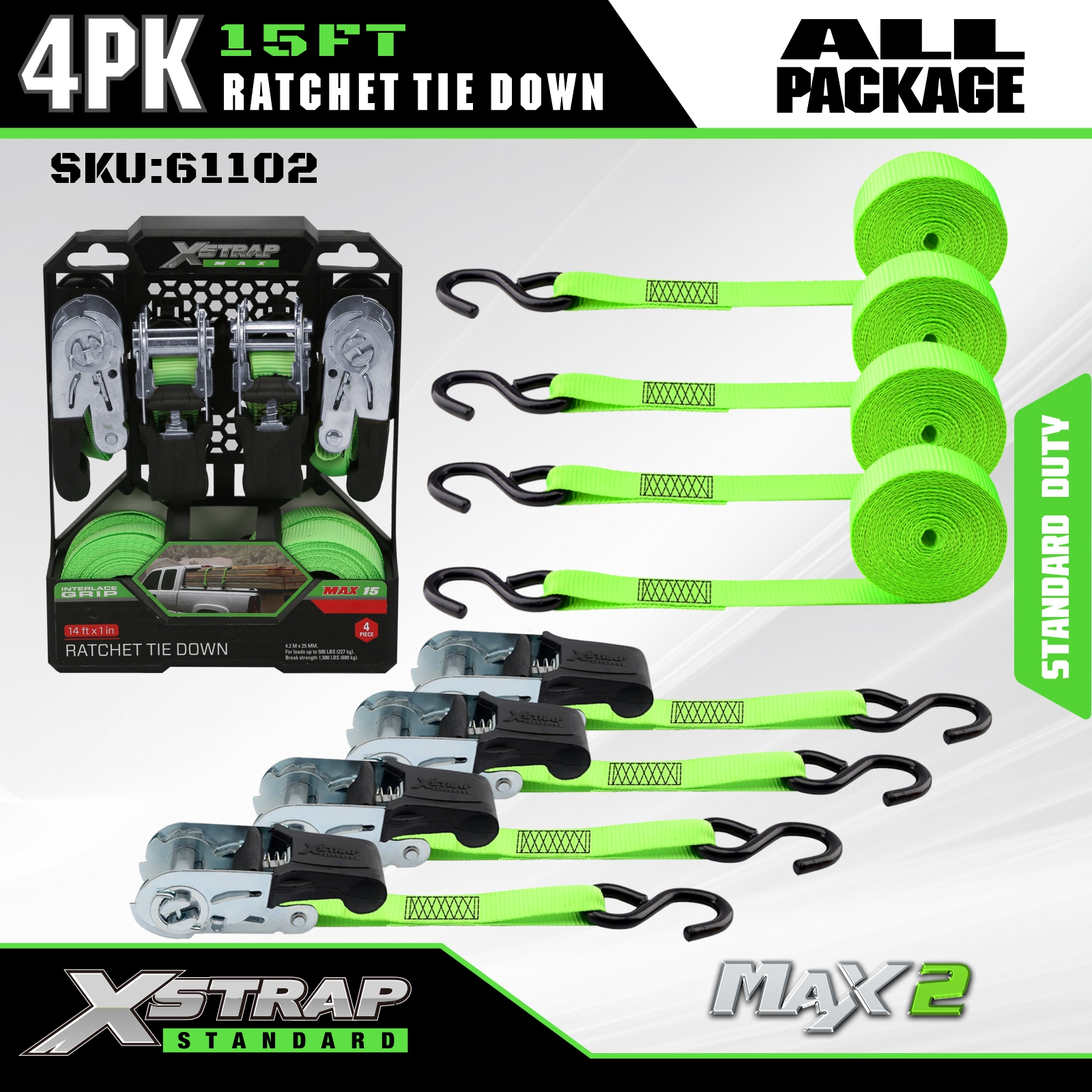 Xstrap Cırcırlı Bağlama Kayışları 4 PK 15Ft - 500 Lbs Yük Kapasitesi 1500 Lbs Kopma Mukavemeti-Hareketli Aletler, Çim Ekipmanları, Motosiklet için Kargo Kayışları.