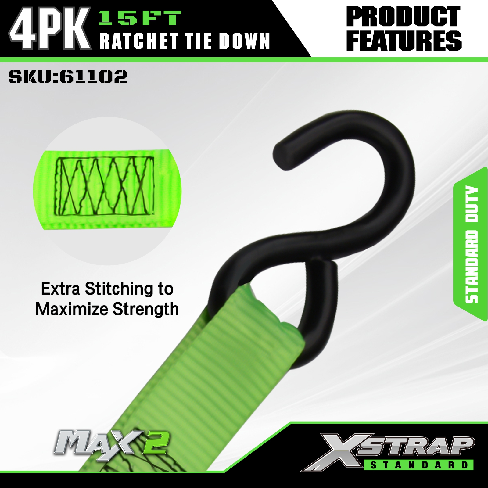 - Koruyucu Kauçuk Kaplamalı S-Kancalar: Kargo ve araç yüzeylerinizin çizilmesini ve hasar görmesini etkili bir şekilde önleyen kauçuk kaplı çelik S-kancalarla donatılmıştır. Hareketli kamyonlarda, UTV'lerde, ATV'lerde, arazi motosikletlerinde, motosikletlerde ve temel kamyon aksesuarlarında yüklerin emniyete alınması için idealdir.