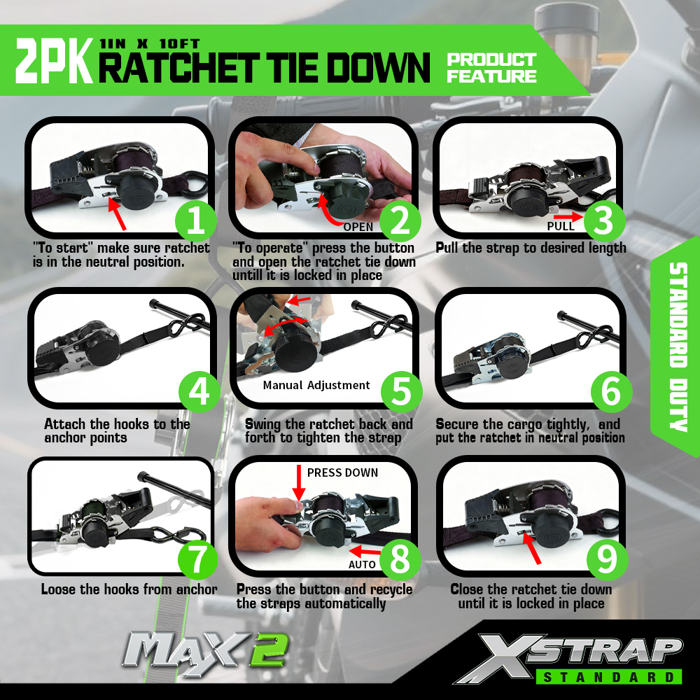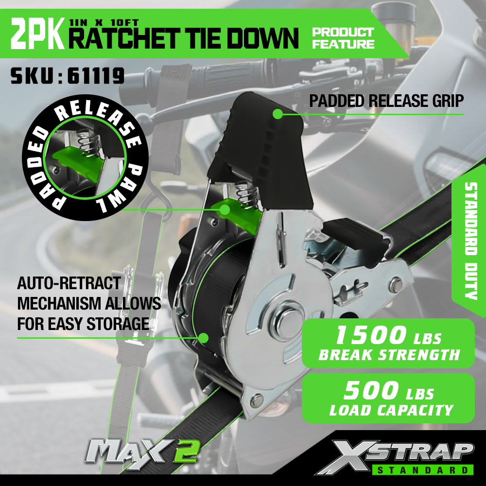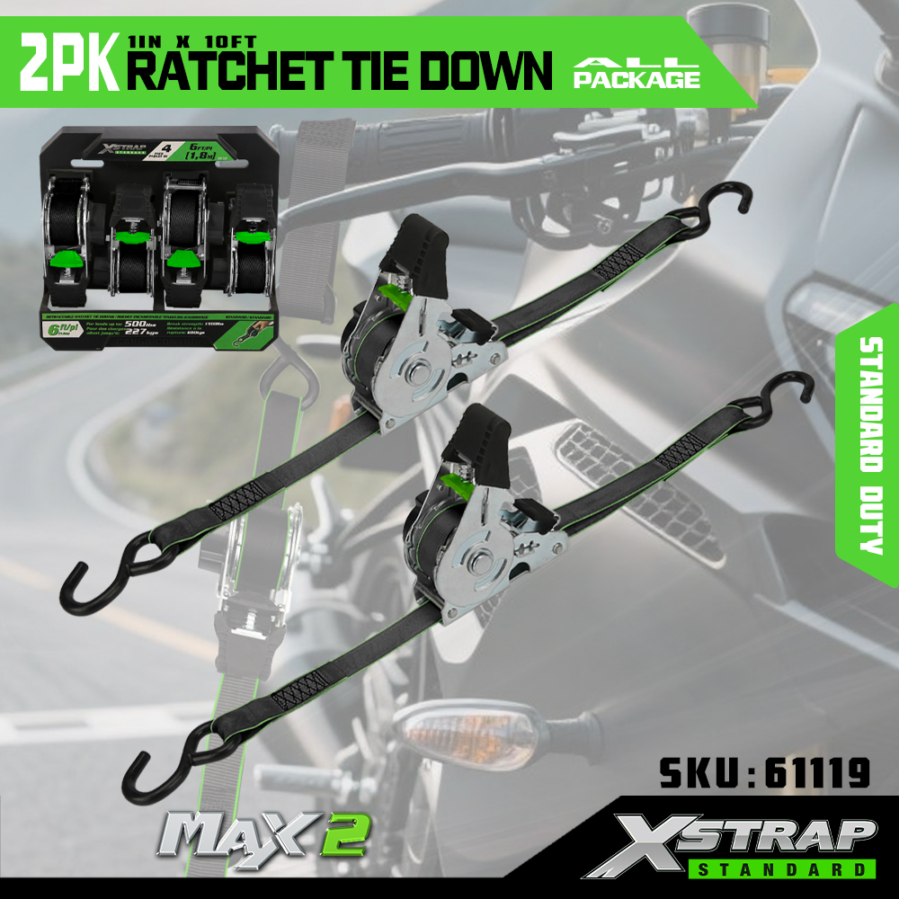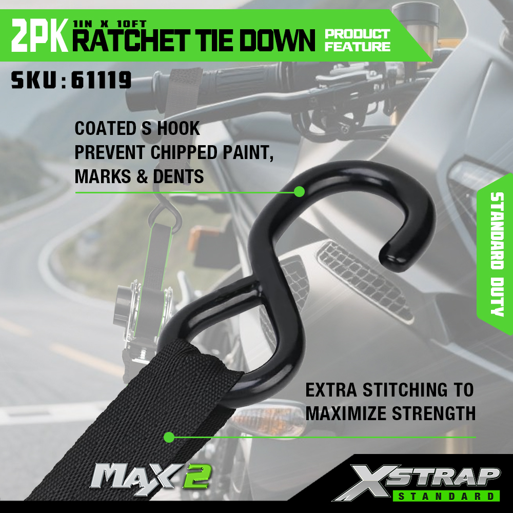 Xstrap 2 Paket Cırcırlı Bağlama, 1" x 10' Polyester Bağlama Kayışı Çekme Cırcır Kayışı, Kamyonet, SUV, Araba Üst Rafları Motosiklet, Hafif Balıkçı Teknesi, Jet Ski, Kar Araci, Çim Traktörü için S Kancalı 500 lbs Kapasiteli Kargo Bağlama Sabitleme Kayışları.