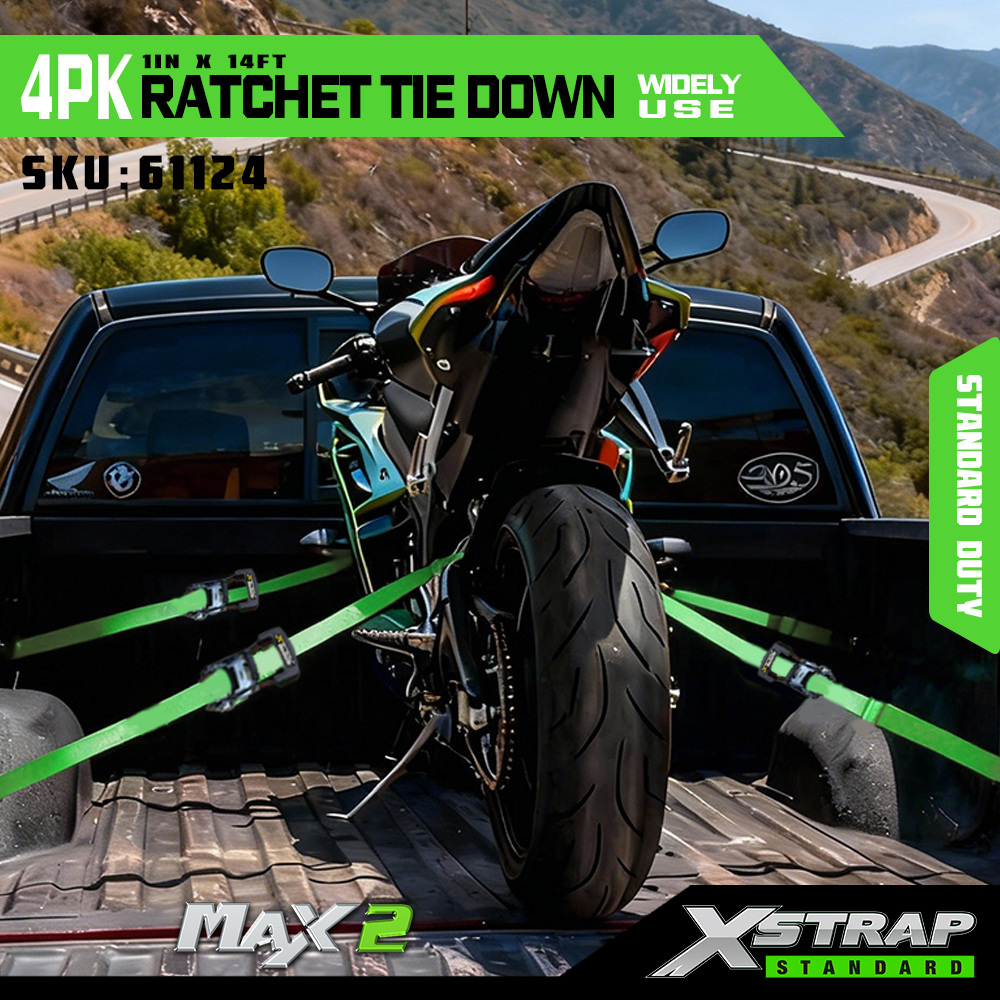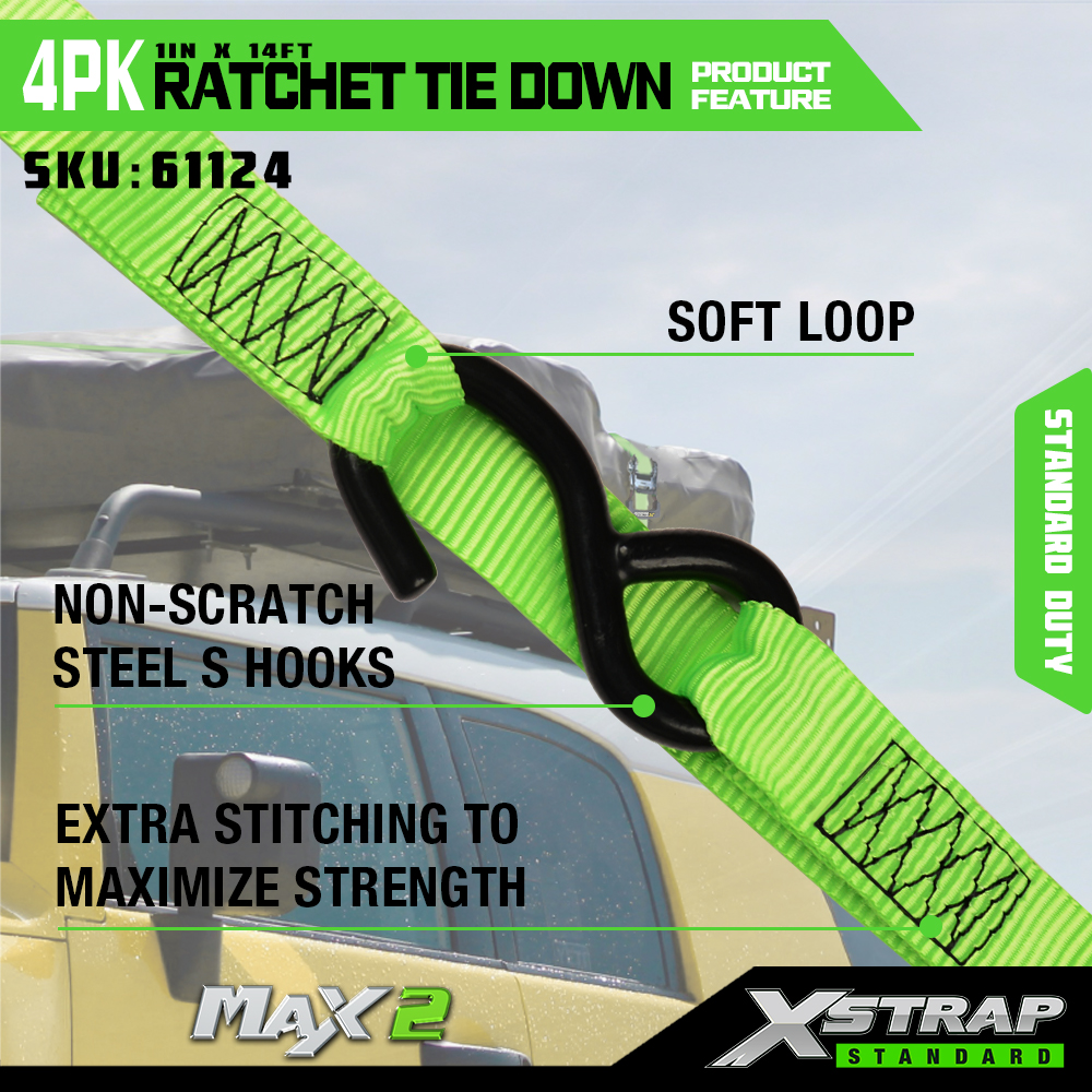 Xstrap 4'lü Paket Bağlamalı Cırcırlı Kayışlar, 1"x 14' Polyester Cırcırlı Bağlama Kayışı, Yumuşak Döngülü, 1500lbs (500lbs) Kapasiteli Kargo Bağlama Sabitleme Kayışları, Kargo, Kamyon, Biçme Makinesi, ATV'ler için Metal mandallı ve S Kancalı.