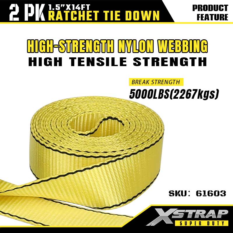 - Yüksek Mukavemetli Naylon Dokuma (5000LBS Kopma Mukavemeti): Yüksek mukavemetli sarı naylon kayışlarla (1,5" genişlik) üretilmiştir — olağanüstü çekme mukavemeti (5000LBS kopma yükü) ve aşınma direnci sağlar, ağır taşıma veya endüstriyel sabitleme görevleri için idealdir.l
