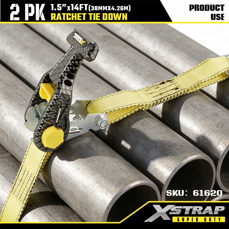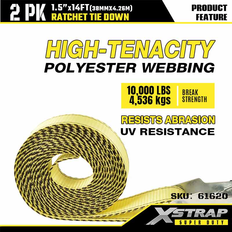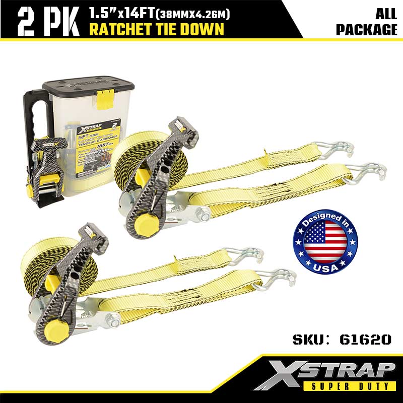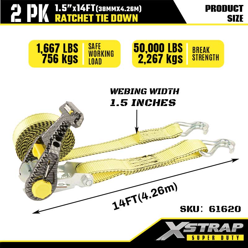 Xstrap 2PK Çift J Kancalı Cırcırlı Bağlama, 1-1/2" x 14' Polyester Bağlama Kayışı Cırcır Kayışı, Ağır Hizmet Römorku, Düz Yataklı Römork Kayak Teknesi, Küçük Araba, Ağır Ekipman için 1667 lbs Kapasiteli Çift J Kancalı Kargo Bağlama Sabitleme Kayışları.